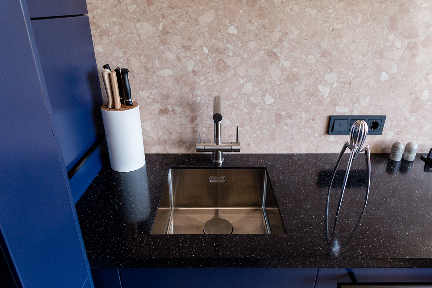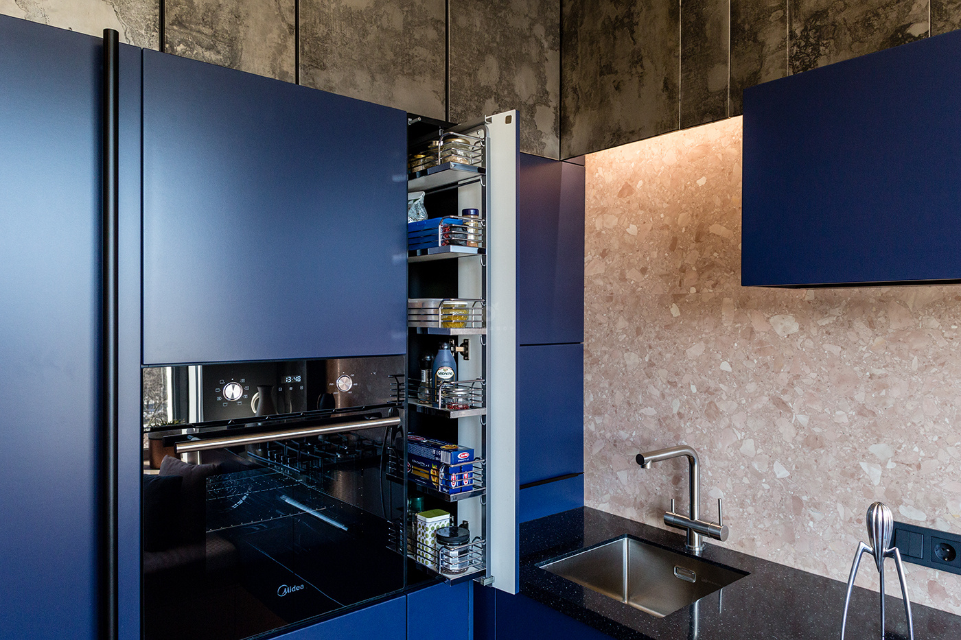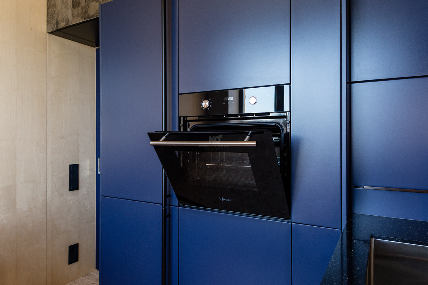 Мы установили в доме Ольги и Даниила угловую кухню «Эмма». Ее фасады из МДФ покрыты экомембраной чарующего цвета Navy. Этот фантастический небесный оттенок великолепно выглядит на фоне декорированных под камень стен. Особый шарм и глубину ему придаёт отсутствие ручек на фасадах. Дизайнеры убрали всё лишнее, оставив место лишь для пронзительной лёгкости и чистоты.