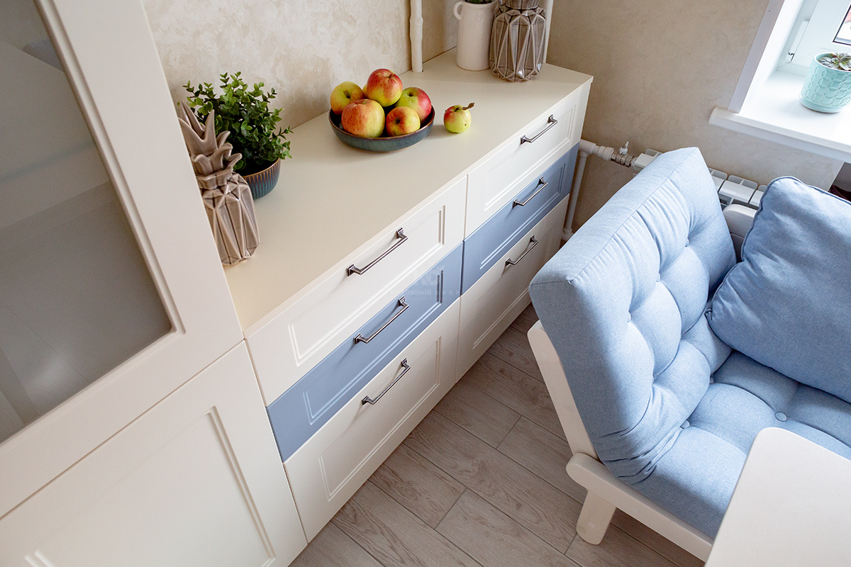 Желания воплотились в «сканди»! Этот стиль прекрасно вписался в длинное, неширокое помещение, наполнив его удивительной атмосферой нежного уюта! А всё благодаря безупречно подобранным цветам и грамотной компоновке модулей. Молочный и голубой оттенки сделали «Эрику» светлой и просторной. А трёхъярусная компоновка модулей дала хозяевам максимум удобства и полезного пространства.