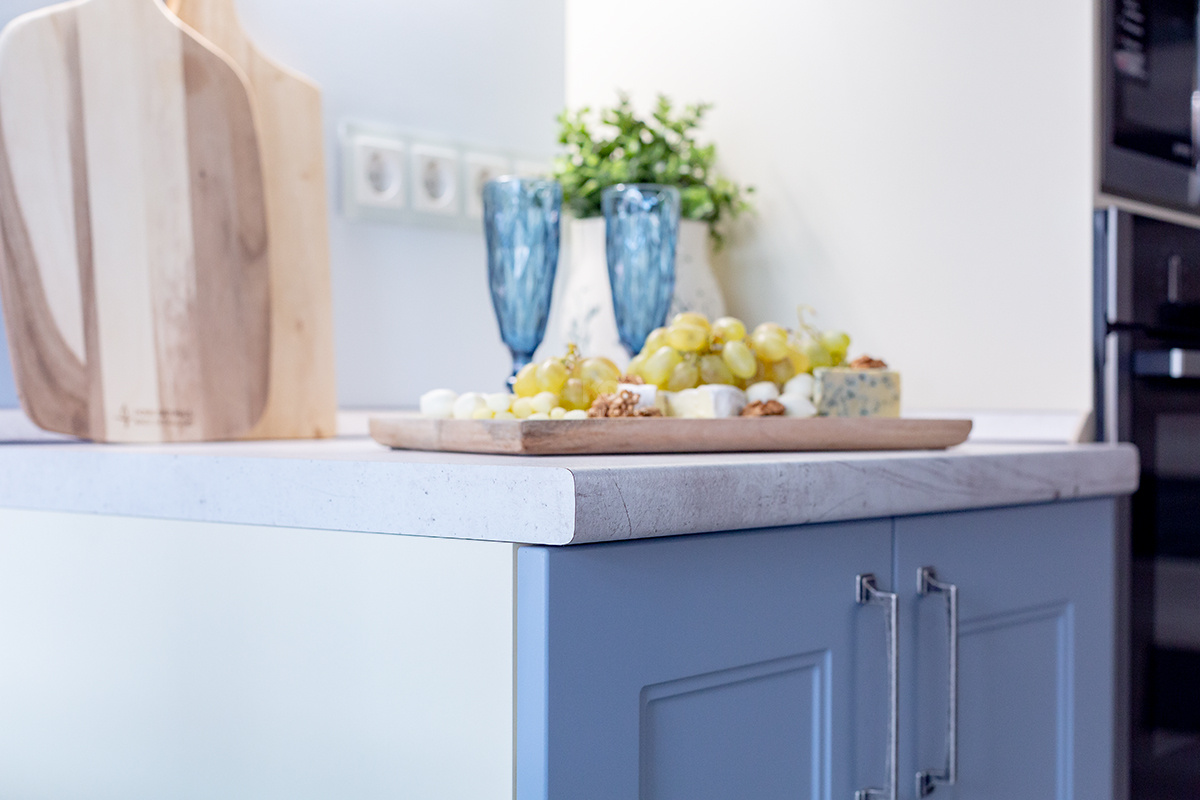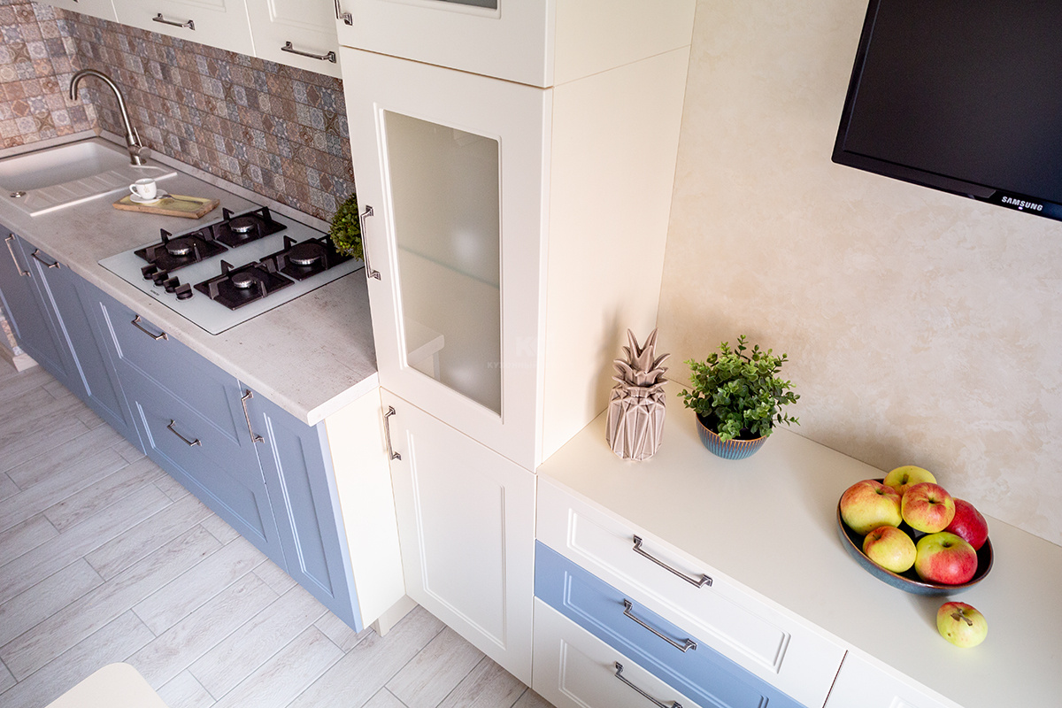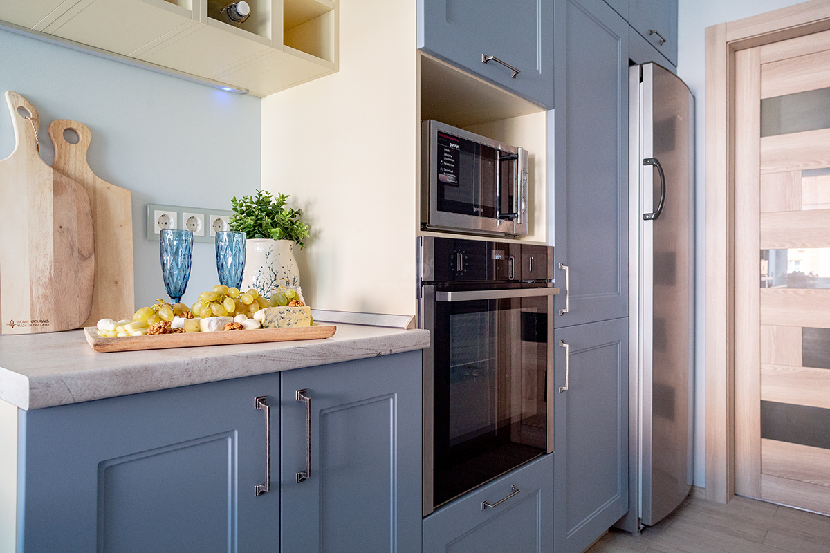 «Эрика» легка, нежна и заботлива. В ней удачно скомбинированы глухие фасады, модули с матовыми витражами и открытые зоны. Каждый элемент спроектирован с оглядкой на предпочтения хозяев. Так, глава семьи увлекается виноделием. Специально для него мы создали стильную и компактную винотеку прямо над столешницей. Приготовить вкусное блюдо и подать его с подходящим вином? «Эрика» всегда «за»!