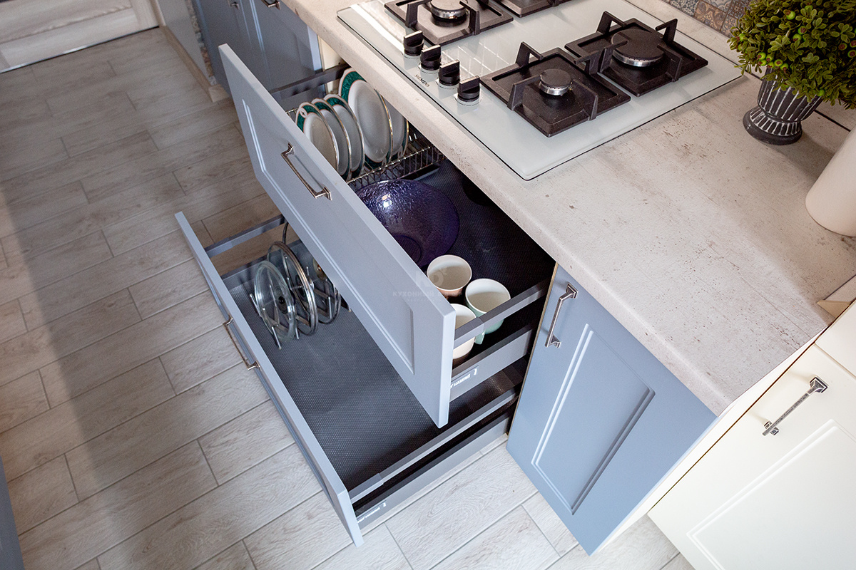 Обращаем Ваше внимание, что цена за погонный метр включает в себя: фасады выбранной категории, влагостойкую столешницу HPL (Германия) высокой прочности, корпуса ЛДСП Egger (Германия) с кромкой ABS, ящики с доводчиками , петли с доводчиками, ручки, алюминиевый поддон в стол под мойку, сушка (Италия), цоколь Volpato (Италия). Из расчета в размере 2400 мм.