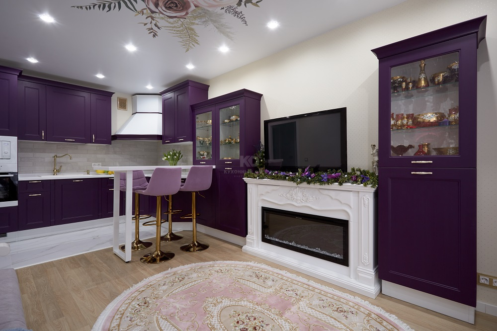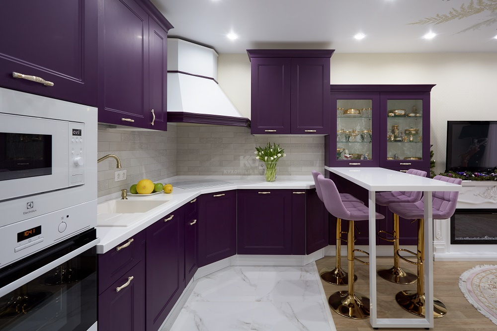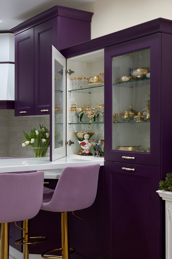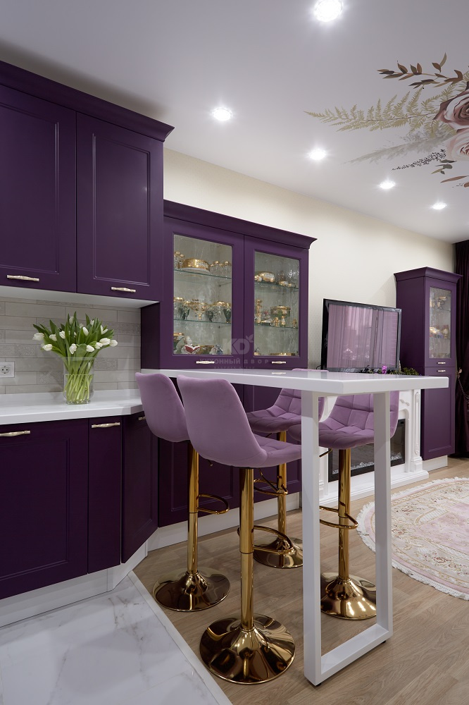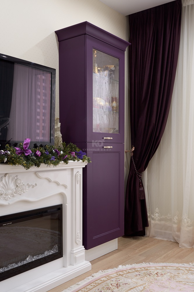 Эта кухня филигранно вписана в помещение и имеет продуманную архитектуру. Так, в угловой части столешница имеет форму трапеции. Это позволило дизайнерам создать идеальное место под варочную панель с полноценным вместительным шкафом под ней. Также кухня оснащена стильной барной стойкой и несколькими застеклёнными буфетами. Несколько буфетов находится уже в зоне гостиной. Они, словно пара величественных колонн, обрамляют TV-зону, в которой находится ещё и роскошный электрокамин! «Эрика» гармонично дополняет другие элементы интерьера, наполняя его изысканным благородством.