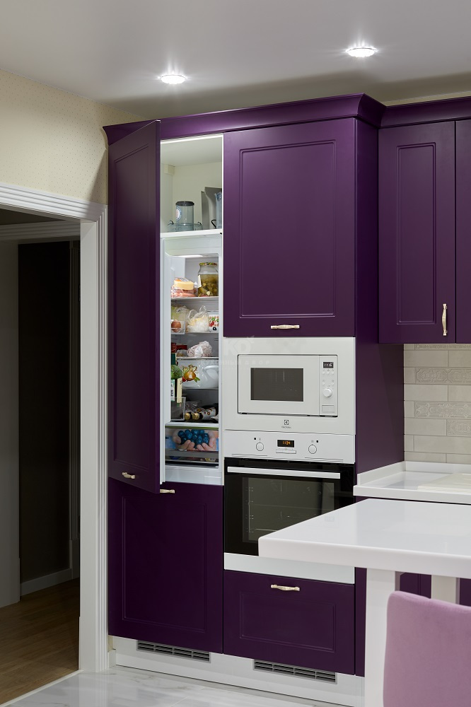 С первого взгляда видно, что классические интерьеры – родная стихия для «Эрики». Величественные шкафы верхнего яруса здесь увенчаны элегантными карнизами, массивная трапециевидная вытяжка имеет стильный бандаж, а на фасадах из МДФ присутствуют изящные ручки и прямоугольная фрезеровка. Фасады, к слову, имеют «дышащее» покрытие – экомембрану, которая обеспечивает надёжную защиту и надолго сохраняет первозданный насыщенный цвет. Добавив ко всей этой красоте ультрасовременное техническое оснащение, мы получили не просто кухню, а восхитительный образец неоклассического стиля!