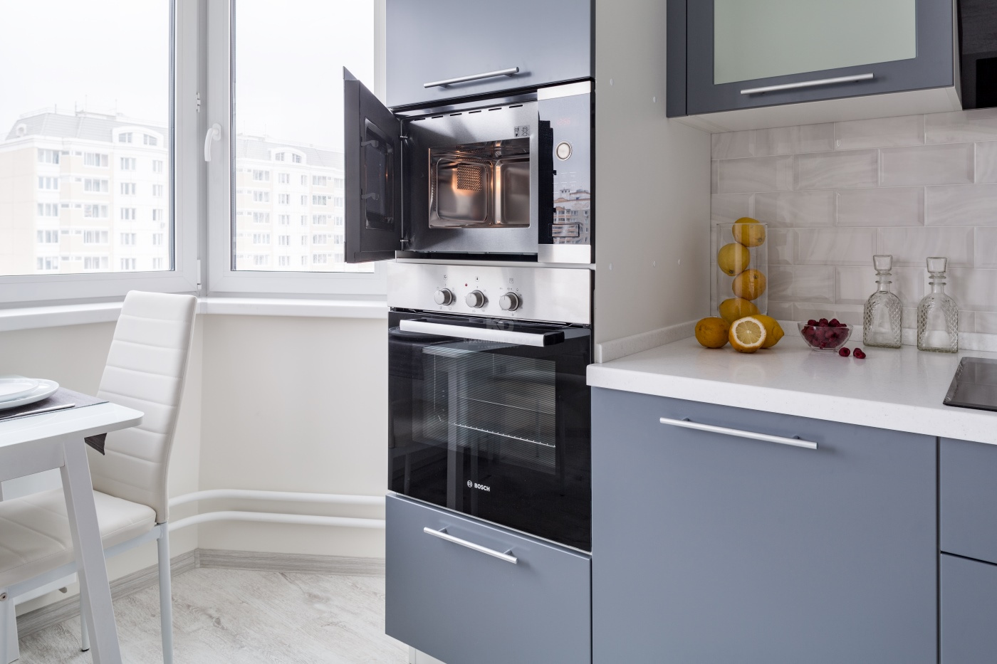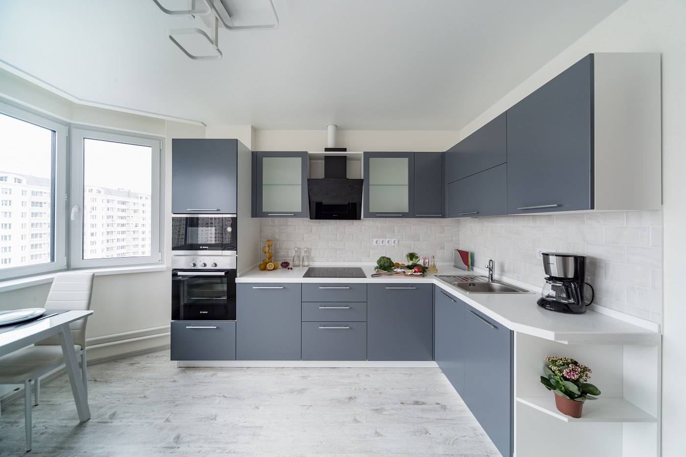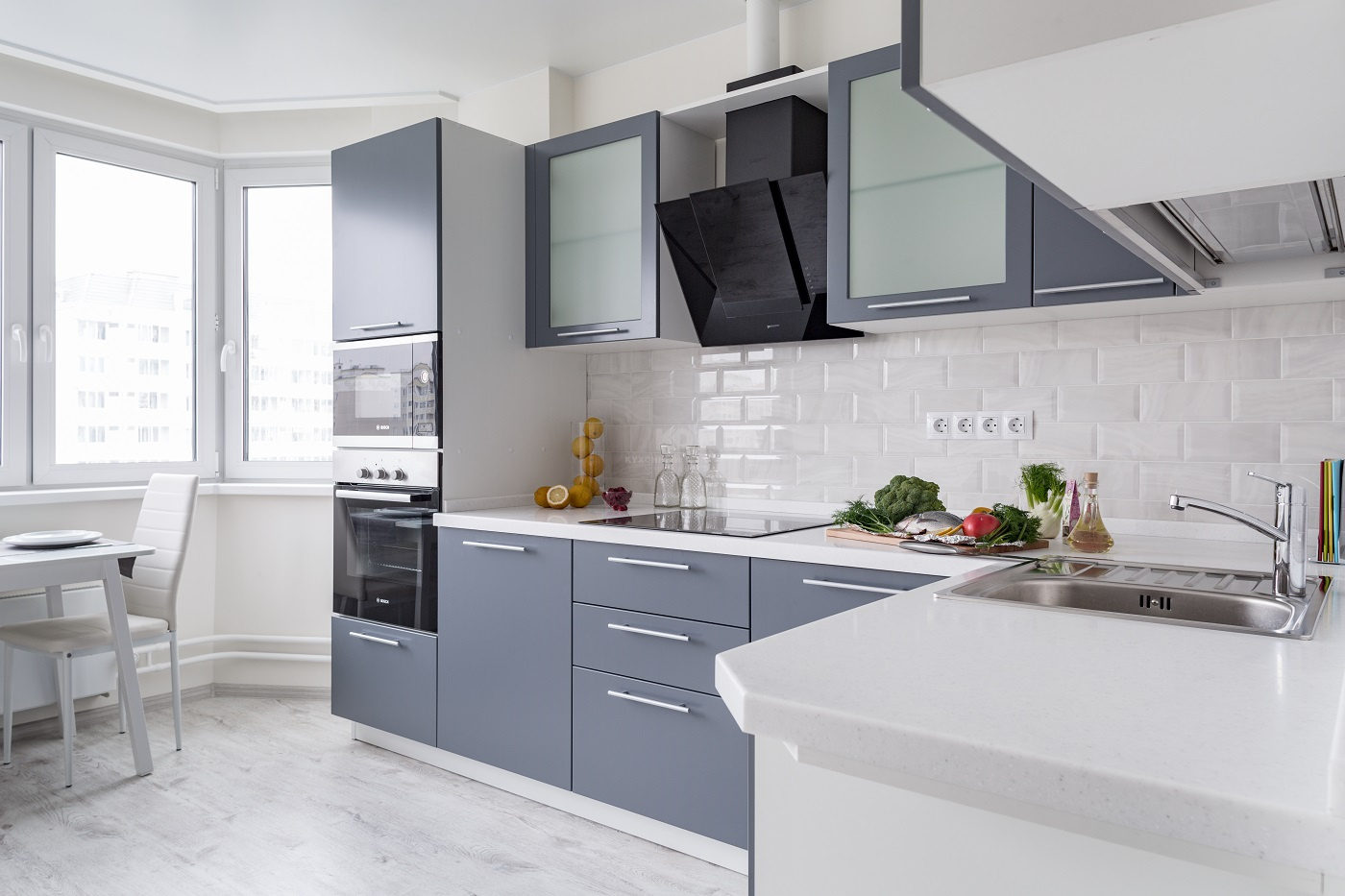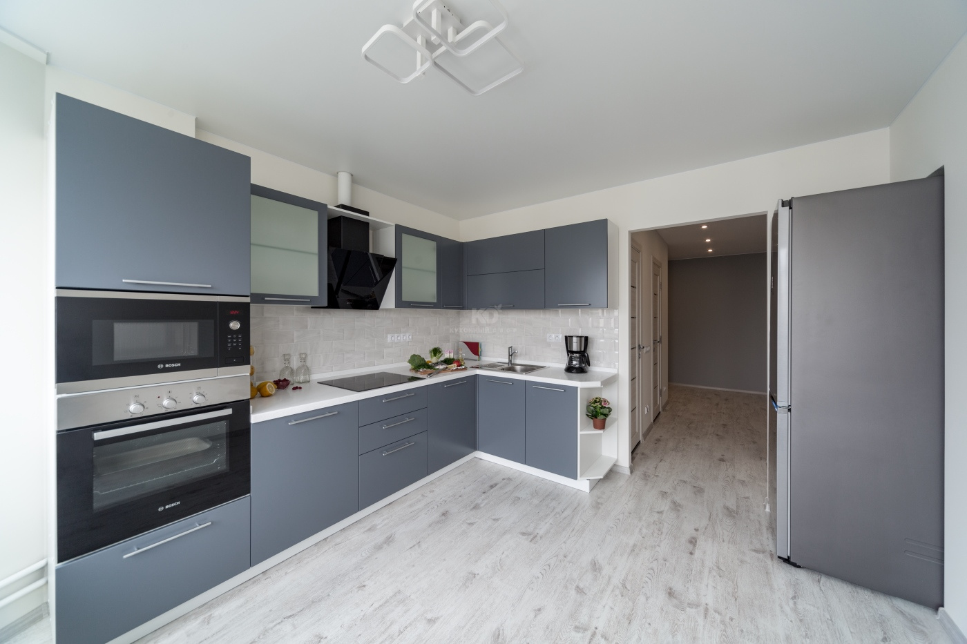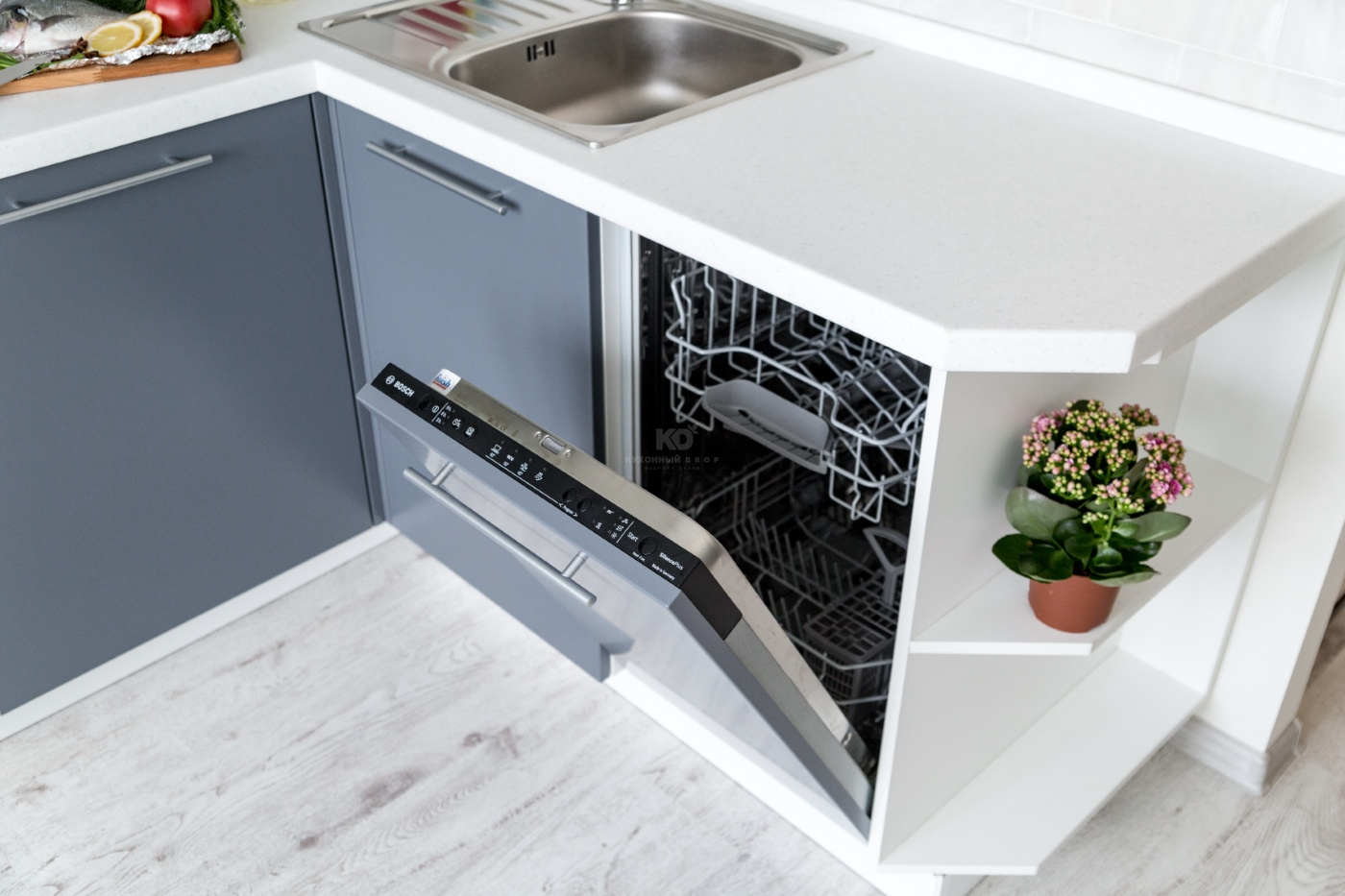 Модель "Фаворит" была выбрана не случайно: дизайн кухни соответствует представлениям молодых о современном мире: динамичном и подвижном. Модель минималистична - глухие фасады выполнены из высококлассного MDF. Удобные и вместительные шкафы оснащены всем необходимым для поддержания идеального порядка, в том числе и встроенной посудомоечной машиной. Отдельный отсек занимает духовой шкаф и микроволновая печь - в правильном питании без них никуда!