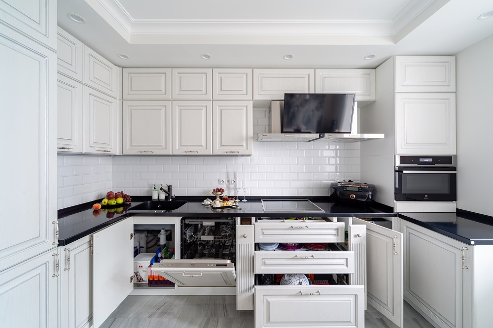 Соответствует ли безукоризненной внешности внутреннее наполнение? С компанией «Кухонный Двор» иначе и быть не может! Мы оснастили «Катарину» встроенным холодильником, посудомоечной машиной, современной варочной панелью, а также духовкой, совмещенной с СВЧ. В дополнение к первоклассной технике были добавлены удобные аксессуары и системы хранения. А одной из самых любопытных особенностей модели стала мощная спаренная вытяжка. Семья Ежовых обожает готовить блюда в мультиварке, и такая вытяжка – лучшее решение для защиты их «Катарины» от горячего пара. Мы создали кухню, в которой учли все пожелания и привычки счастливых хозяев. Уверены, она долгое время будет радовать их своим совершенством!