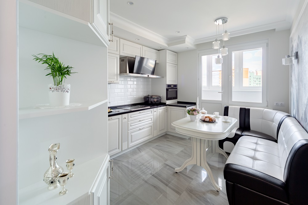 На внешности хочется остановиться отдельно. Контраст чёрного и белого очень к лицу «Катарине». Светлые фасады делают ее облик утонченным, а чёрная каменная столешница добавляет этой утончённости благородства. Еще более выразительной «Катарину» делают изящные металлические ручки и роскошная серебристая патина. С помощью патинорования дизайнеры «KD-Lab» сделали дополнительный акцент на классической прямоугольной фрезеровке и лишний раз подчеркнули красоту фасадов.