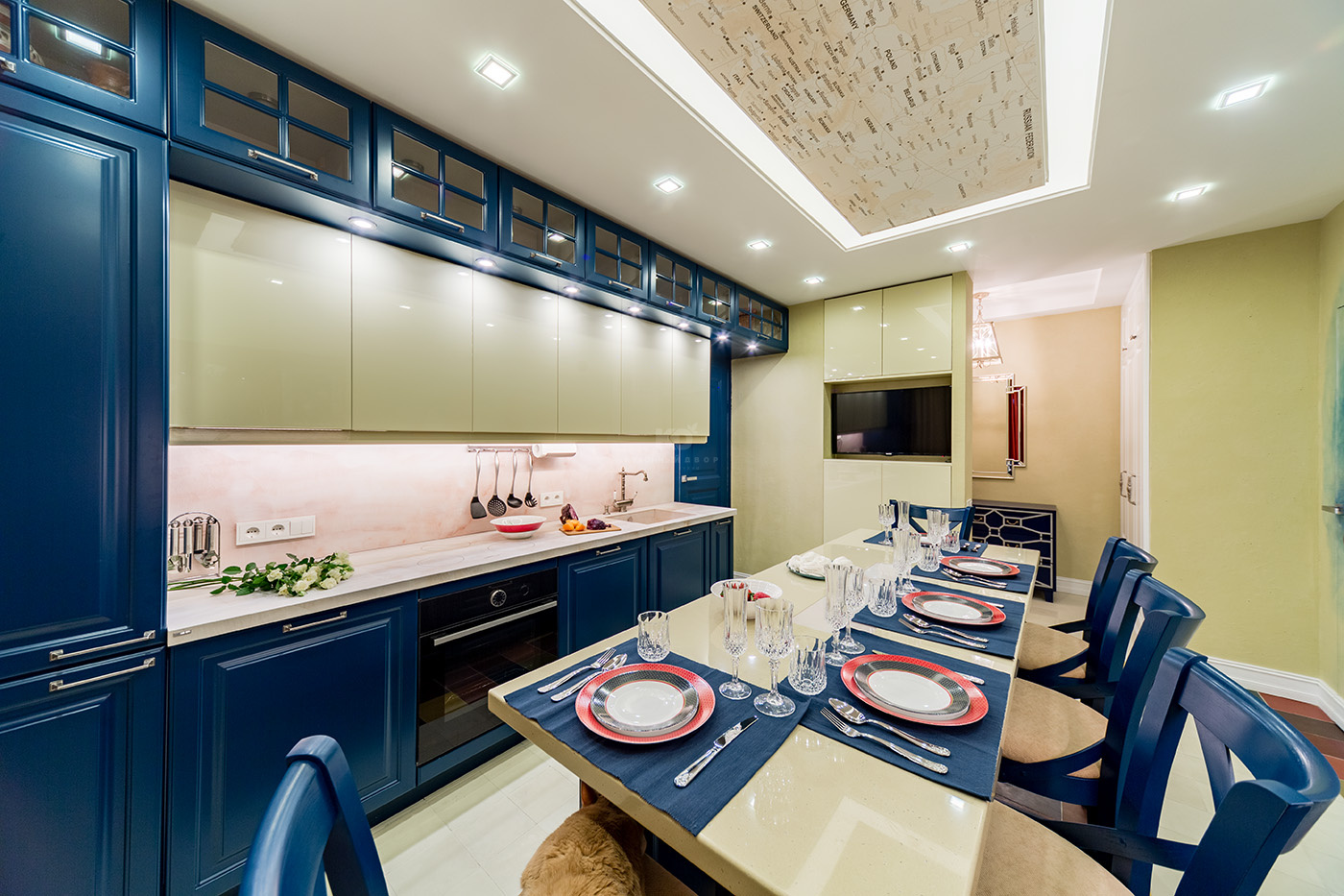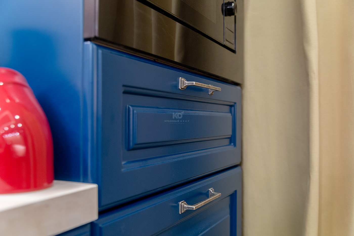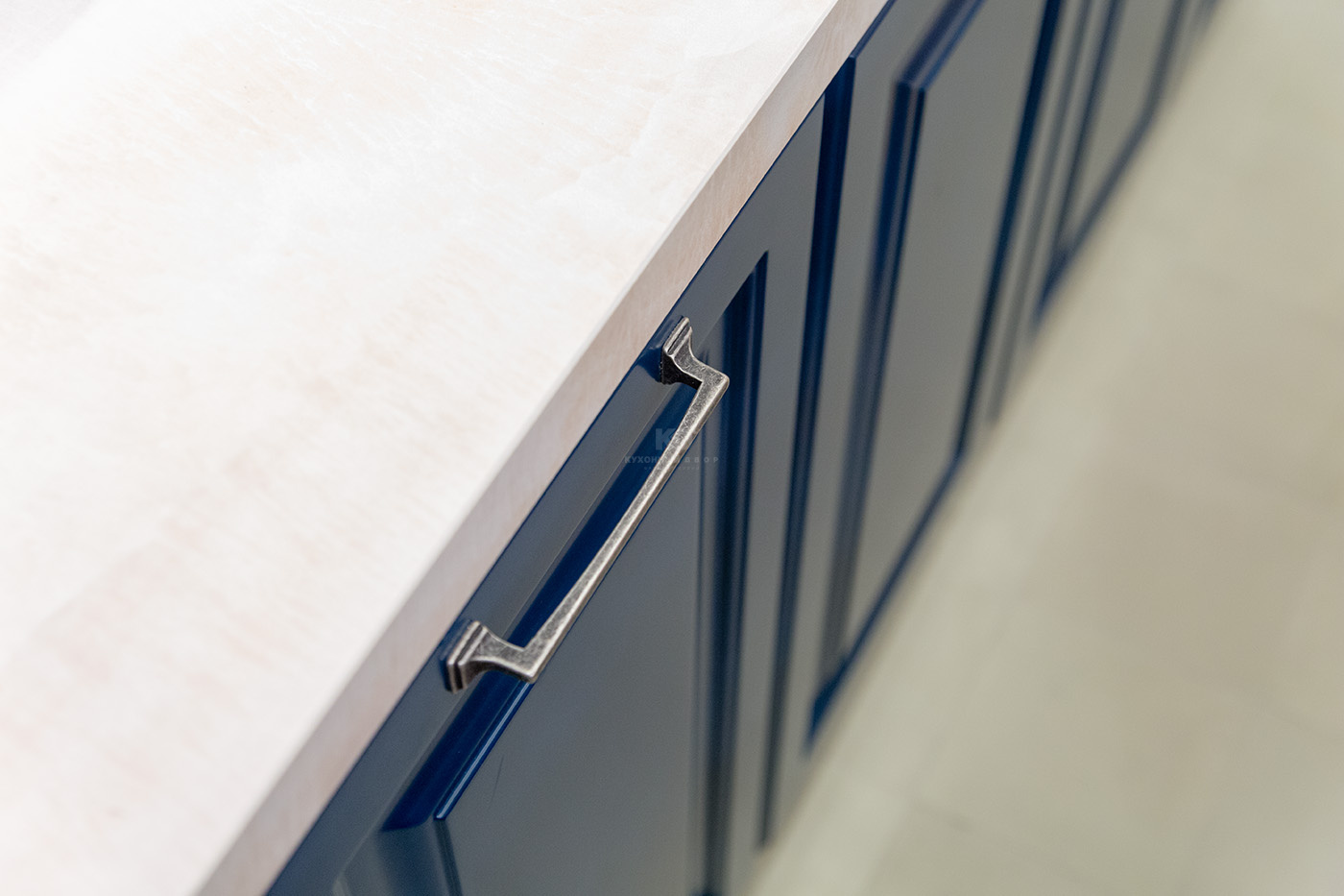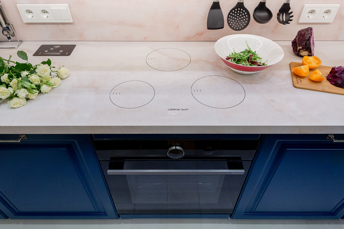 Получите, распишитесь! Новый гарнитур выглядит благородно, но, вместе с тем, нежно и по-домашнему. Этого удалось достичь благодаря удачному подбору цветовой палитры фасадов из MDF. Мы выбрали небесно-синий и нежно-бежевый. Гармонию этих тонов поддержала столешница из керамогранита кремового оттенка. Варочная панель и мойка были интегрированы прямо в нее, благодаря чему образ «Катарины» остался «воздушным».
