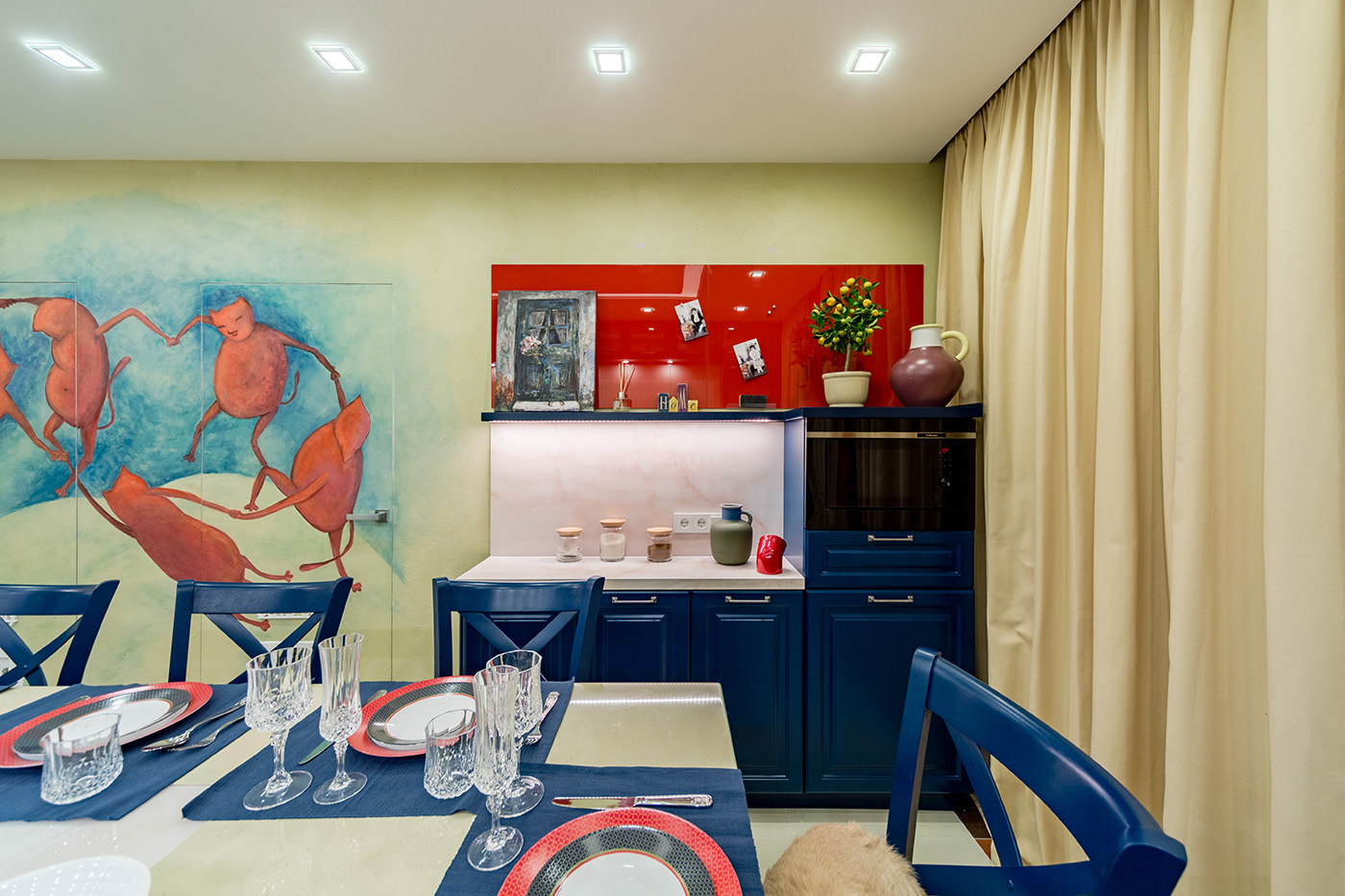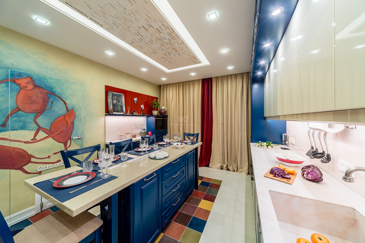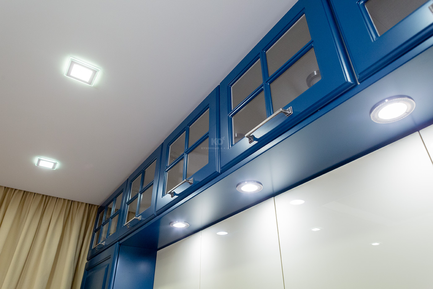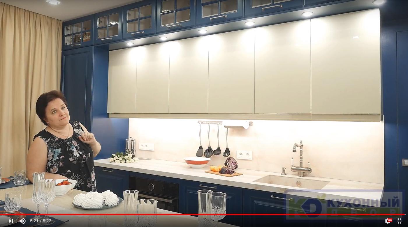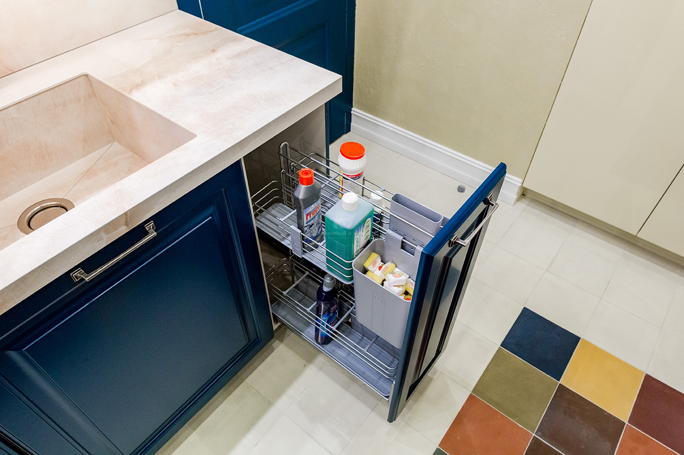 Получите, распишитесь! Новый гарнитур выглядит благородно, но, вместе с тем, нежно и по-домашнему. Этого удалось достичь благодаря удачному подбору цветовой палитры фасадов из MDF. Мы выбрали небесно-синий и нежно-бежевый. Гармонию этих тонов поддержала столешница из керамогранита кремового оттенка. Варочная панель и мойка были интегрированы прямо в нее, благодаря чему образ «Катарины» остался «воздушным».