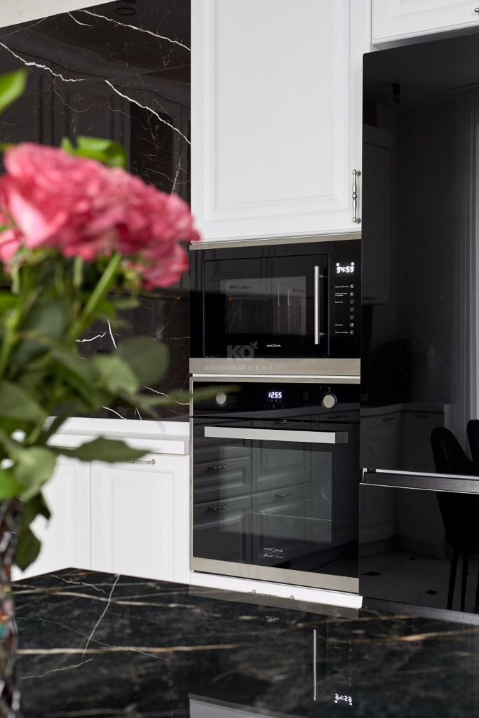 Поздравить есть за что, ведь кухня красивая и комфортабельная. А ещё яркая! Да-да, хоть фасады здесь и белые, в яркости всего образа нет никаких сомнений. Вписывая «Катарину» в интерьер, дизайнеры сделали ставку на классический цветовой контраст. Кухня ярко выделяется на фоне тёмной техники, обеденной зоны, фартука и элементов освещения. При этом белизна её фасадов, цоколей и карнизов расширяет и без того просторное помещение.
