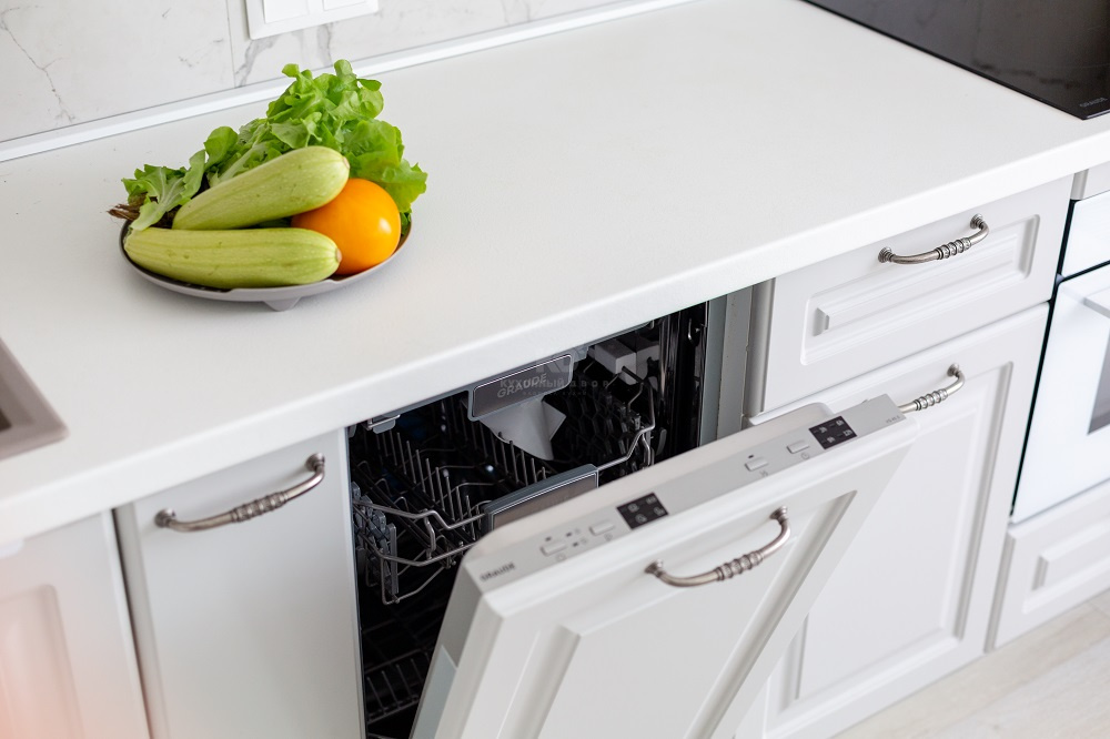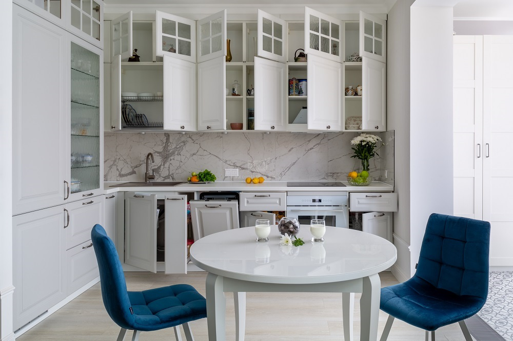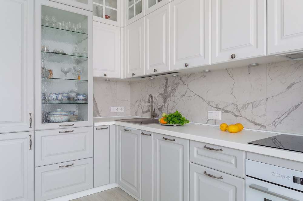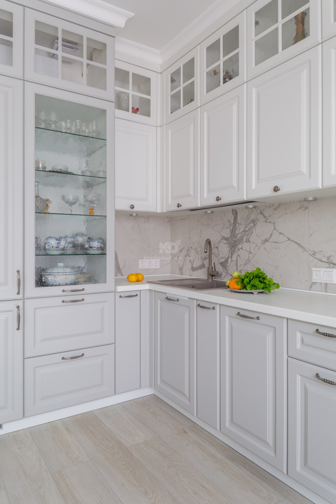 Ритмику фрезеровки здесь подхватывают и застеклённые фасады антресолей с прямоугольной раскладкой. Они украшают кухню словно прекрасный венец. Наличие стёкол позволяет использовать верхний ярус как своеобразную «витрину», где размещен декор и красивая посуда. А для посуды, которая используется часто, в «Катарине» предусмотрен высокий шкаф с матированным стеклом. Он расположен в очень удобном месте – между зоной мойки и встроенным холодильником.