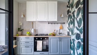 Фасады этой «Катарины» созданы из МДФ с покрытием-экомембраной и выполнены в двух цветах – белом и нежно-голубом. Оттенки вызывают ассоциацию с весенним небом и облаками, а дополнительный природный штрих в эту картину добавляет HPL-столешница под светлое дерево. Лёгкий контраст в полученный образ вносят лаконичные чёрные ручки. В итоге классическую кухню удалось прекрасно вписать в современный интерьер, пронизанный нотками эко-стиля.