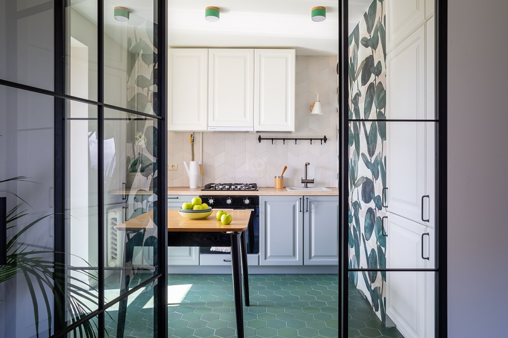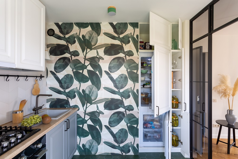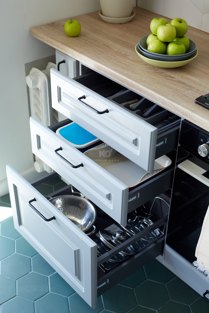 «Катарина» выглядит удивительно легко ещё и благодаря грамотному зонированию. Так, встроенный холодильник и высокий пенал здесь расположены отдельно и «утоплены» в стену. Такое решение значительно экономит место и при этом предоставляет хозяйке массу внутреннего пространства для хранения продуктов. В итоге «Катарина», сохранив фирменную «воздушность», получилась невероятно вместительной.