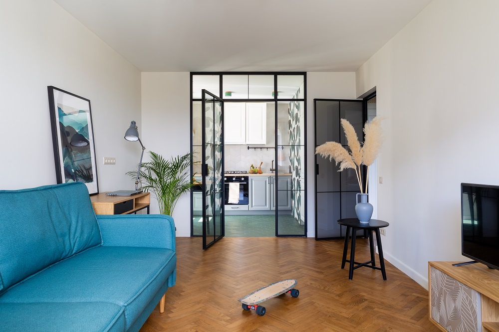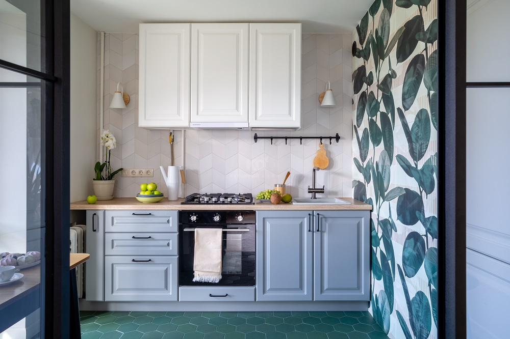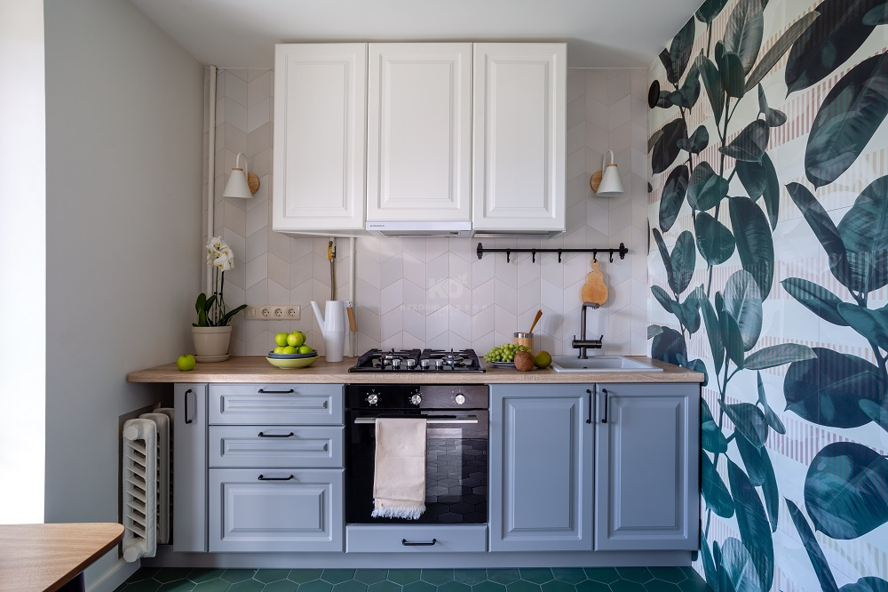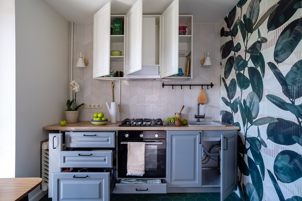 Фасады этой «Катарины» созданы из МДФ с покрытием-экомембраной и выполнены в двух цветах – белом и нежно-голубом. Оттенки вызывают ассоциацию с весенним небом и облаками, а дополнительный природный штрих в эту картину добавляет HPL-столешница под светлое дерево. Лёгкий контраст в полученный образ вносят лаконичные чёрные ручки. В итоге классическую кухню удалось прекрасно вписать в современный интерьер, пронизанный нотками эко-стиля.