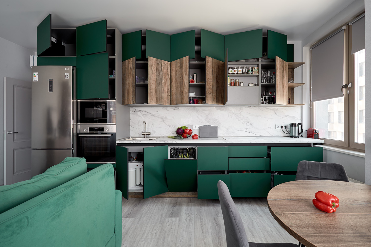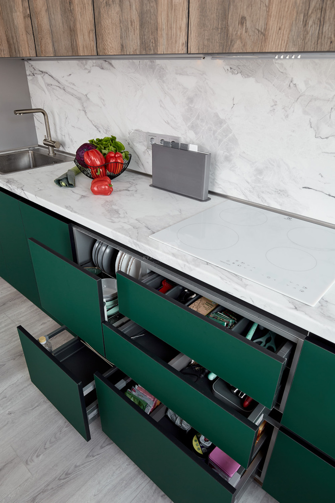 Система открывания без ручек «Space Line», которая делает кухню максимально выразительной.