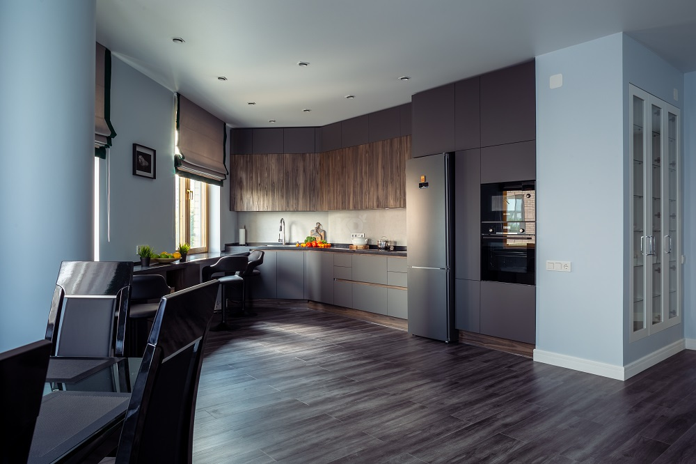Ещё одна необычная черта проекта – сверхдлинная барная стойка. Она расположена в левой части кухни и охватывает сразу два окна. Стойка является продолжением кухонной столешницы и неотъемлемой частью общей композиции. Здесь можно с комфортом отдыхать или работать, любуясь видами!