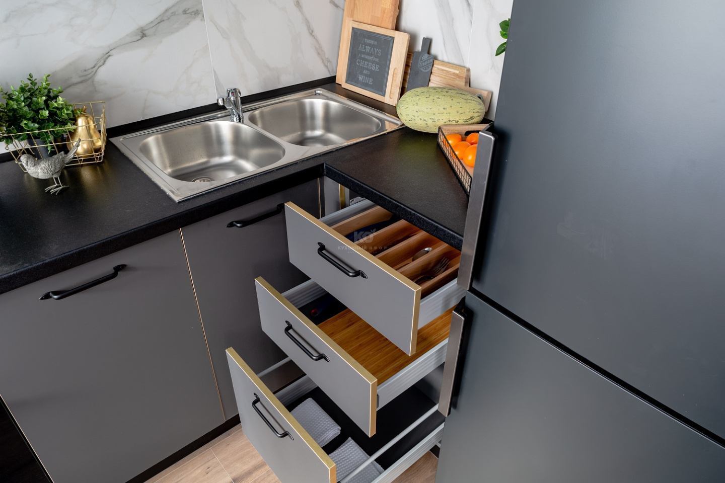 Обращаем Ваше внимание, что цена за погонный метр включает в себя: фасады выбранной категории, влагостойкую столешницу HPL (Германия) высокой прочности, корпуса ЛДСП Egger (Германия) с кромкой ABS, ящики с доводчиками , петли с доводчиками, ручки, алюминиевый поддон в стол под мойку, сушка (Италия), цоколь Volpato (Италия). Из расчета в размере 2400 мм.
