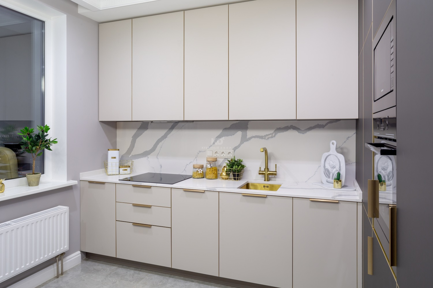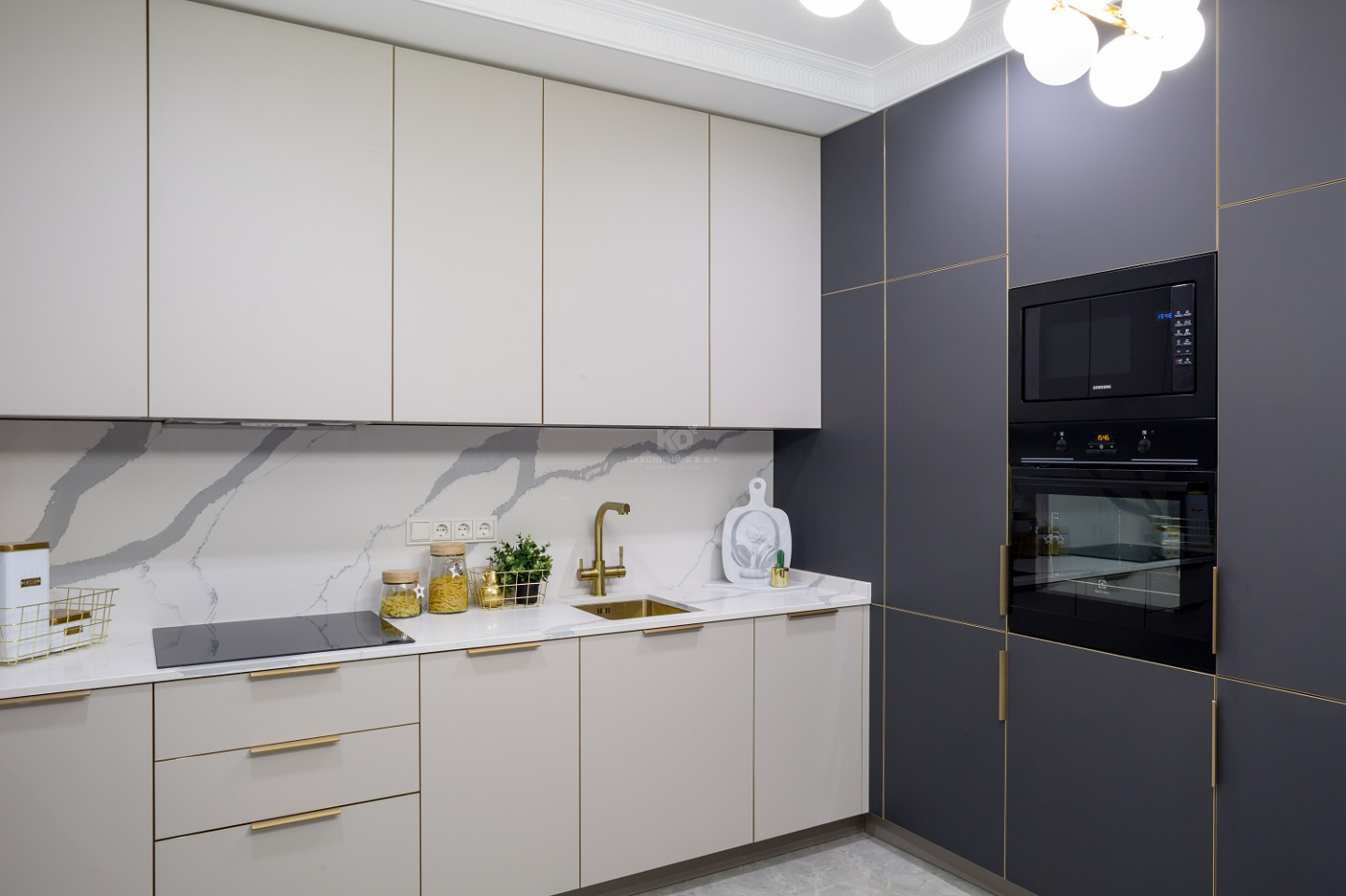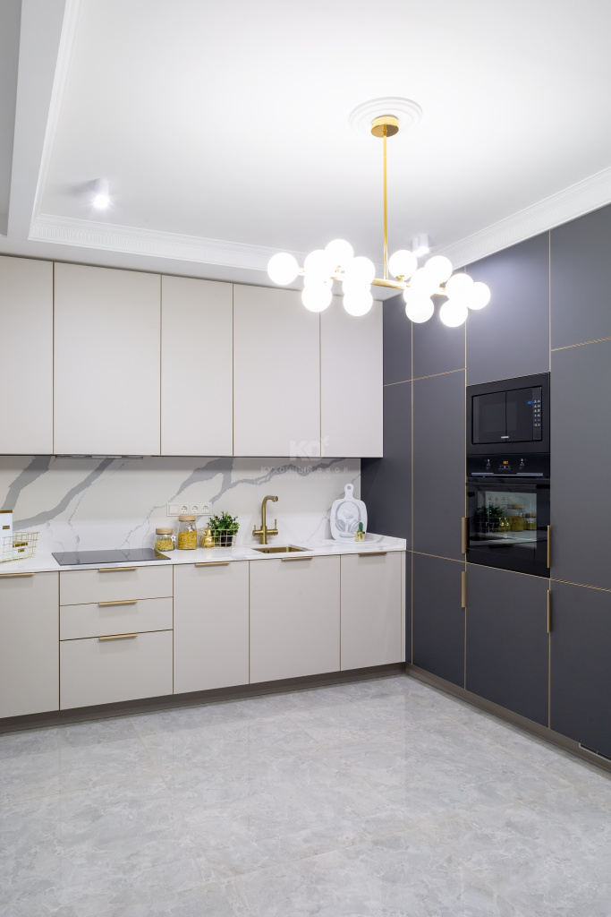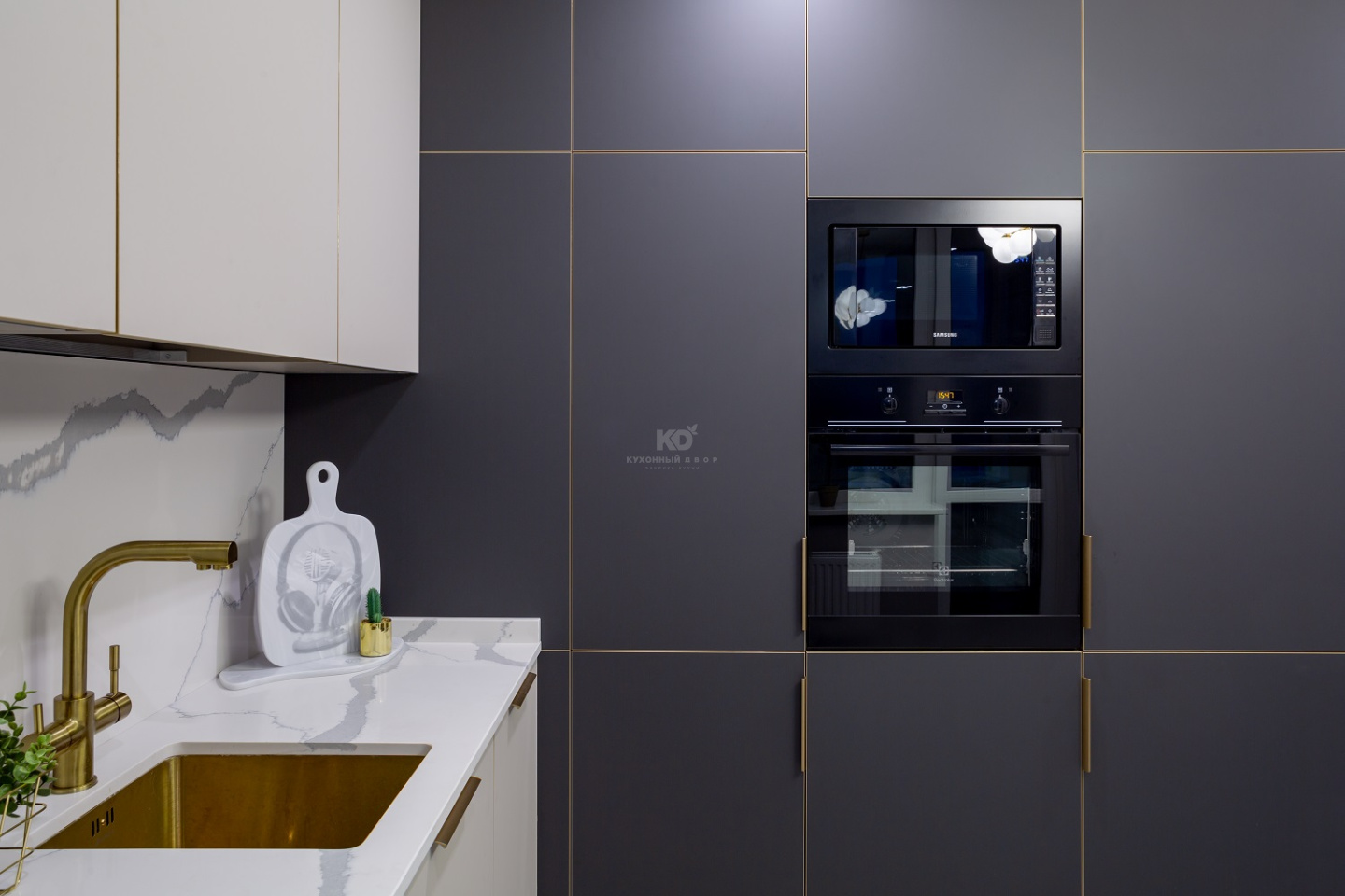 Обворожительно! Вера искала кухню, которая идеально бы подходила стилю «арт-деко». И «Ханна Стил» здесь в топе всех чартов! Ее фасады «Extra Touch Matt» имеют уникальную «бархатистую» текстуру, а также выразительные контрастные кромки. «Золотое» обрамление потрясающе смотрится как с белыми, так и чёрными поверхностями! А окончательную завершенность образу модели придают ручки, мойка и смеситель. Их цвет перекликается с цветом кромок, делая внешность «Ханны» ещё более презентабельной!