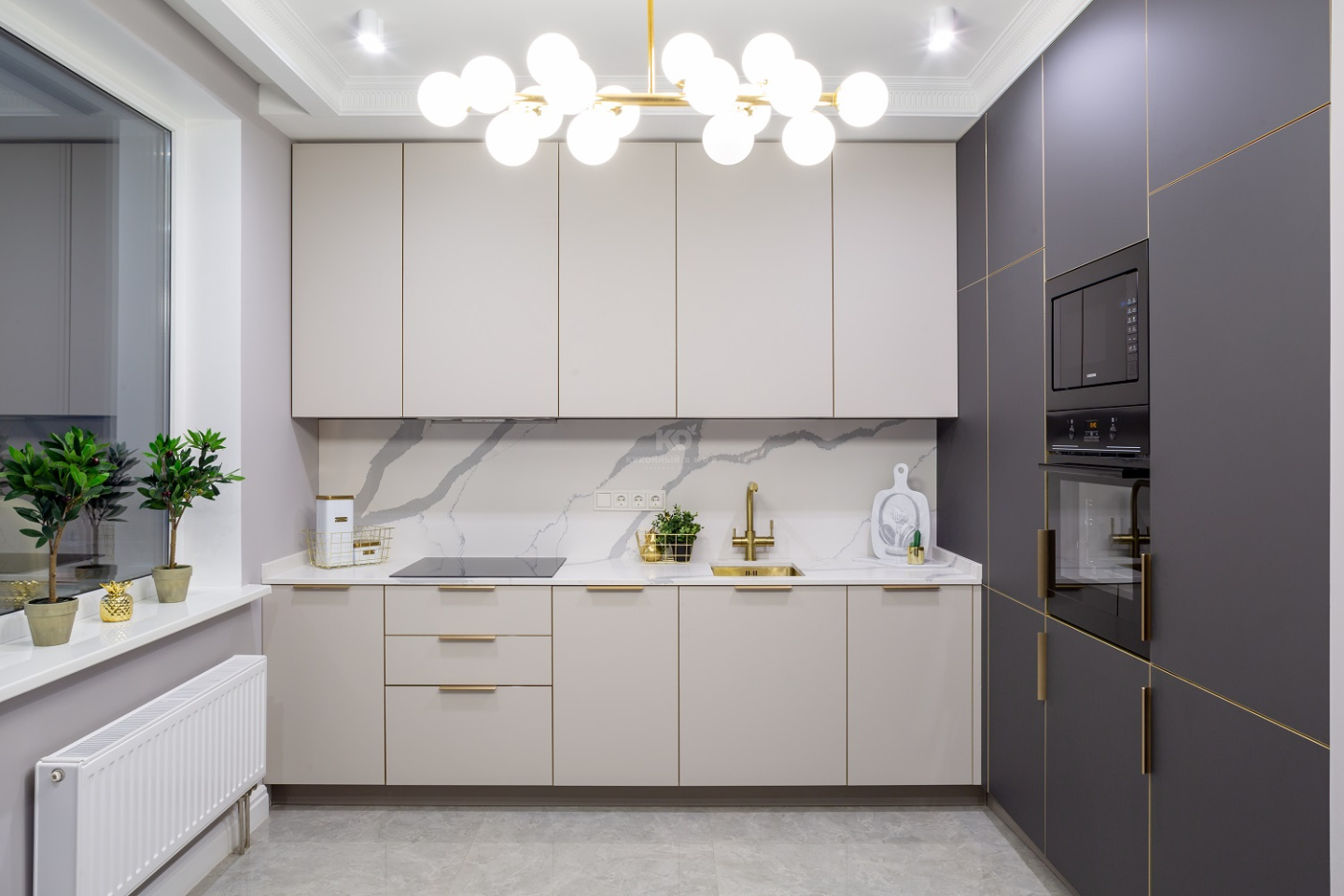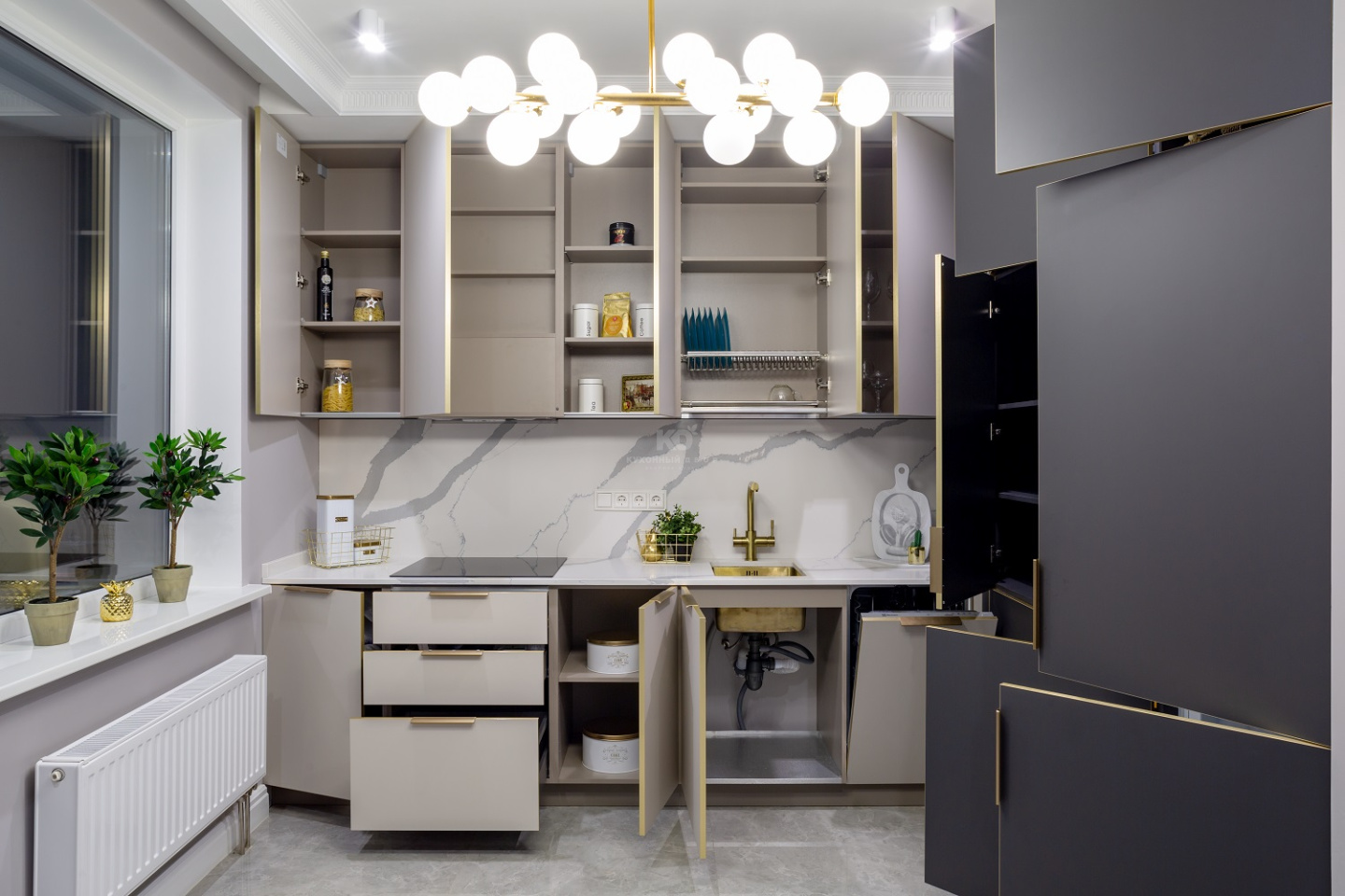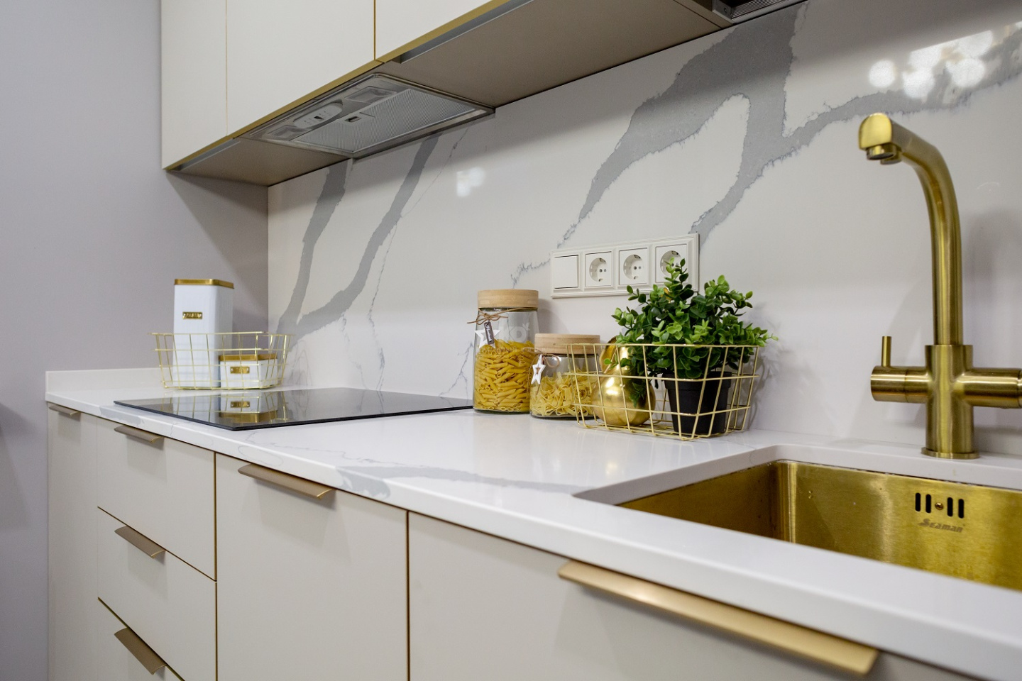 Обворожительно! Вера искала кухню, которая идеально бы подходила стилю «арт-деко». И «Ханна Стил» здесь в топе всех чартов! Ее фасады «Extra Touch Matt» имеют уникальную «бархатистую» текстуру, а также выразительные контрастные кромки. «Золотое» обрамление потрясающе смотрится как с белыми, так и чёрными поверхностями! А окончательную завершенность образу модели придают ручки, мойка и смеситель. Их цвет перекликается с цветом кромок, делая внешность «Ханны» ещё более презентабельной!