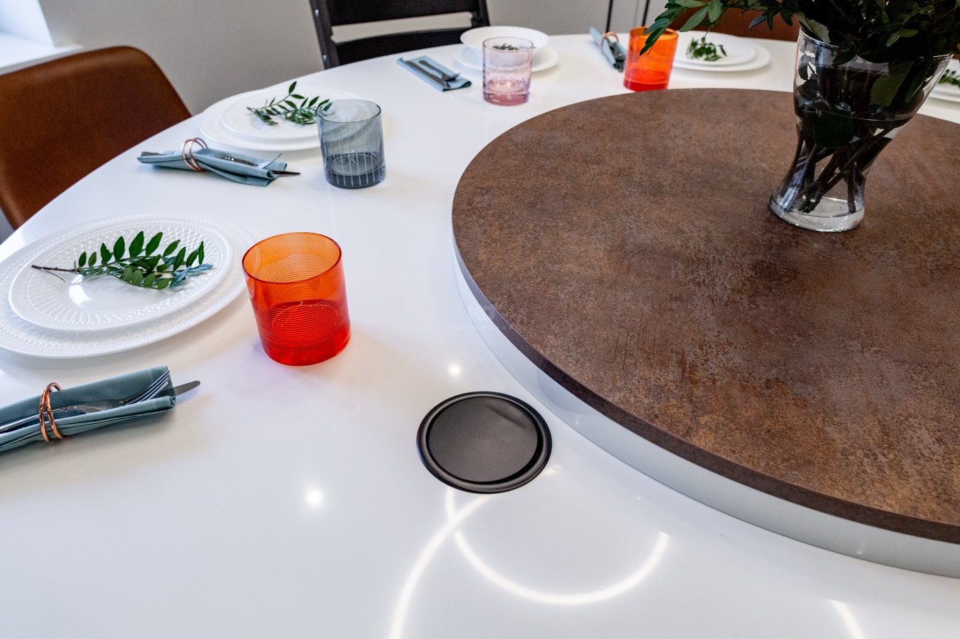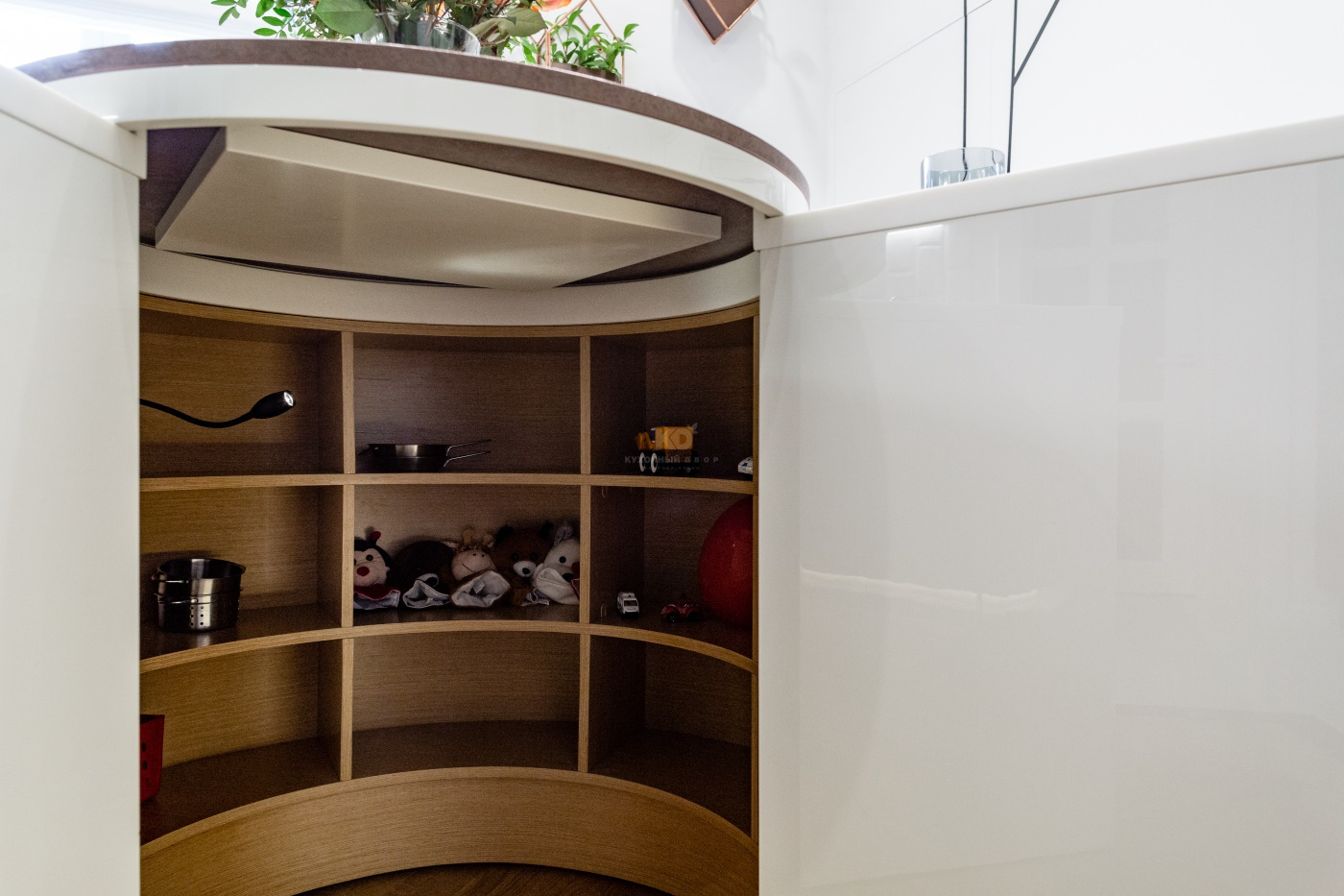 Ну и, наконец, жемчужина всей композиции – огромный круглый остров со съемной центральной частью. Он служит хозяевам и обеденной зоной, и местом для хранения множества полезных мелочей. Для самых маленьких членов семьи здесь тоже приготовлен приятный сюрприз. Центральная зона острова – это еще и уютный детский домик, внутри которого можно играть и хранить любимые игрушки.