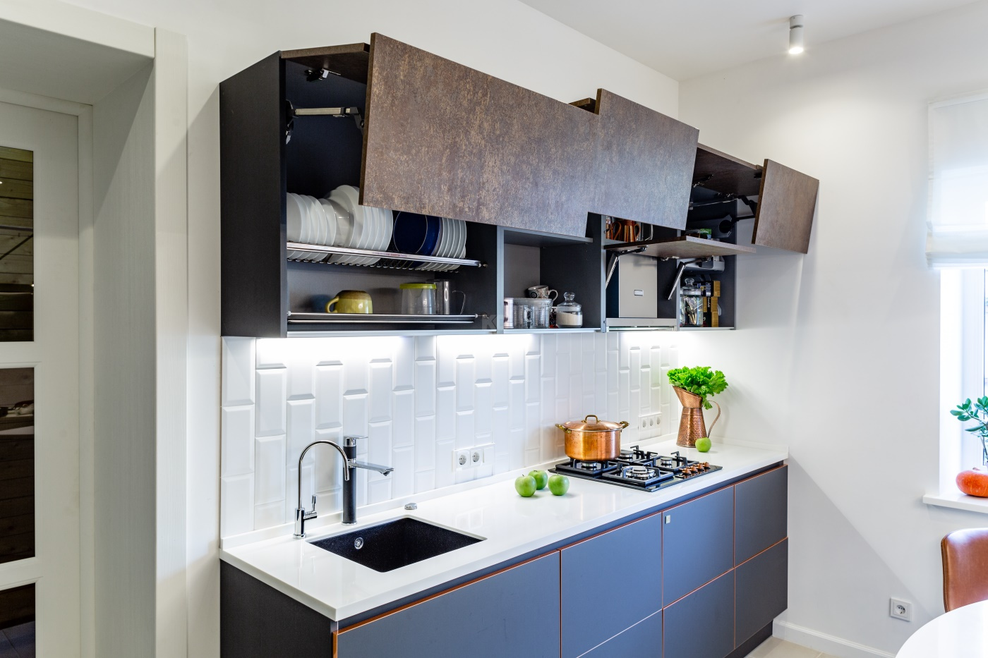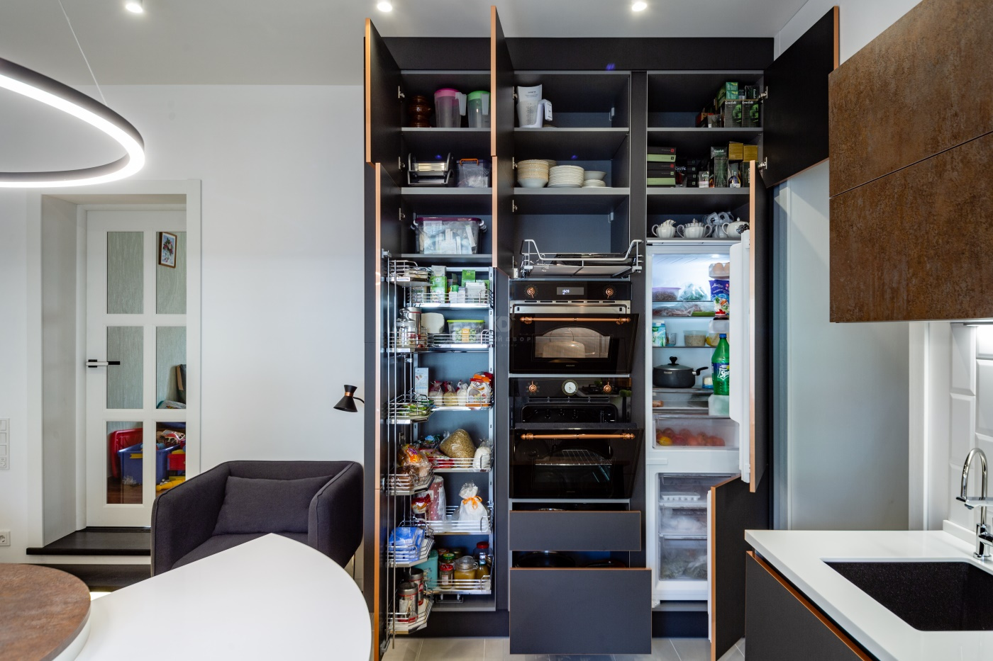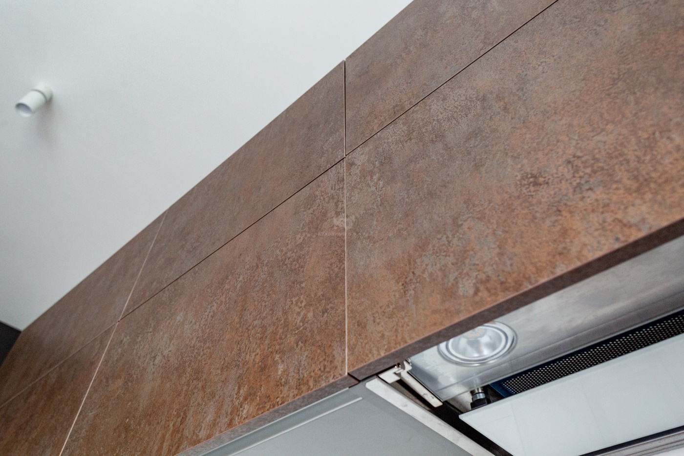 Нижний ярус этой кухни, а также зона с духовкой, холодильником и СВЧ выполнены в благородном графитовом цвете. Фасады из МДФ имеют уникальные декоративные кромки «под медь». Они подчёркивают строгую геометрию модели и придают ей особую энергетику. Кухня будто сияет изнутри тёплым, согревающим пламенем.