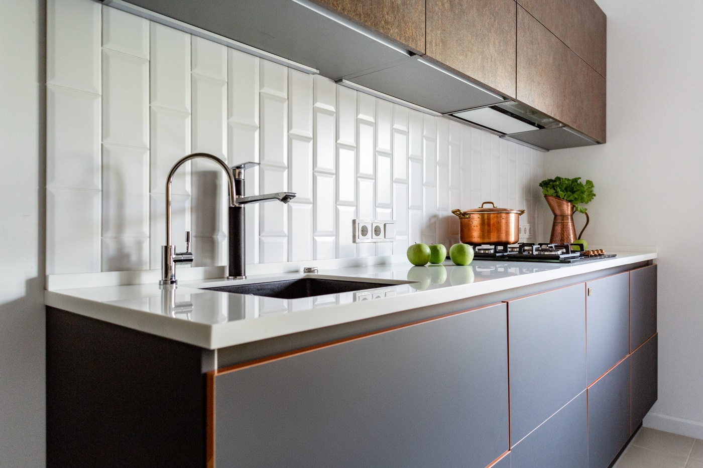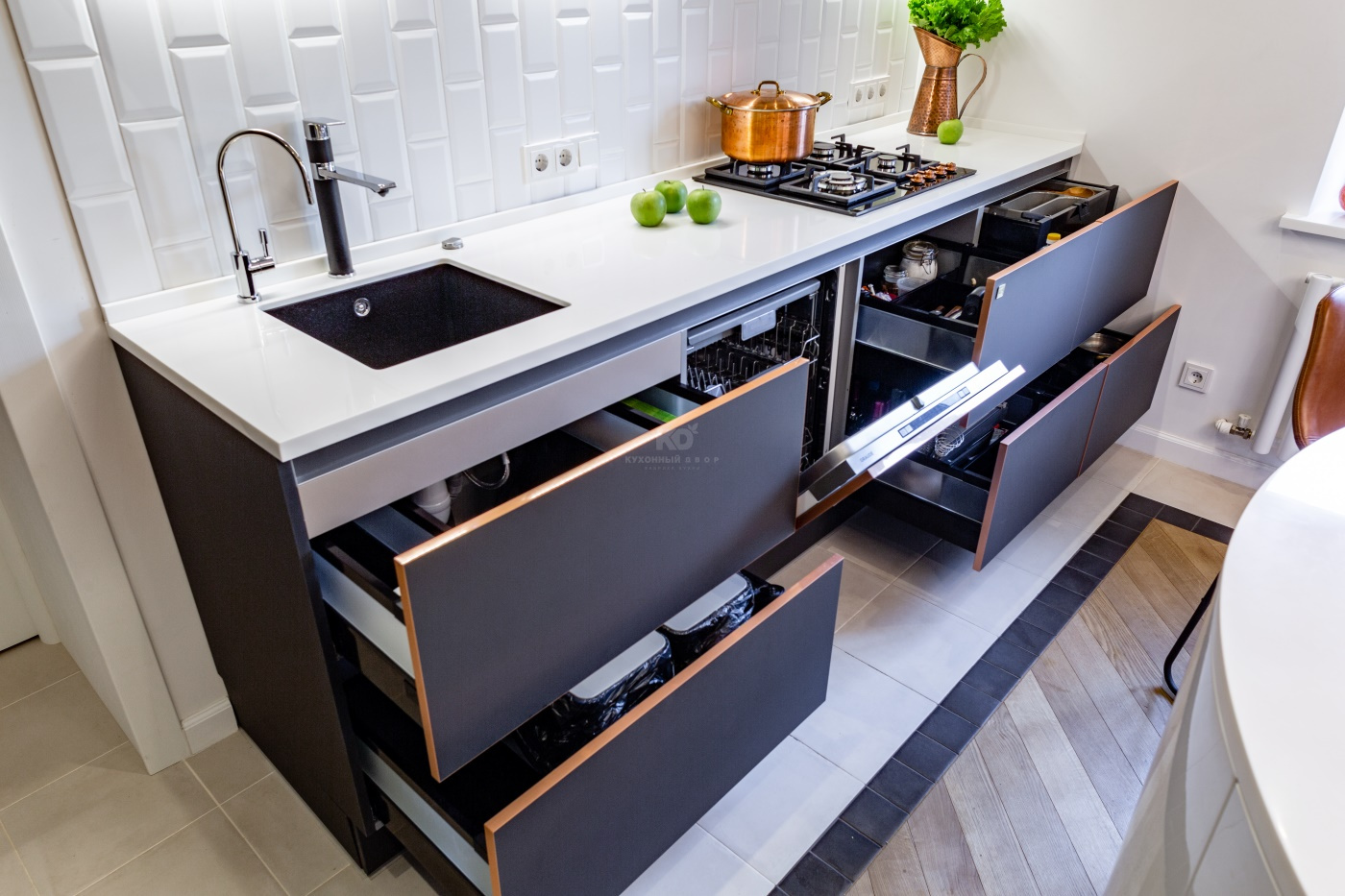 Тёмные фасады выглядят особенно прекрасно в симбиозе со столешницей из белоснежного акрилового камня. А на самой столешнице в свою очередь выделяются тёмная каменная мойка и варочная панель из чёрного закалённого стекла. Образуется многоступенчатая игра контрастов, которая делает «Ханну Стил» еще более необычной.