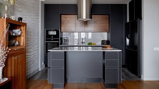 Внешний вид этой кухни полон шика и строгой элегантности. В его основе чёрные фасады с «бархатистым» покрытием «Extra Touch Matt», обрамлённые серебристыми кромками. Блеск металла «вычерчивает» элементы «Ханны», одновременно «облегчая» модель и подчёркивая «люксовость» её облика. Нотки роскоши добавляют и другие детали, среди которых:
