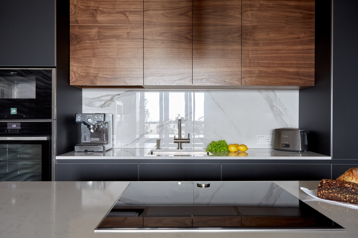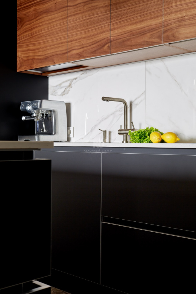 Утопленные шкафы верхнего яруса, фасады которых имеют неповторяющийся древесный рисунок;
