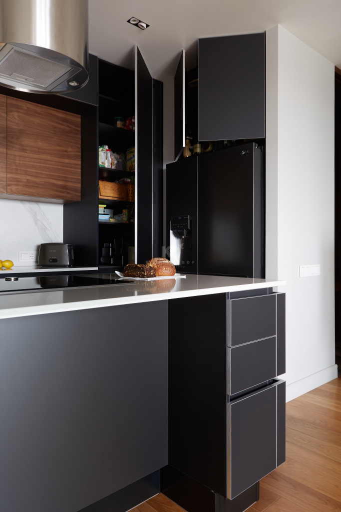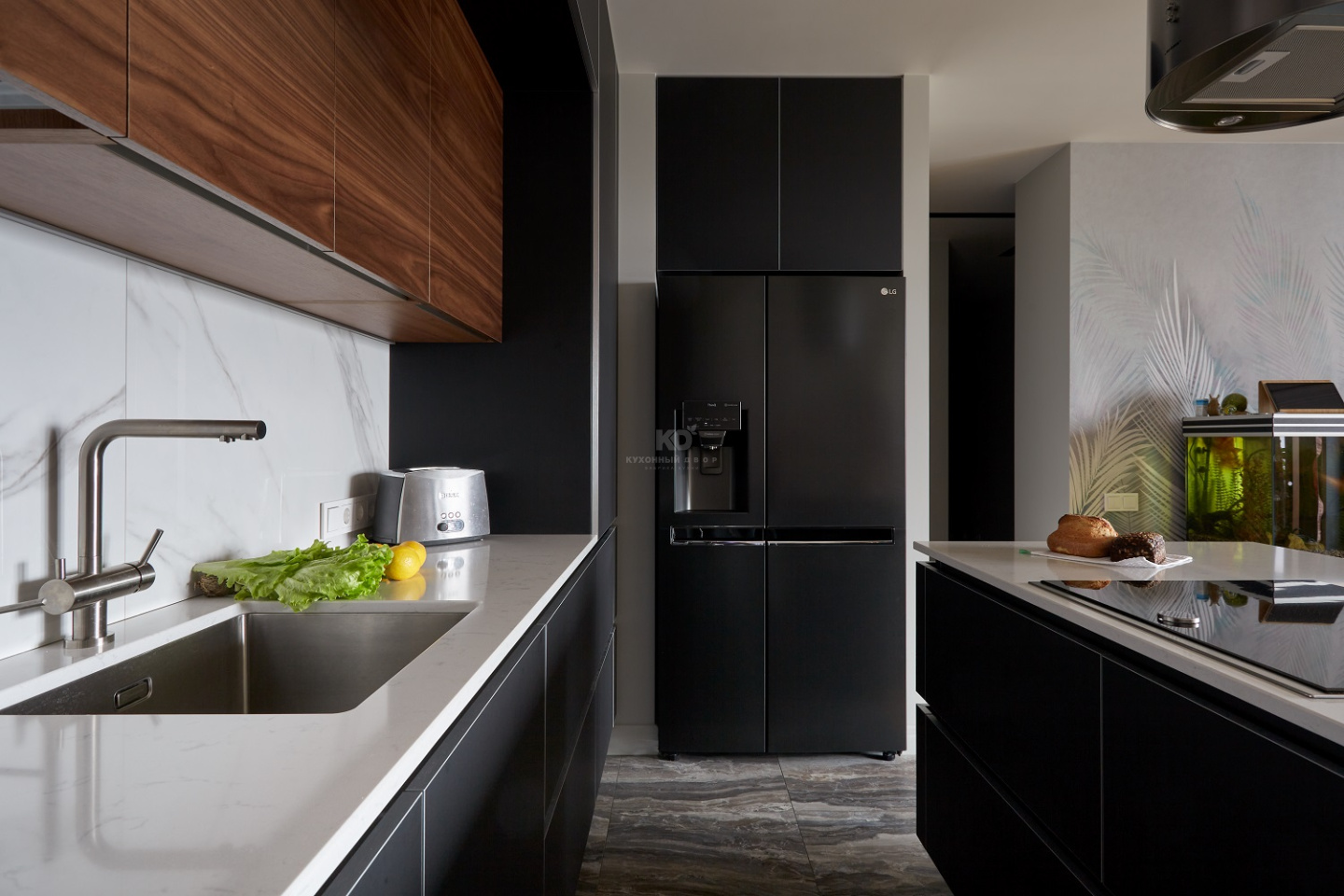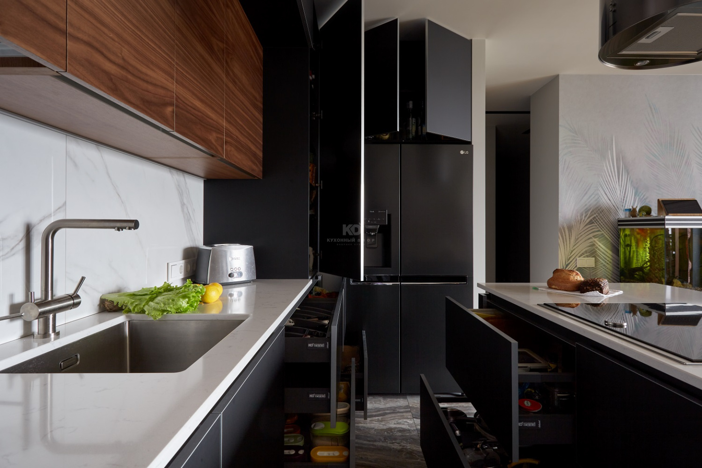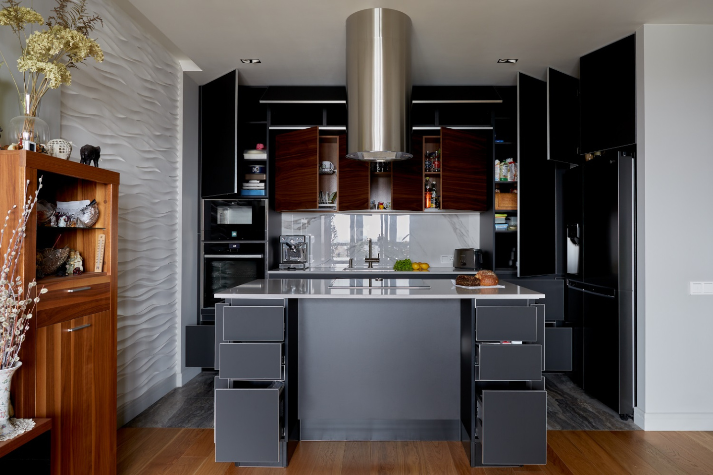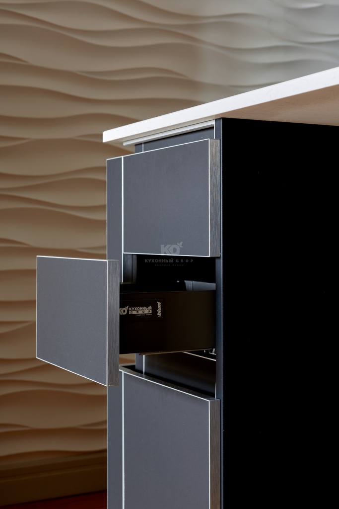 Особого внимания заслуживает потрясающей красоты остров, к которому моментально приковывается внимание каждого входящего в комнату. Остров имеет сложную форму и оснащён декоративной подсветкой по периметру столешницы, а также множеством вместительных ящиков. Вообще вместительность, наряду с красотой и эргономичностью – одна из главных черт этого проекта. В распоряжении хозяев «Ханны» невероятный объём полезного внутреннего пространства. Два пенала, ящики-тяжеловесы, антресоли, навесные шкафы и зоны хранения над холодильником позволяют поместить в кухню всё необходимое для создания кулинарных шедевров любой сложности. Эта «Ханна Стил» – идеальная помощница, созданная для тех, кто предпочитает готовить с комфортом!