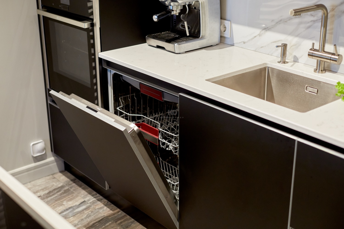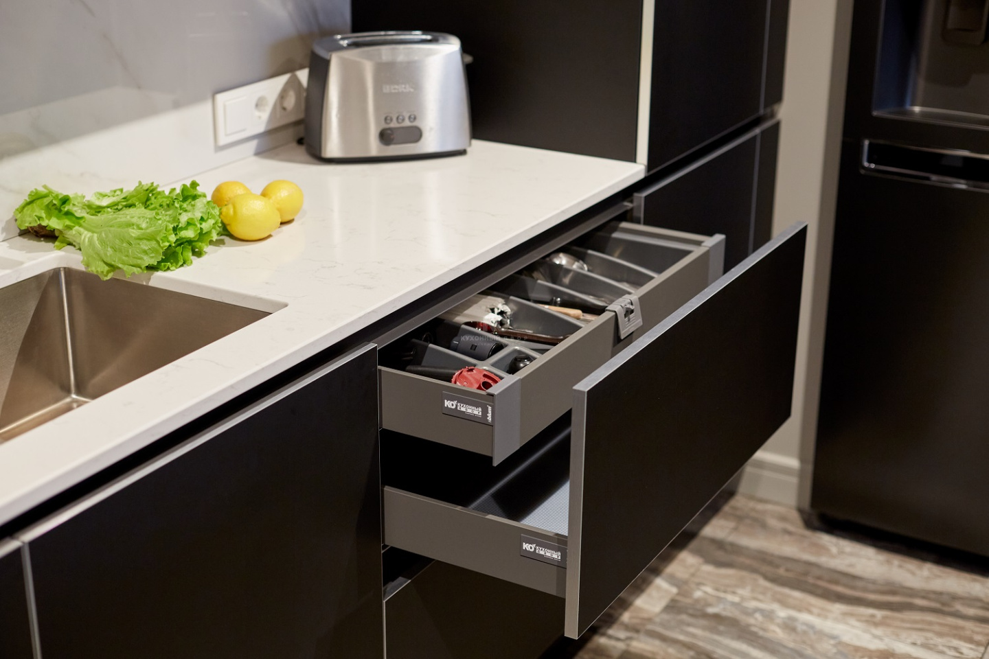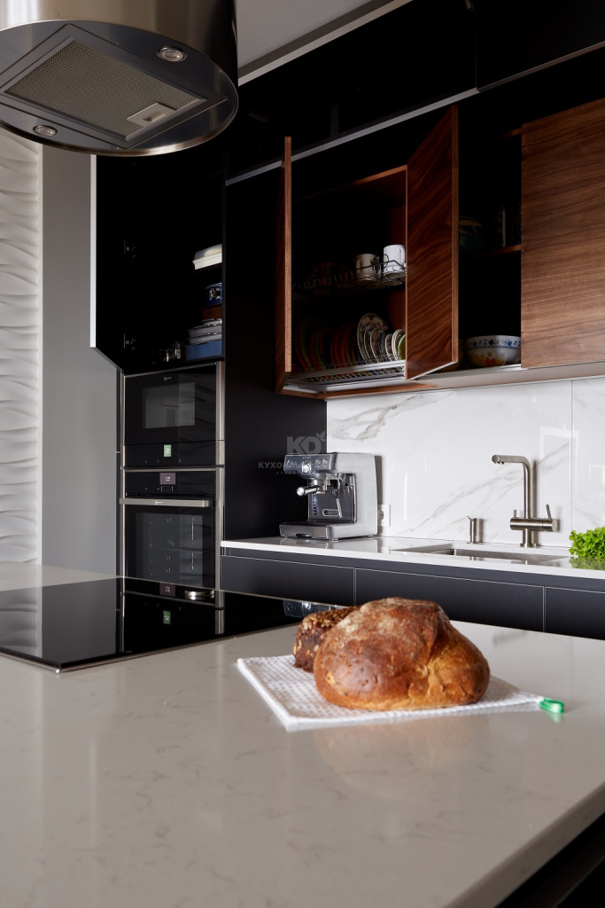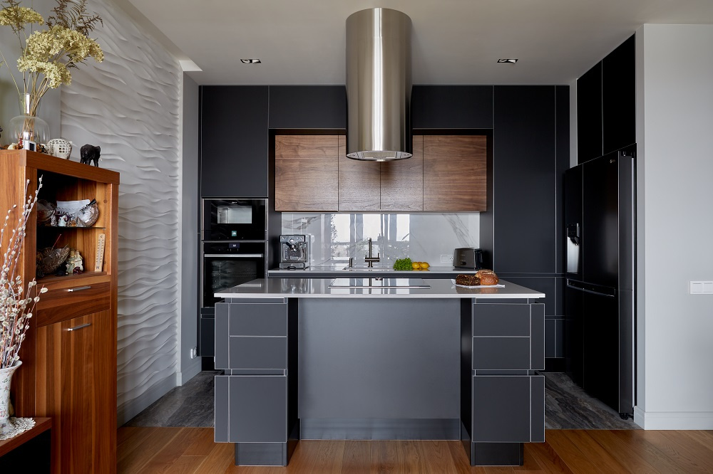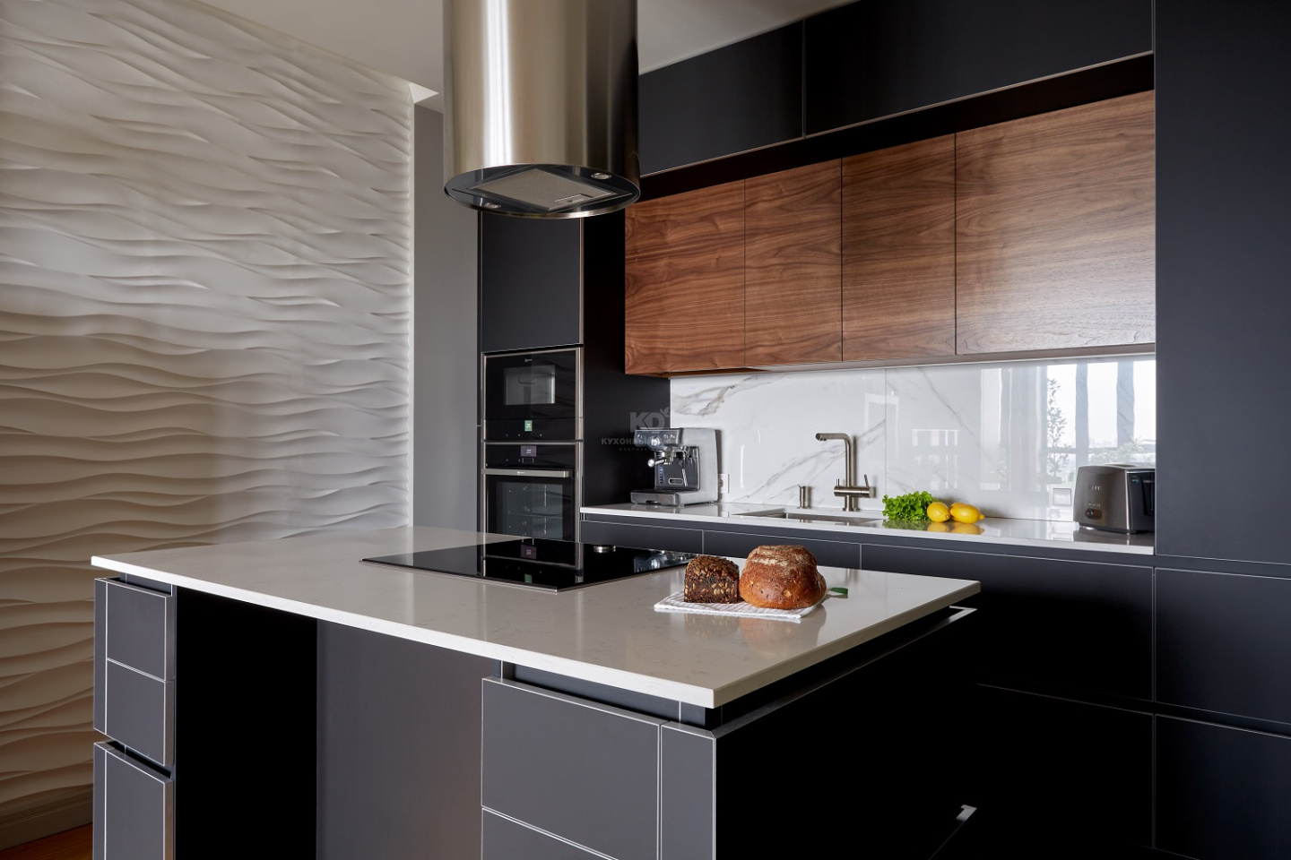 Внешний вид этой кухни полон шика и строгой элегантности. В его основе чёрные фасады с «бархатистым» покрытием «Extra Touch Matt», обрамлённые серебристыми кромками. Блеск металла «вычерчивает» элементы «Ханны», одновременно «облегчая» модель и подчёркивая «люксовость» её облика. Нотки роскоши добавляют и другие детали, среди которых: