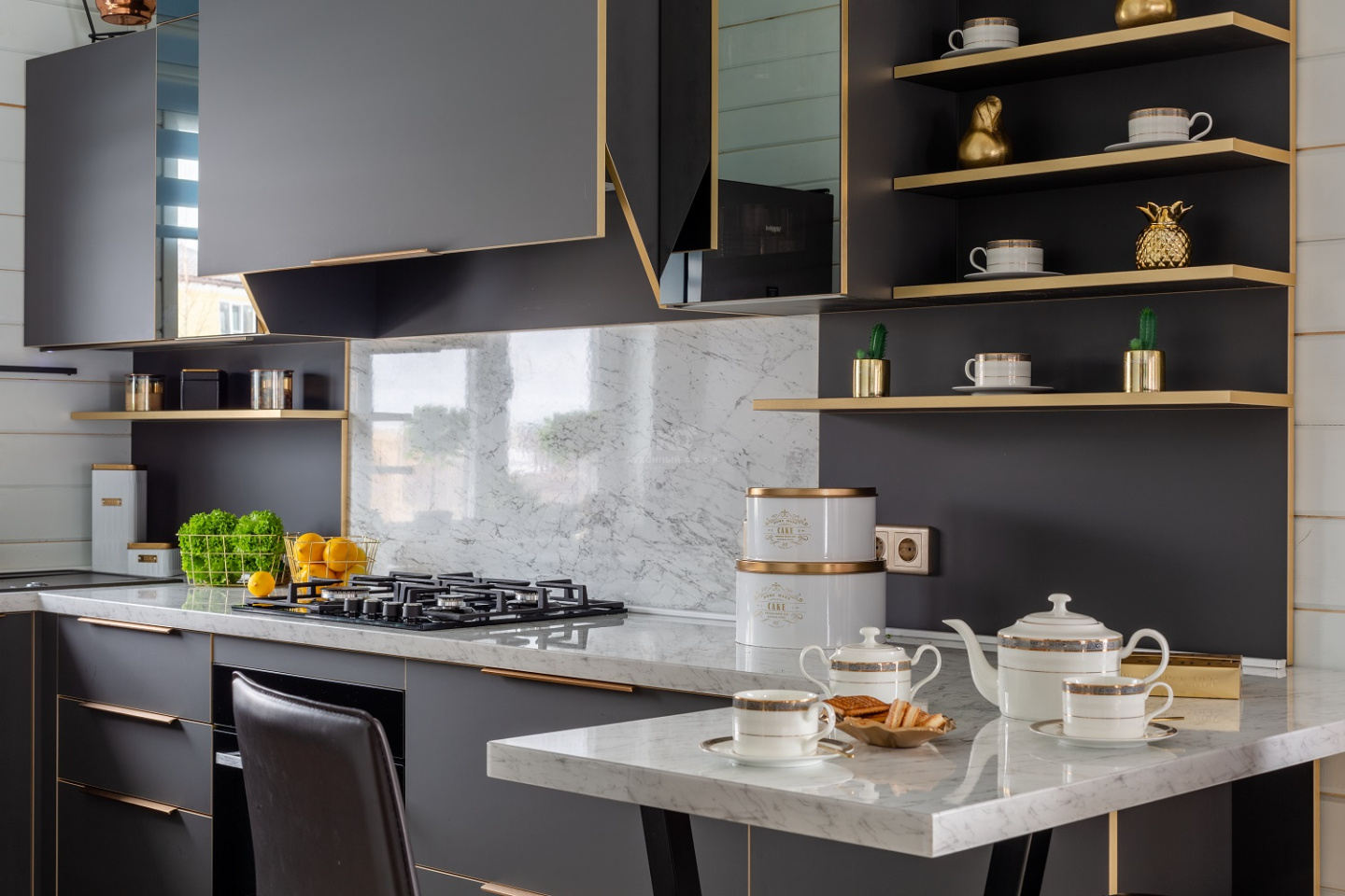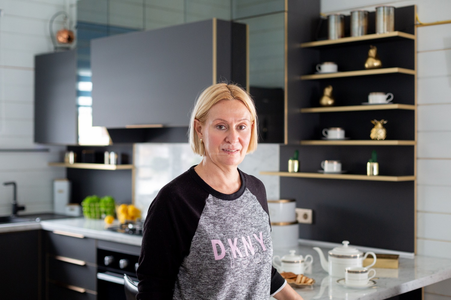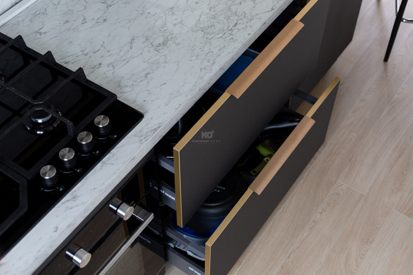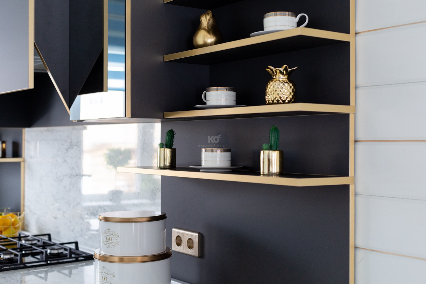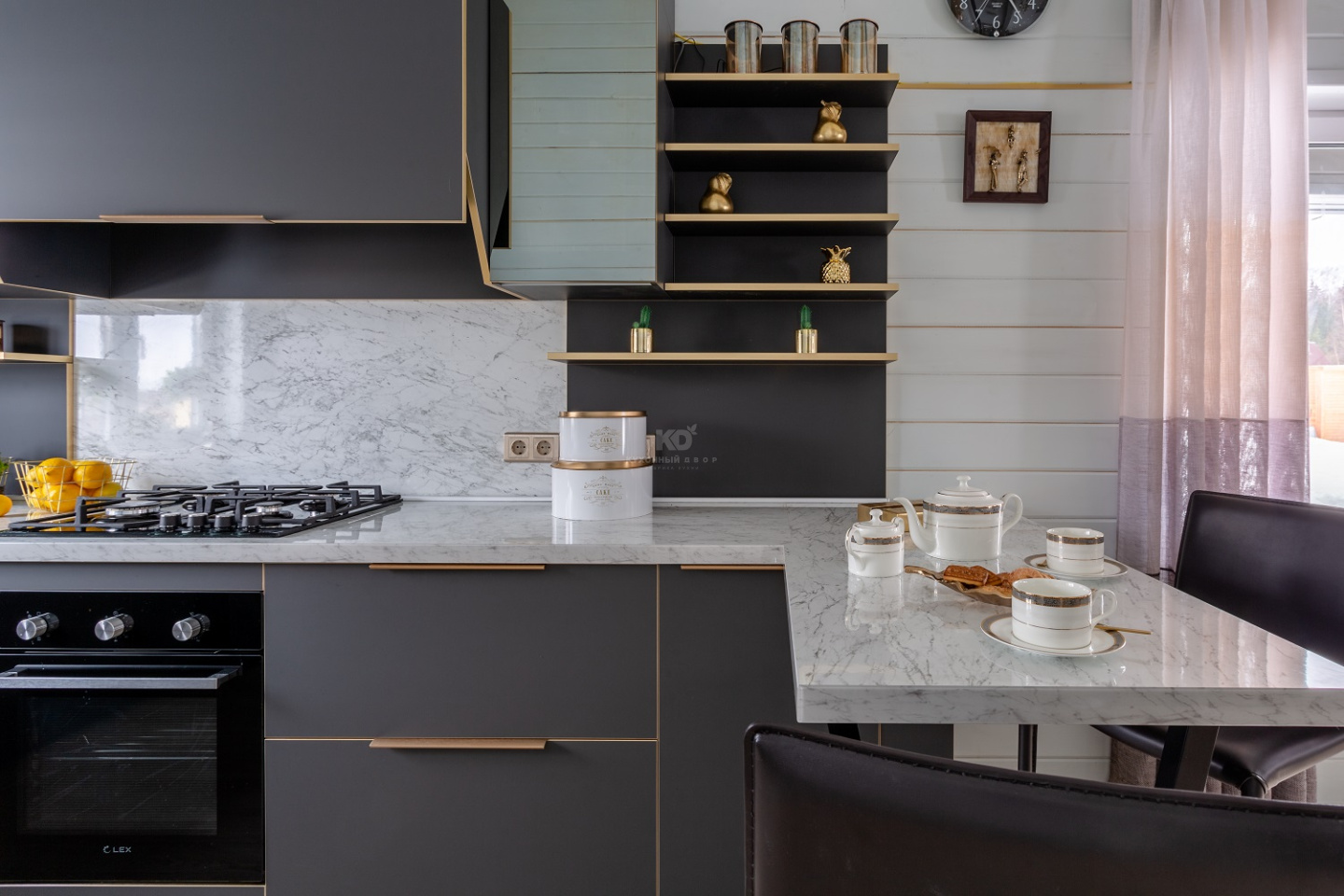 Акценты. Если контраст выделяет «Ханну», то акценты связывают её с окружающим интерьером. Все торцевые части фасадов и полок, а также ручки здесь выполнены в «золотом» цвете. Такое решение позволяет гарнитуру «перекликаться» со светильниками и окружающими элементами декора. Для кухни –гостиной особенно важно иметь эту тонкую связь между различными зонами интерьера. Чтобы данная связь стала еще прочнее, дизайнеры «KD-Lab» решили оснастить «Ханну» белой HPL-столешницей. Цвет столешницы идентичен цвету стен, а текстура аналогична текстуре фартука в зоне готовки. Дизайнеры мастерски вплели гарнитур в общую композицию помещения, сохранив при этом самобытность и уникальную красоту «Ханны»!