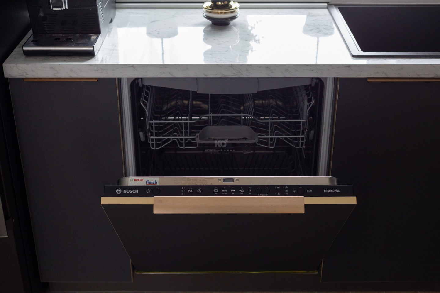 Отражения. Наличие окна в паре с хорошим искусственным освещением дали дизайнерам возможность сделать тёмную кухню удивительно лёгкой на вид. Это стало возможным благодаря использованию фасадов из почти зеркального стекла. Элементы с такими фасадами окаймляют вытяжку, делая облик «Ханны» ещё более оригинальным, и визуально расширяя окружающее пространство. «Зеркальные» зоны окончательно формируют облик модели, делая его цельным, завершённым и удивительно притягательным!