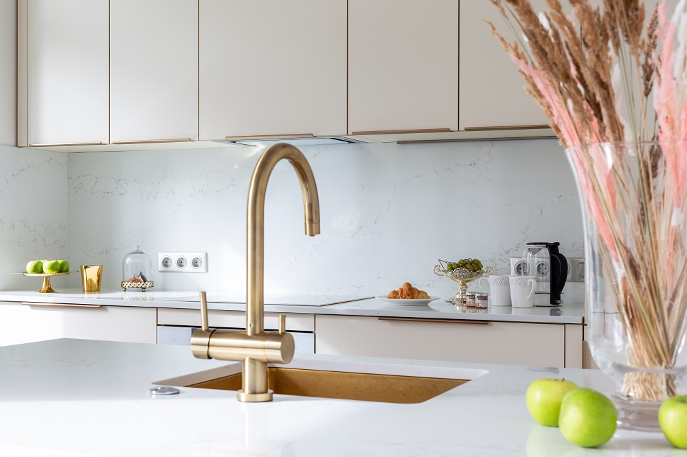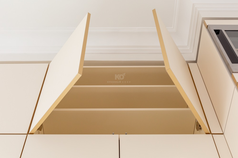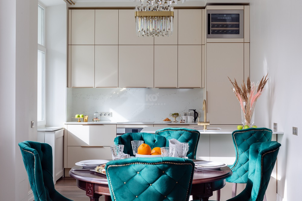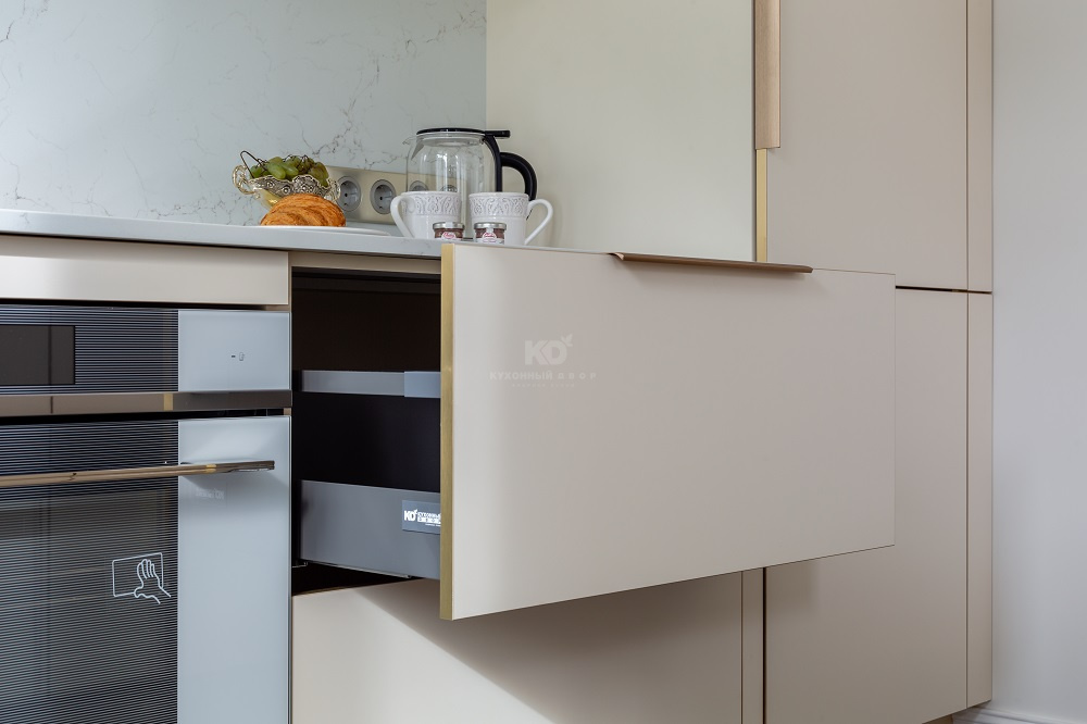 Красота! Кухня поделена на две основные зоны – остров и основной фронт. При этом все фасады здесь имеют особое «бархатистое» покрытие «Extra ouch Matt» и контрастные кромки под золото. Подбор техники и аксессуаров осуществлялся с оглядкой на цветофактуру проекта. Так, было решено установить духовой шкаф и варочную панель белого цвета, а японская мойка выполнена в редком оттенке «Латунь Антик».