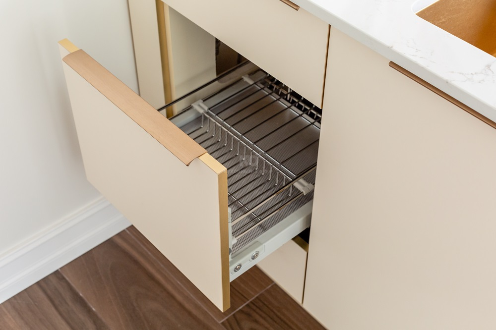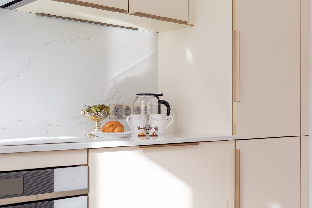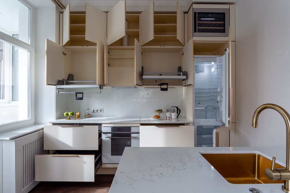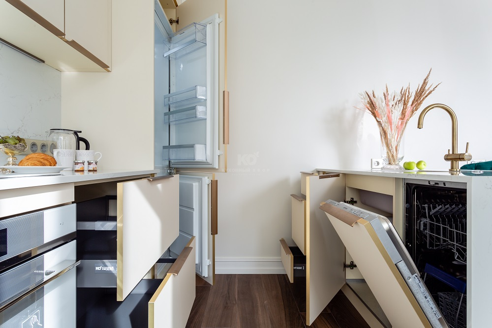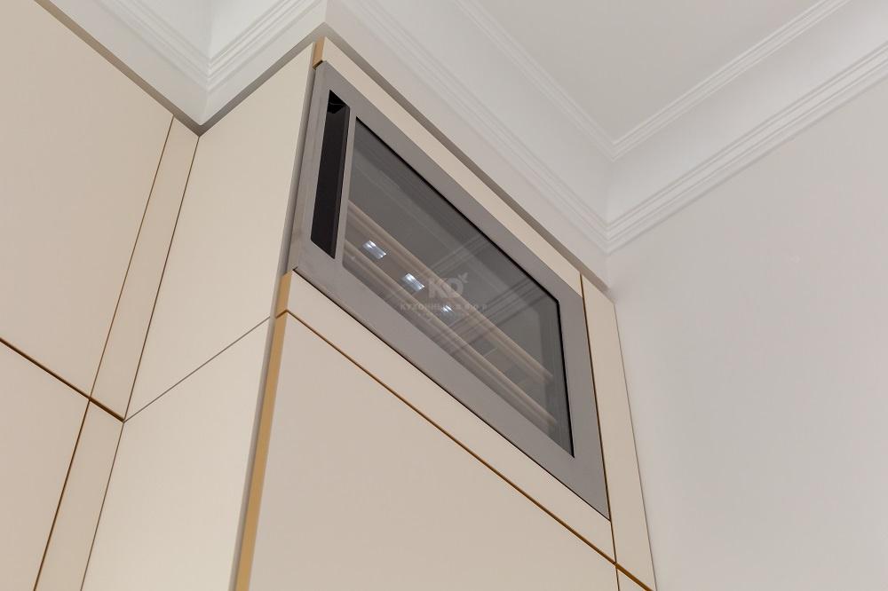 Функционал! Техники и аксессуаров здесь очень много. При этом почти всё искусно спрятано за глухими фасадами! В распоряжении хозяев: большой холодильник, компактная посудомоечная машина, варочная панель, духовой шкаф, измельчитель пищевых отходов, а также удобная мини-сушка и сразу несколько выдвижных механизмов «I-Move». Ну, и конечно-же, гордость этого проекта – высокотехнологичная винотека с функцией контроля температуры. С ней самые восхитительные напитки будут поданы гостям в лучшем виде!