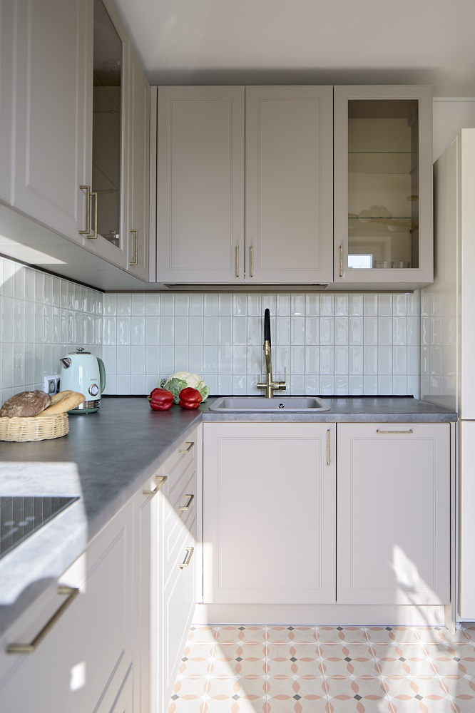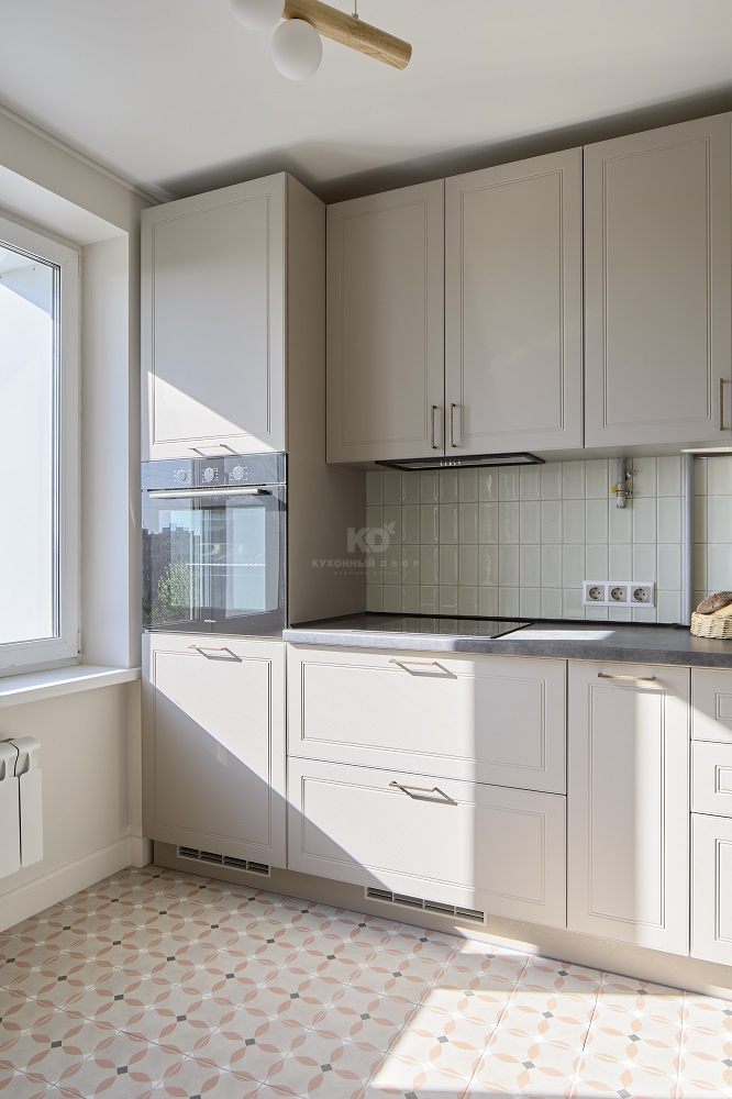 Нежный цвет фасадов, чтобы во время готовки можно было отдыхать и не отвлекаться на яркие акценты.
