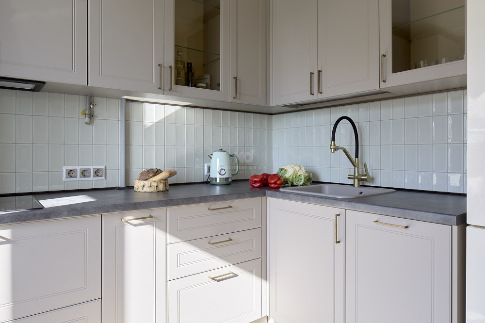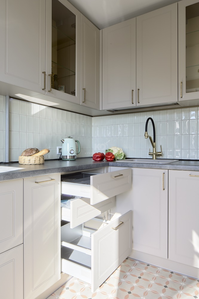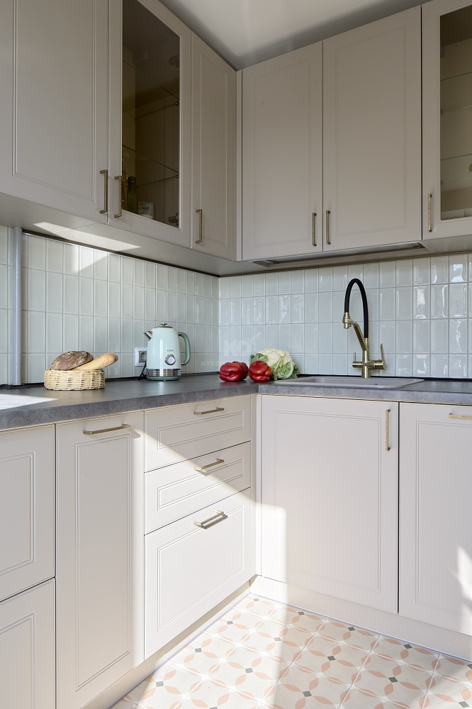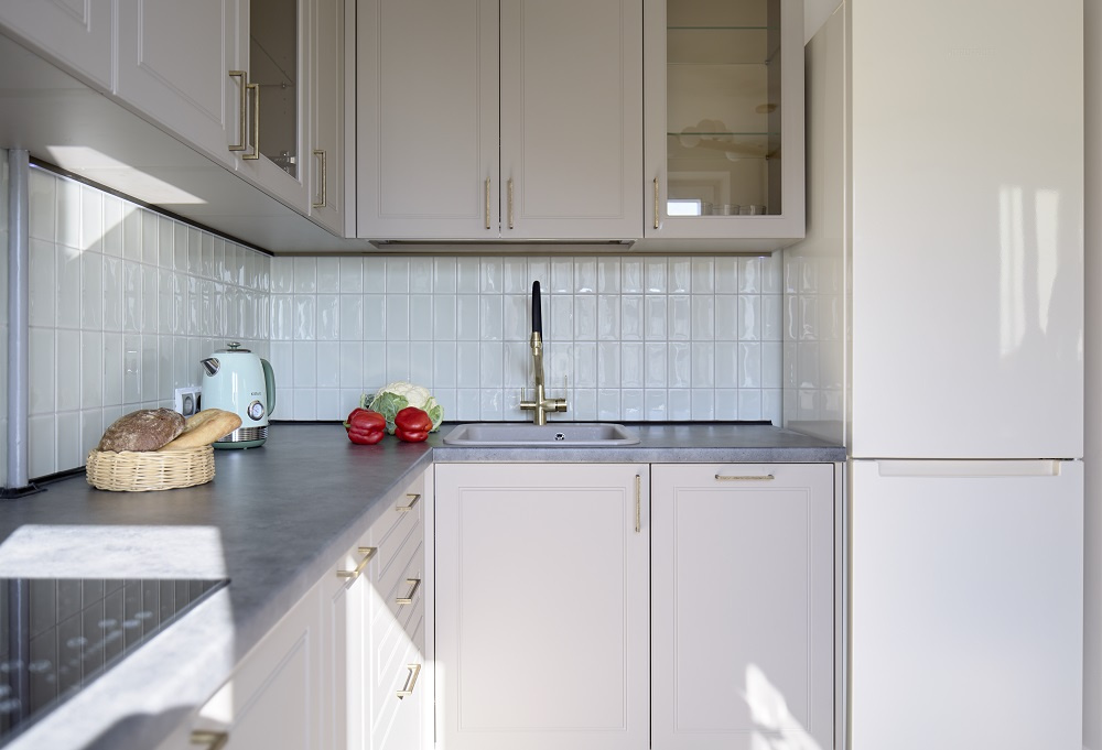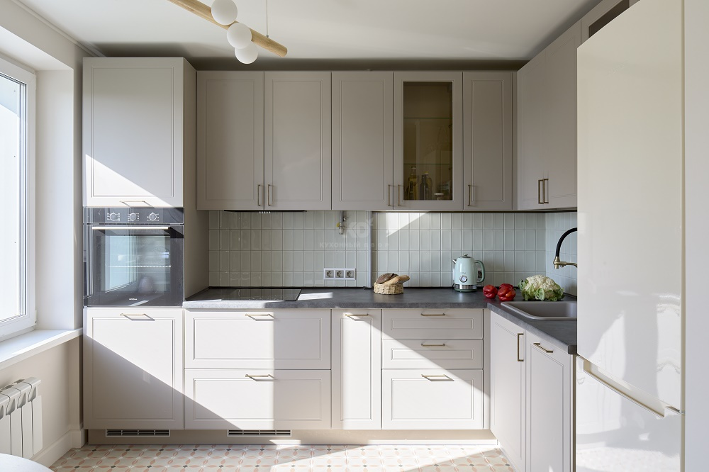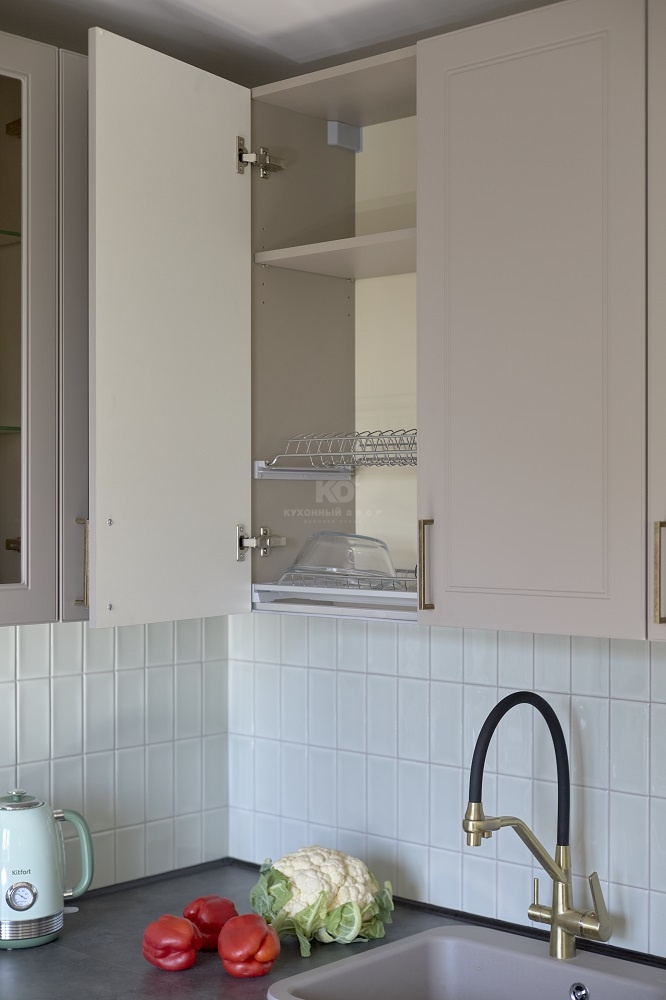 Мы также позаботились о том, чтобы кухня служила своей новой хозяйке как можно дольше – фасады «Лея» изготовлены из инновационных материалов и покрытий, устойчивых к механическим повреждениям. К спокойным цветам добавили буфеты с прозрачными дверцами, чтобы добавить кухне легкости и воздушности.