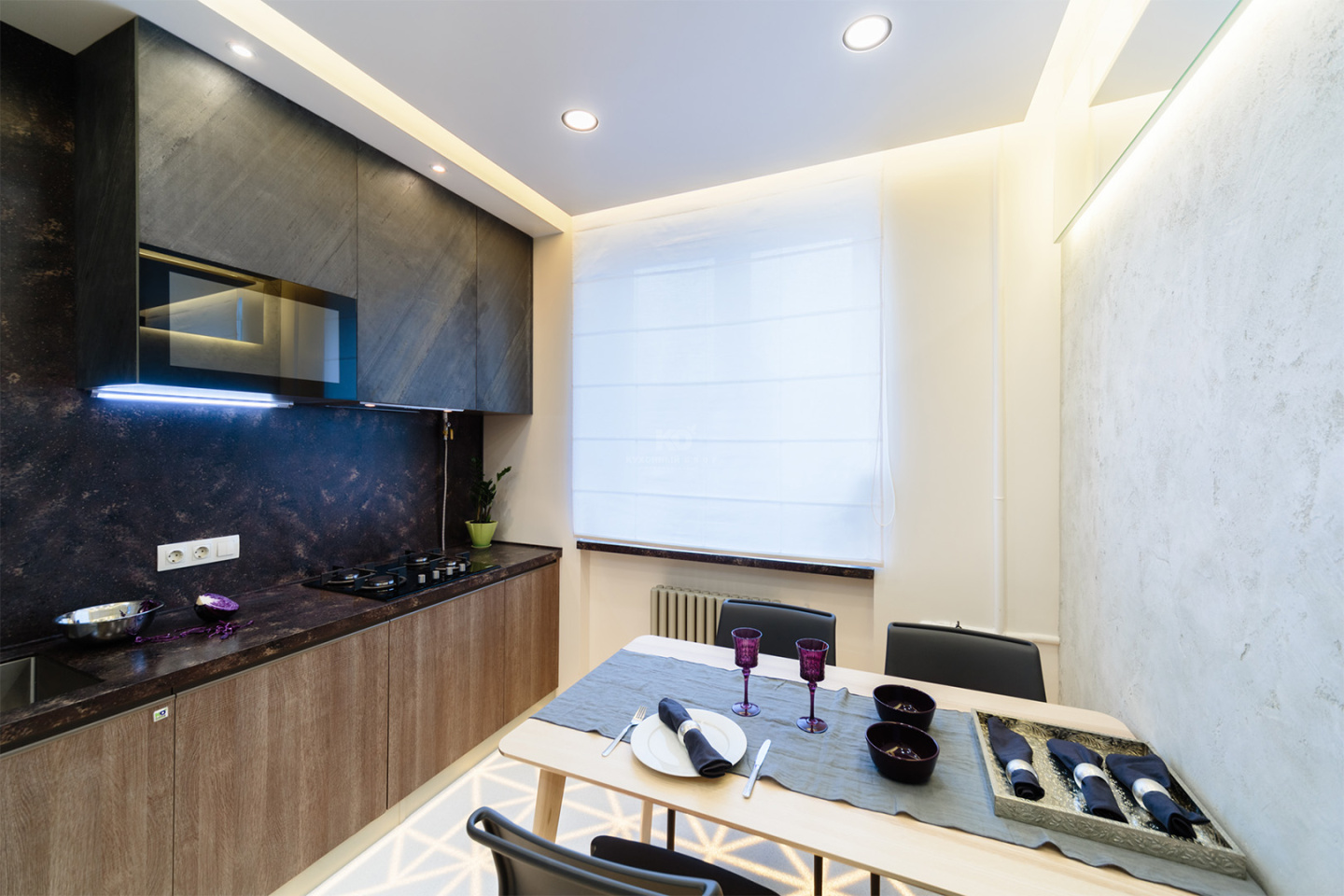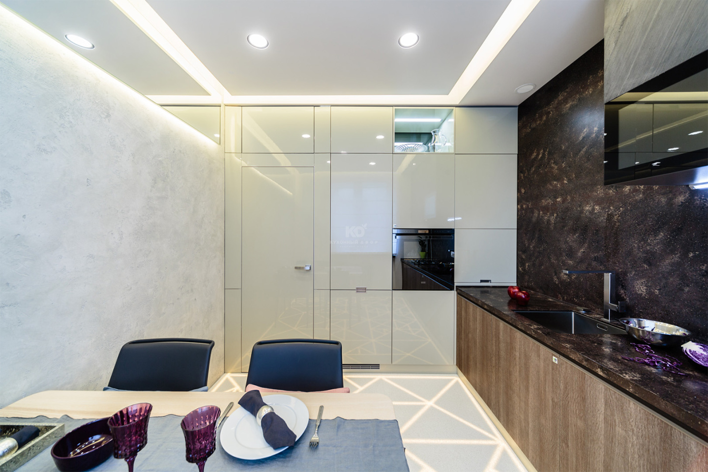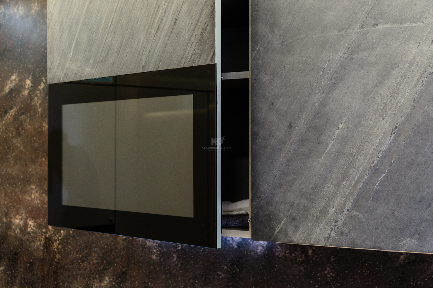 Подвесные шкафчики декорированы шпоном сланца, который придает им вид настоящих скал. Еще один декораторский прием в этой игре фактур – крепление шпона: тонкие каменные листы скошены под углом 45 градусов.