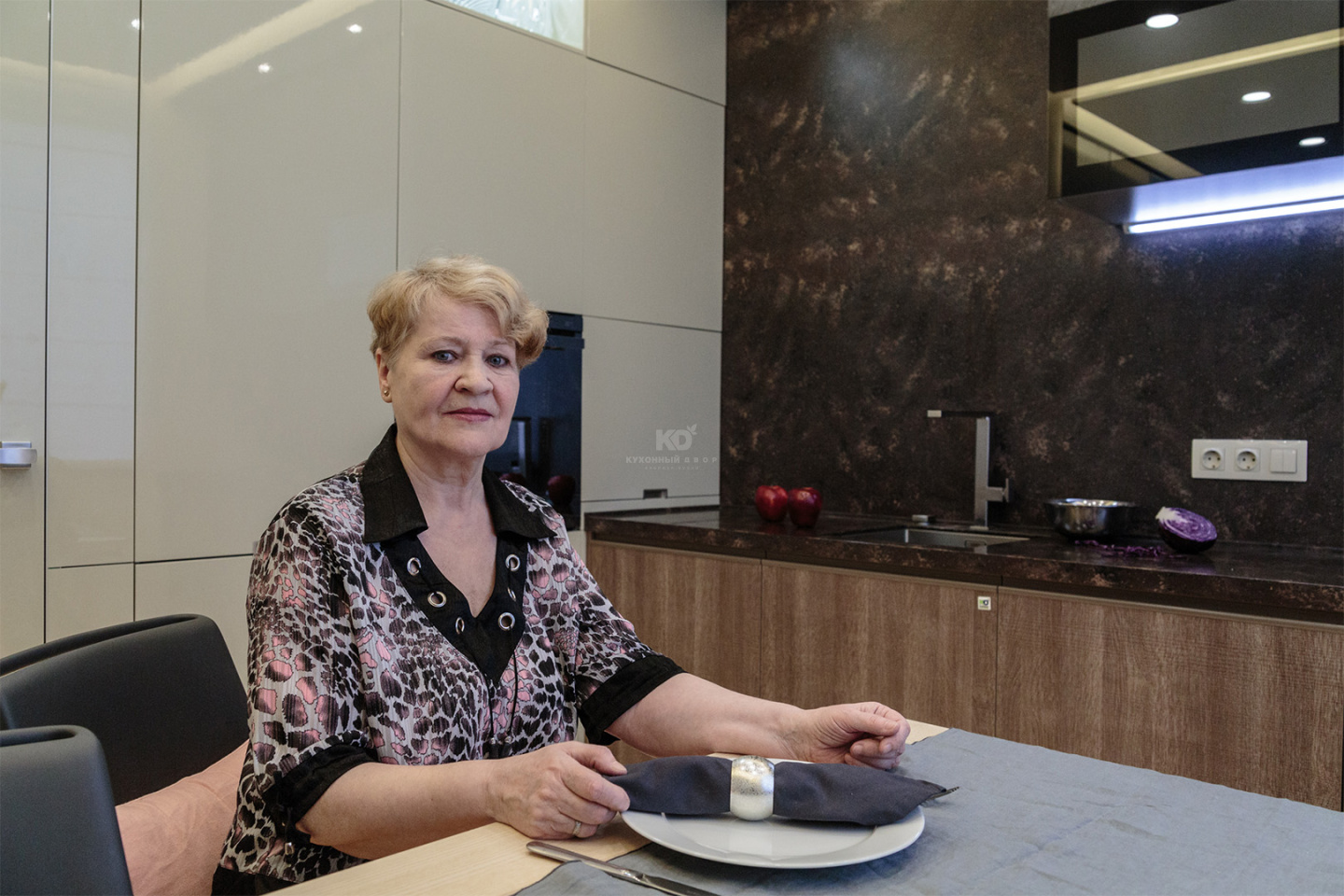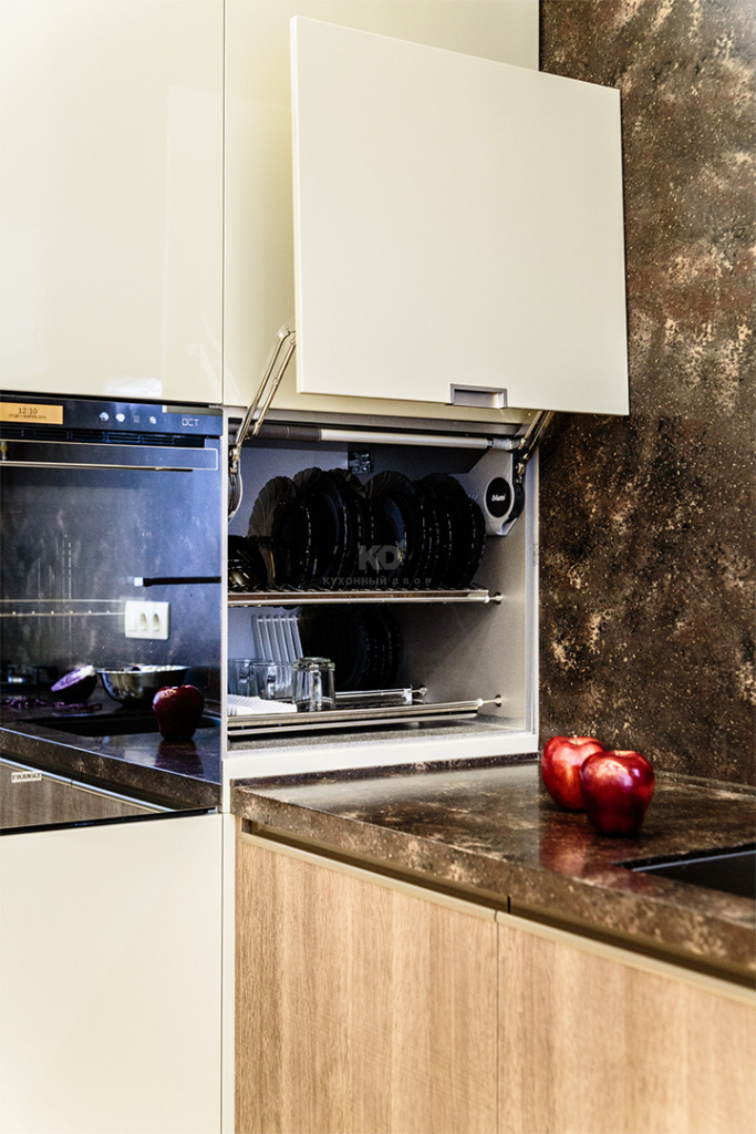 За эмалированными фасадами оттенка «серая галька» – всё, что нужно для хранения самых разнообразных продуктов, припасов и посуды. Это две закрытые полки наверху шкафа, выкатные системы в виде неправильных восьмерок для труднодоступных участков угловой секции, сушилка возле мойки и даже специальное приспособление для хранения тарелок. Здесь же, в шкафу, расположен и встраиваемый холодильник.