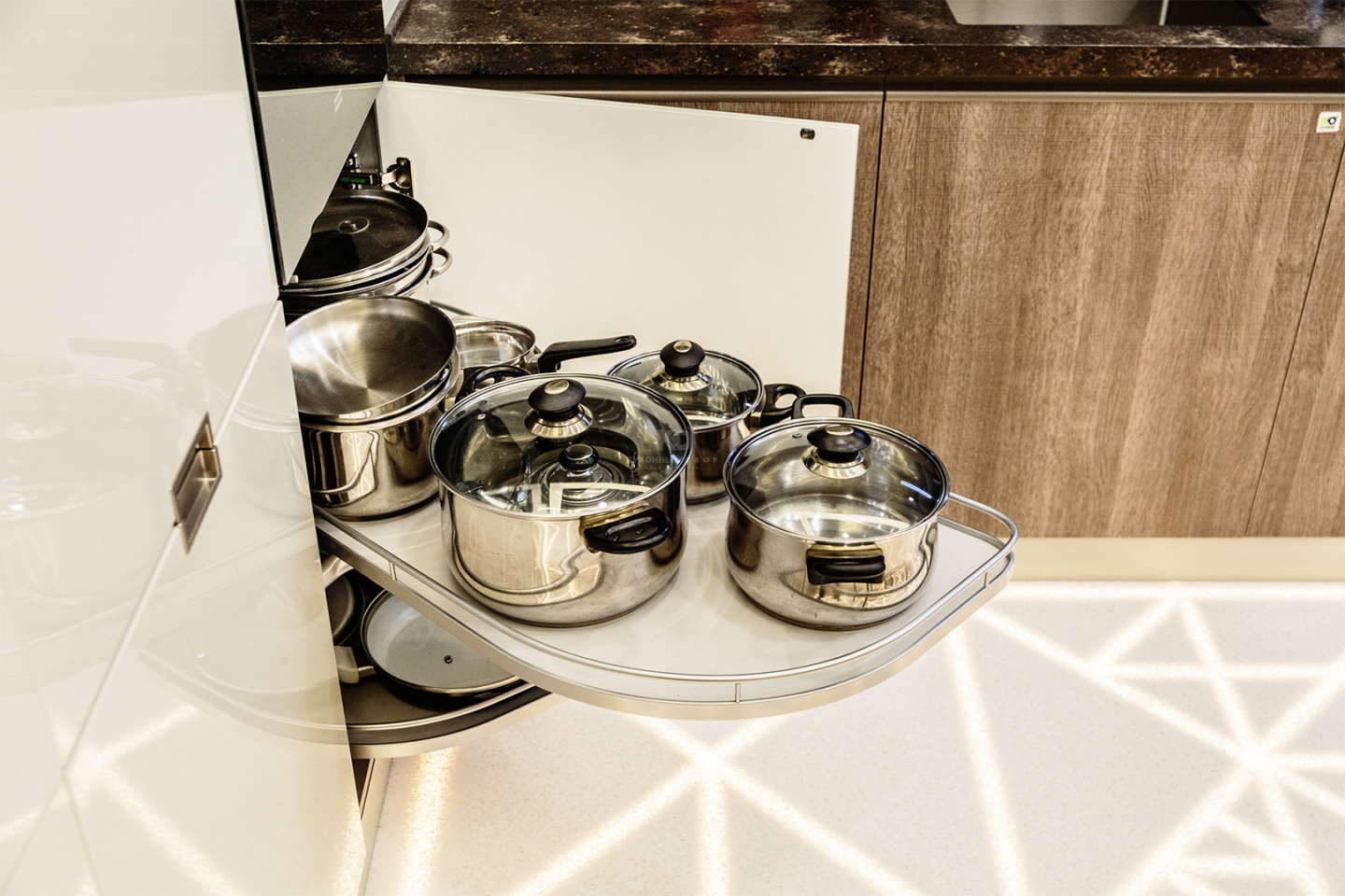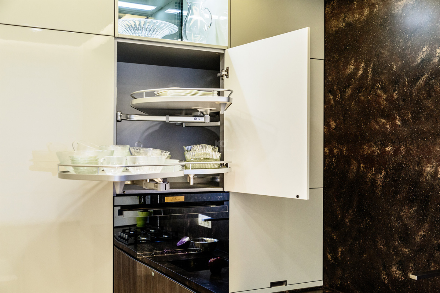 Внутри шкафчиков – многочисленные полки и компактная вытяжка. Крайняя правая секция содержит комплект ТОМ, который крепится на дверку верхнего шкафа и предназначен для хранения всевозможной хозяйственной мелочевки.