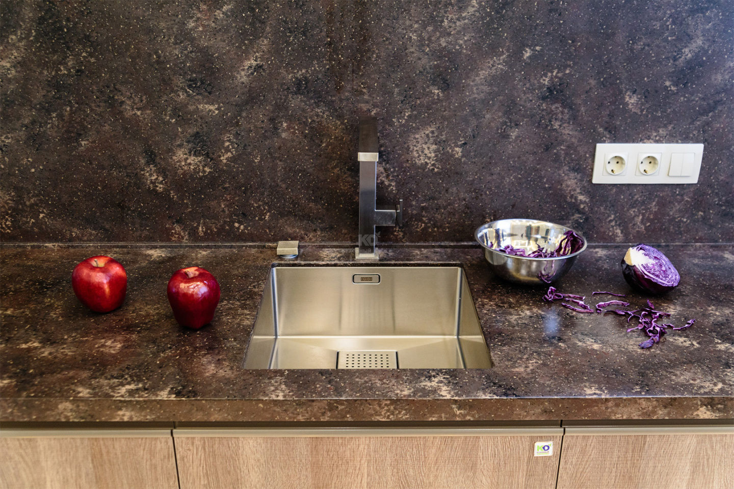 Обращаем Ваше внимание, что цена за погонный метр включает в себя: фасады выбранной категории, влагостойкую столешницу HPL (Германия) высокой прочности, корпуса ЛДСП Egger (Германия) с кромкой ABS, ящики с доводчиками , петли с доводчиками, ручки, алюминиевый поддон в стол под мойку, сушка (Италия), цоколь Volpato (Италия). Из расчета в размере 2400 мм.