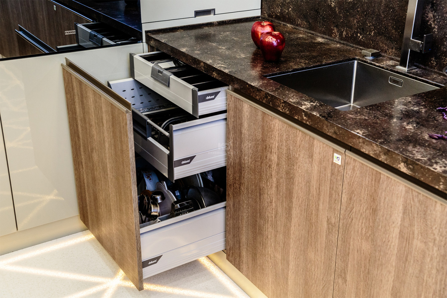 Максимально использовать пространство под столешницей позволяют ящики-тандембоксы для хранения полотенец или салфеток и отделениями для кухонной утвари. Верхнее отделение для вилок и ложек снабжено специальной ручкой-поводком. Если ее нажать, маленький ящик откроет доступ к двум ящикам, которые расположены под ним.