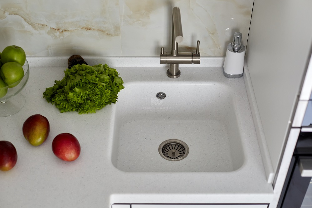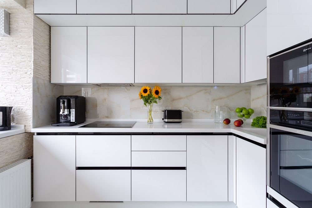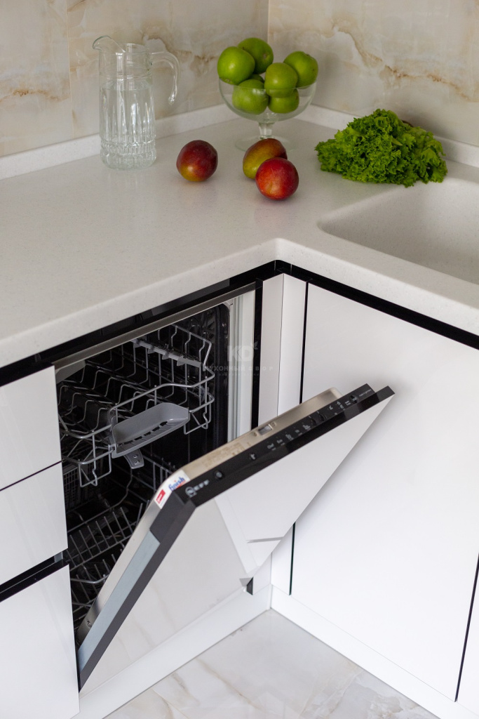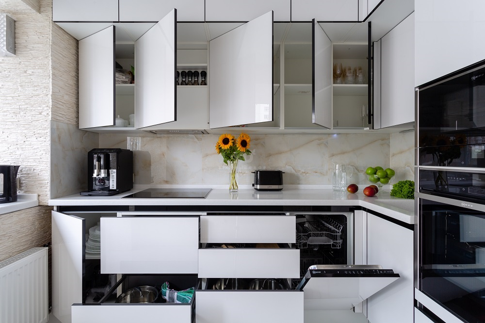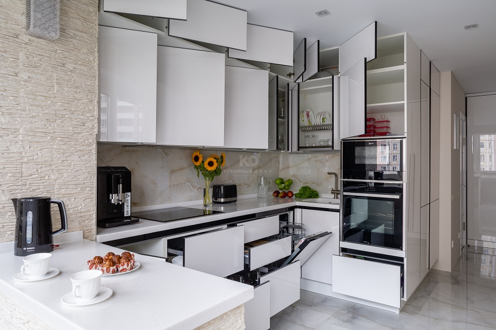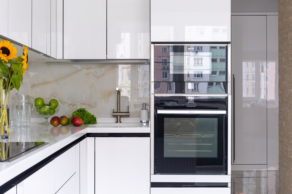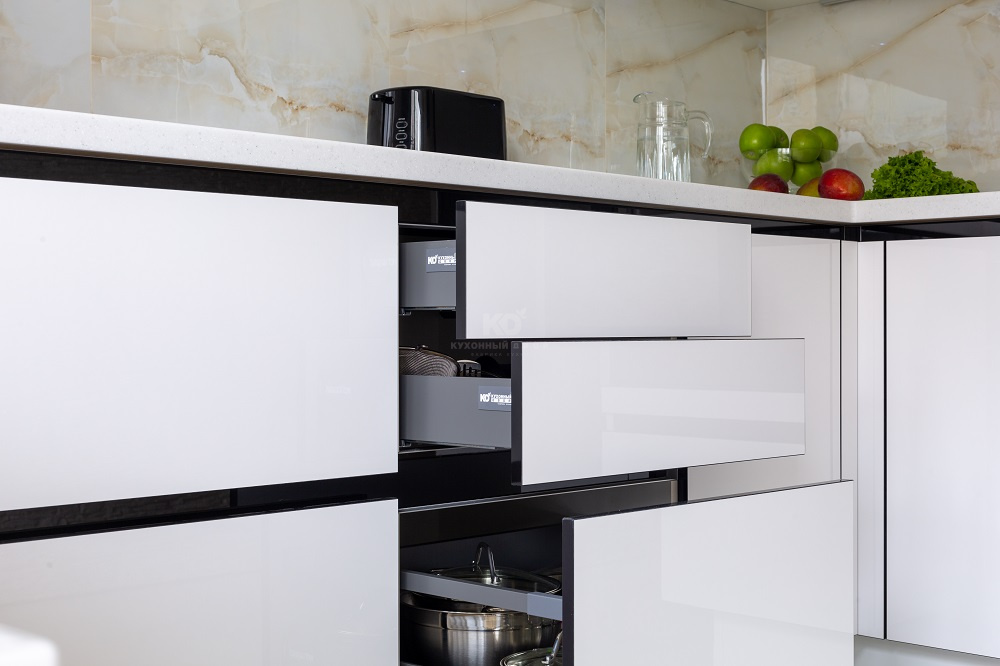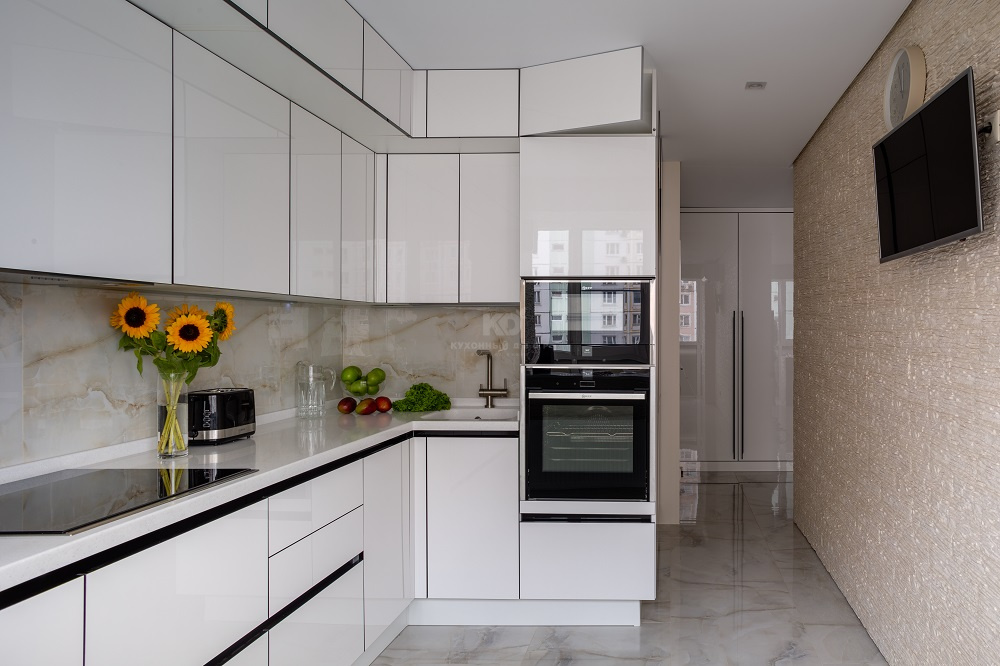 Цвета «Мондрианы» представляют собой великолепный контраст, где белому отведена главная роль, а чёрный выступает «вторым номером», искусно подчёркивая красоту модели. Чёрный цвет использован в ручках-профилях, а также в акцентах на торцевых частях фасадов. Он отлично вписывается в общую композицию, дополнительно выделяя фасады и перекликаясь со встроенной техникой. Кстати о последней: «Мондриана» оснащена полным набором современной техники, а СВЧ и духовой шкаф расположены на специально выверенной, удобной для хозяйки высоте. На этой кухне готовят с комфортом!
