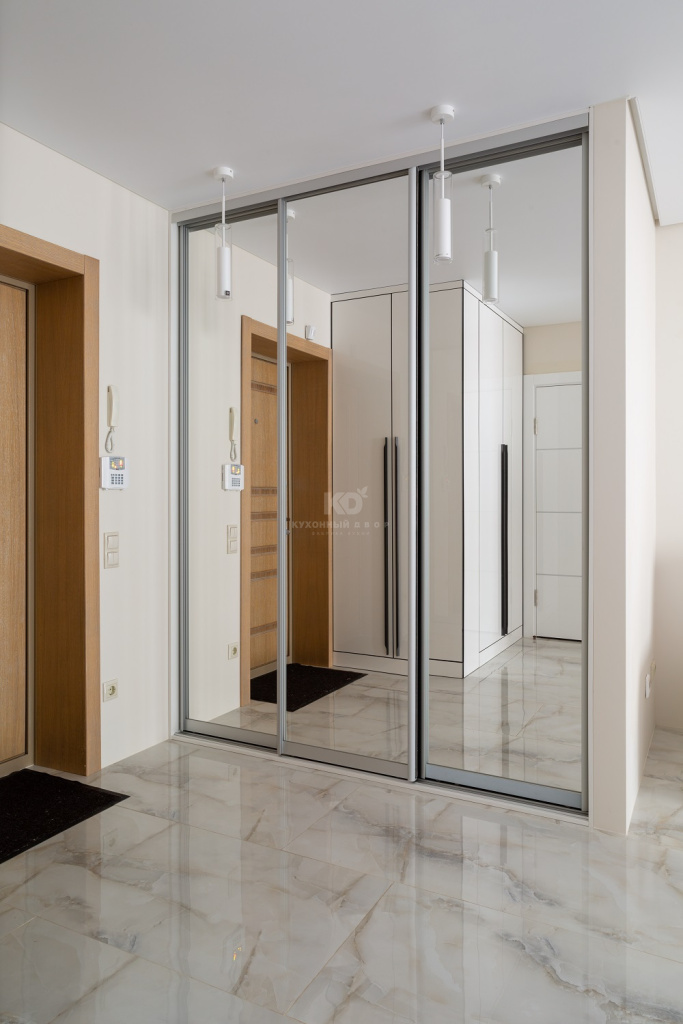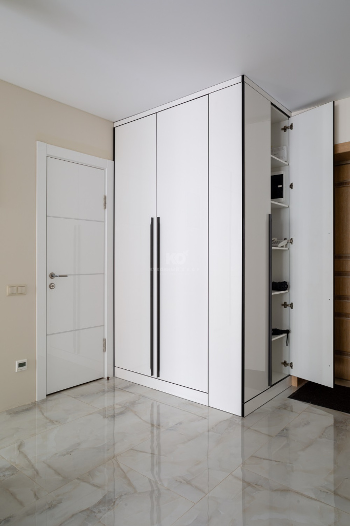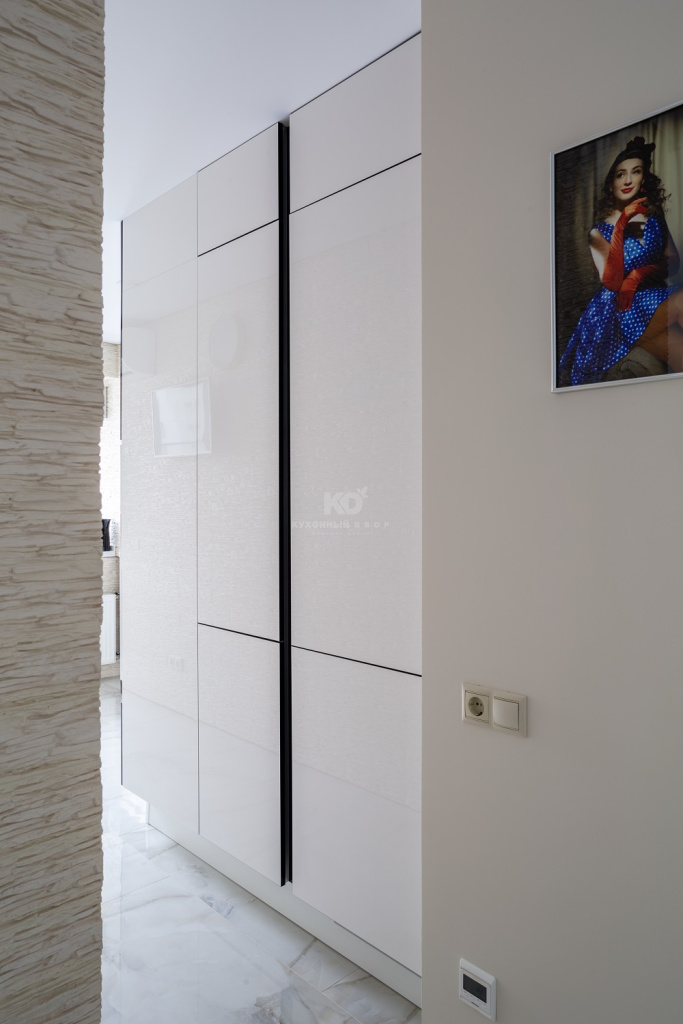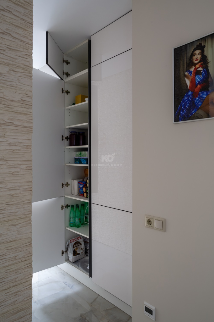 Форма здесь предельно лаконична. Фасады «Мондрианы» выполни из МДФ с покрытием «ультраглянец», обладающим высокой степенью светоотражения. Фасады не имеют видимых ручек и оснащены несколькими системами открывания. Одна из них – система «TIP-ON», позволяющая открывать ящики лёгким нажатием. Другая – эксклюзивная система «Space Line» от КД, в которой роль ручек выполняют скрытые профили.