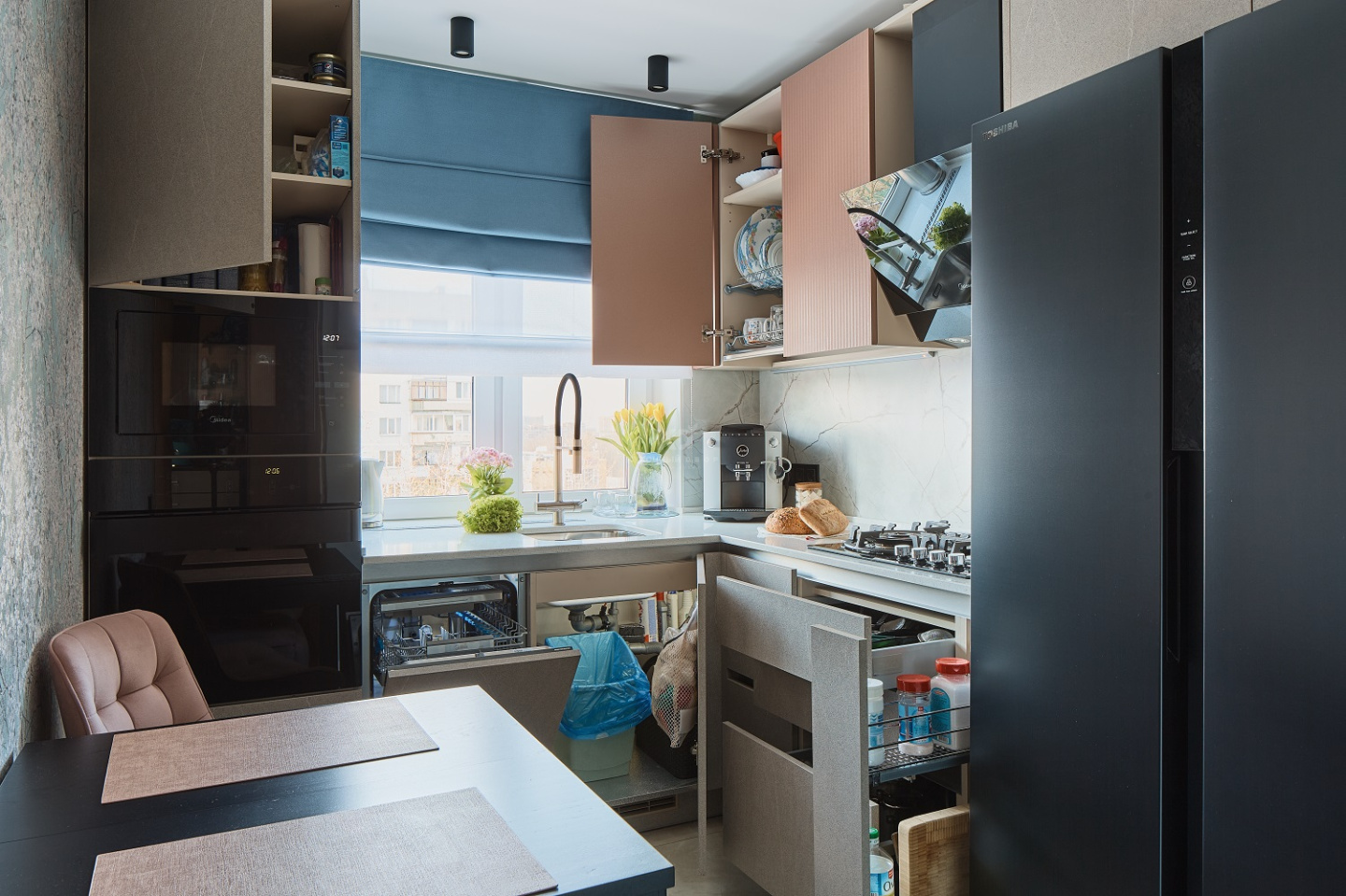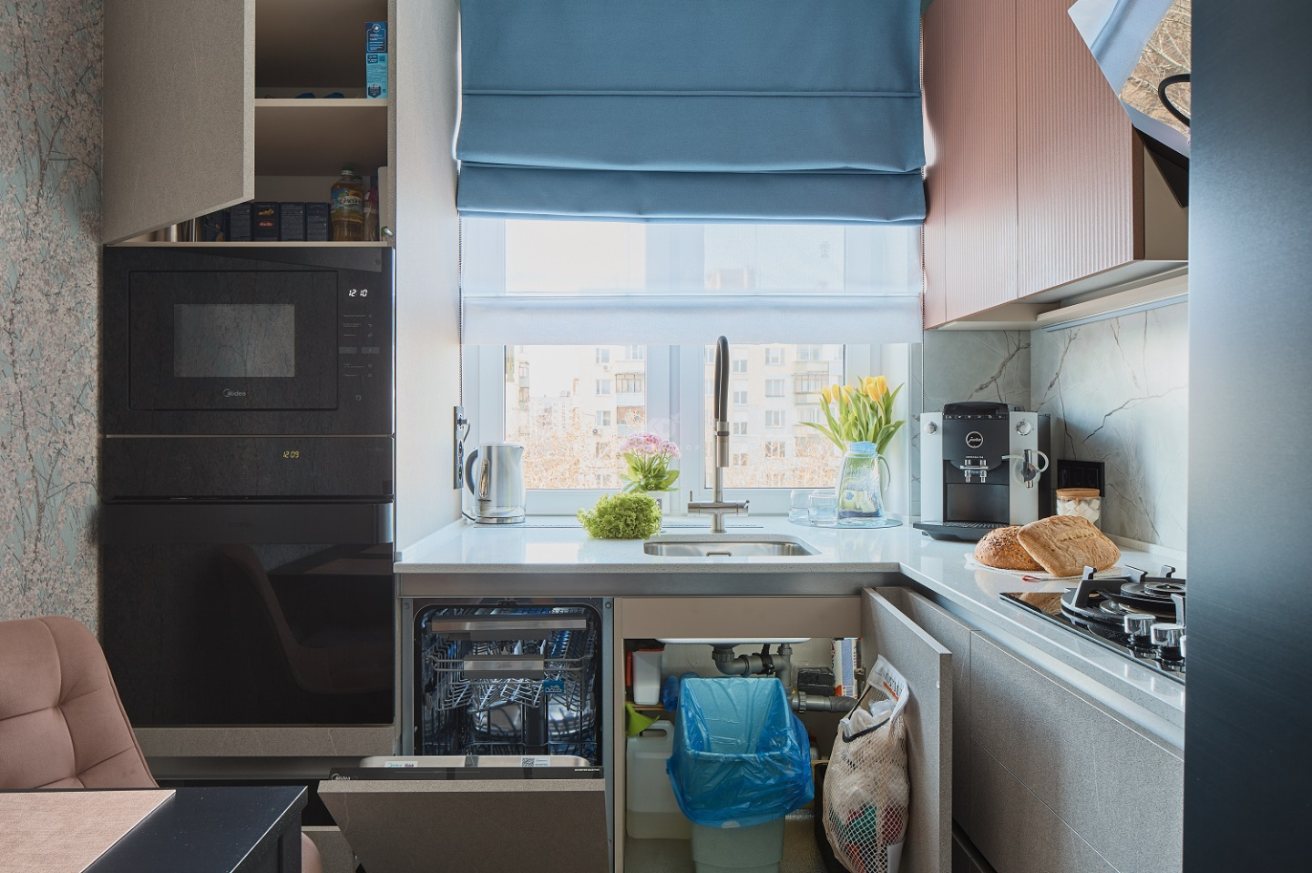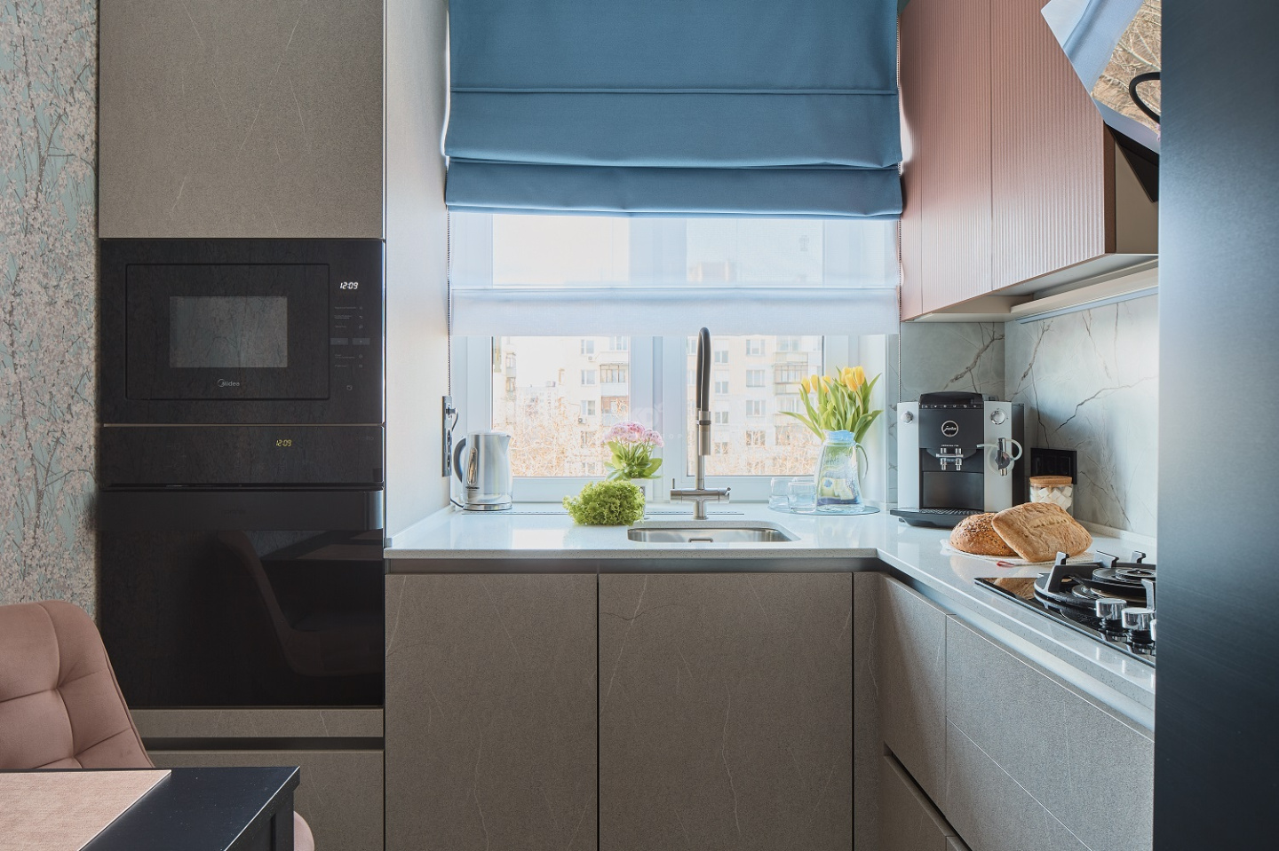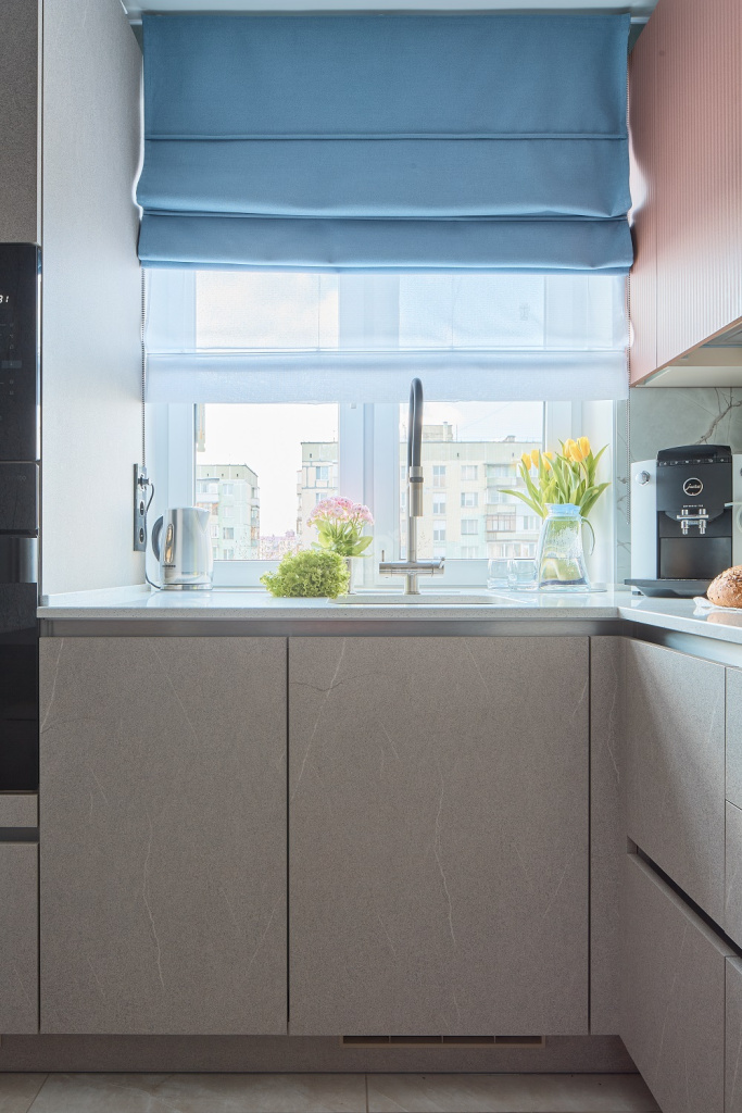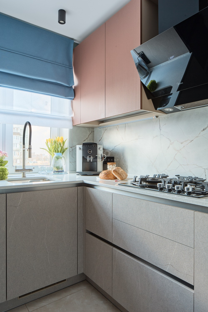 Фартук с фактурой мрамора перекликается с классикой греческой архитектуры, в которой мрамор — один из ключевых элементов. Он придаёт интерьеру воздушность, утончённость и ощущение простора. Черные акценты — духовой шкаф, вытяжка, холодильник и смеситель — создают контраст, подчёркивая геометрию пространства. Они — словно чёткие тени в полдень на ярком греческом солнце.