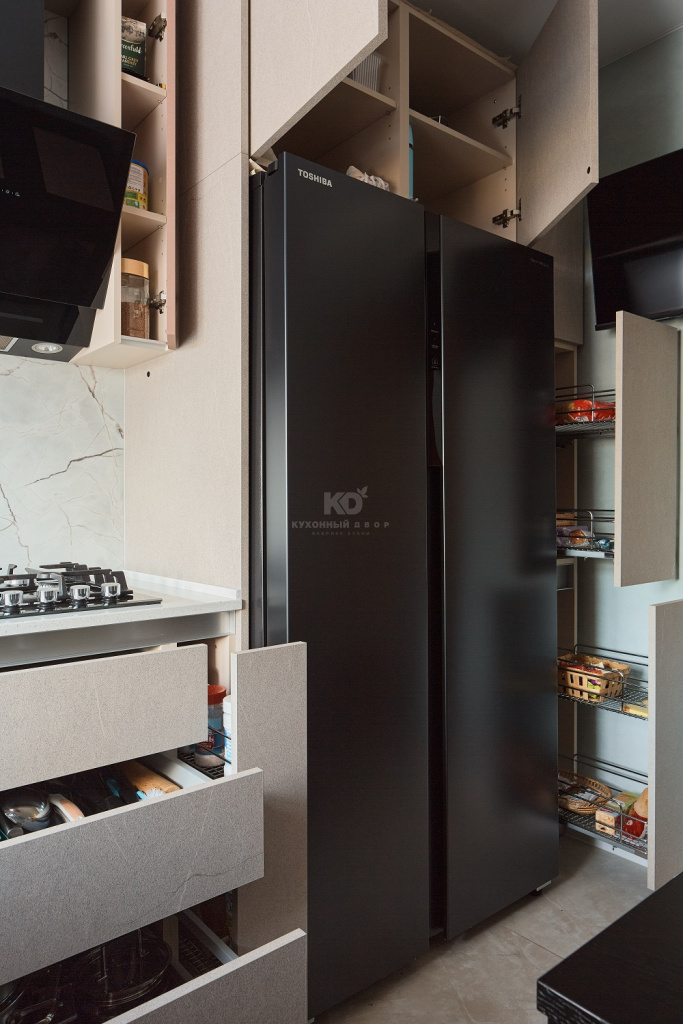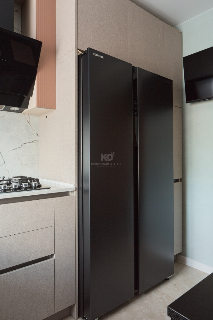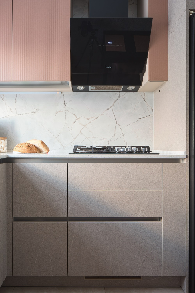 Нижние фасады песочного оттенка напоминают о скалистых пейзажах Санторини, о выветренных склонах и тёплых солнечных лучах, играющих на фактуре природного камня. Эти поверхности выглядят монолитно и благородно, при этом сохраняют мягкость благодаря матовой текстуре и тонким прожилкам, как у настоящего песчаника. Верхние медные шкафы добавляют южный акцент — эффект фрезеровки отсылает к колоннам древних афинских храмов, выгоревших на солнце.