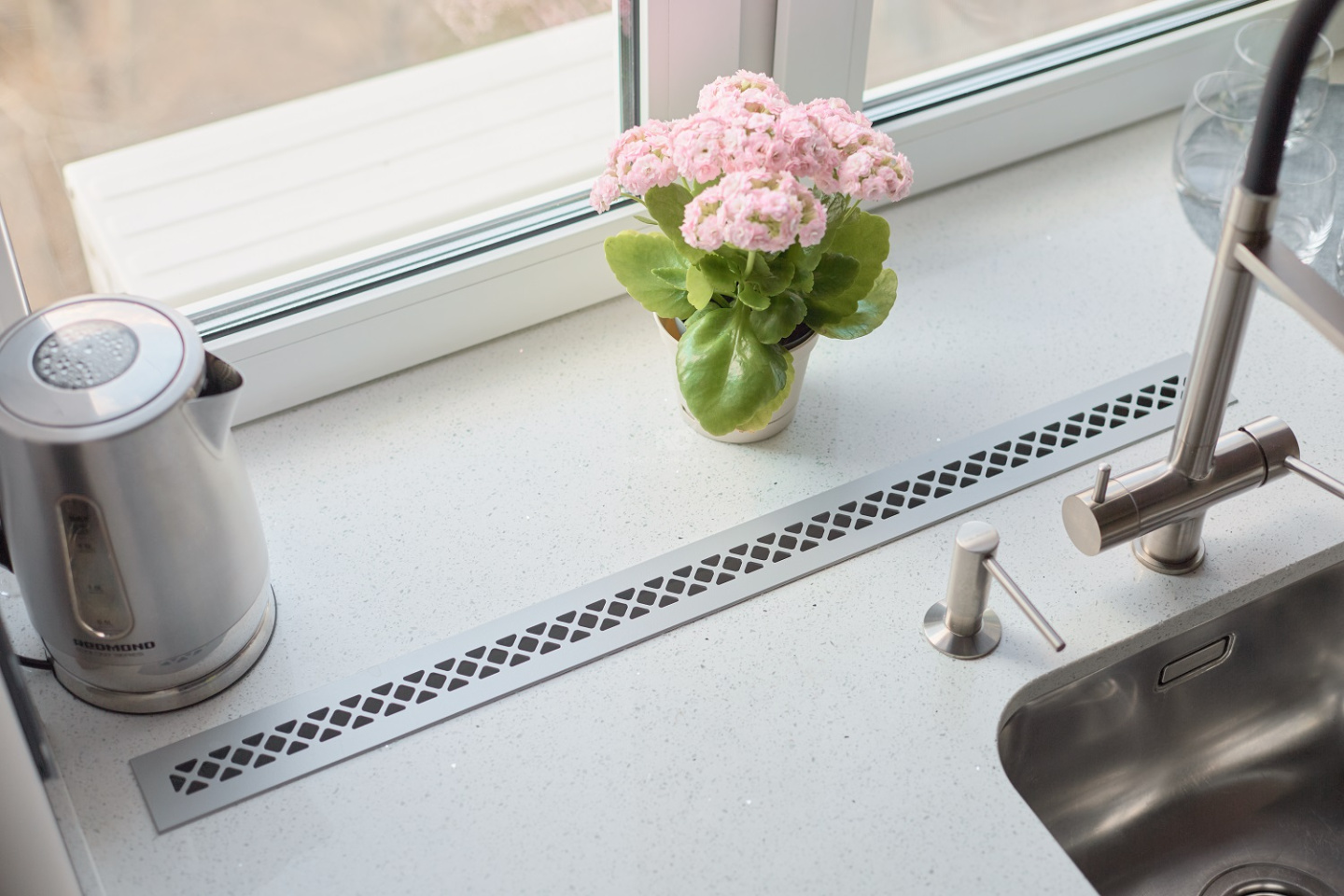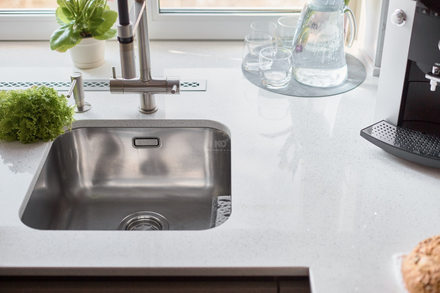 Рабочая поверхность из кварцевого агломерата не только функциональна, но и эстетична — прочная, гладкая, с мраморной текстурой, она подчёркивает природные мотивы кухни и при этом легко справляется с современными задачами.