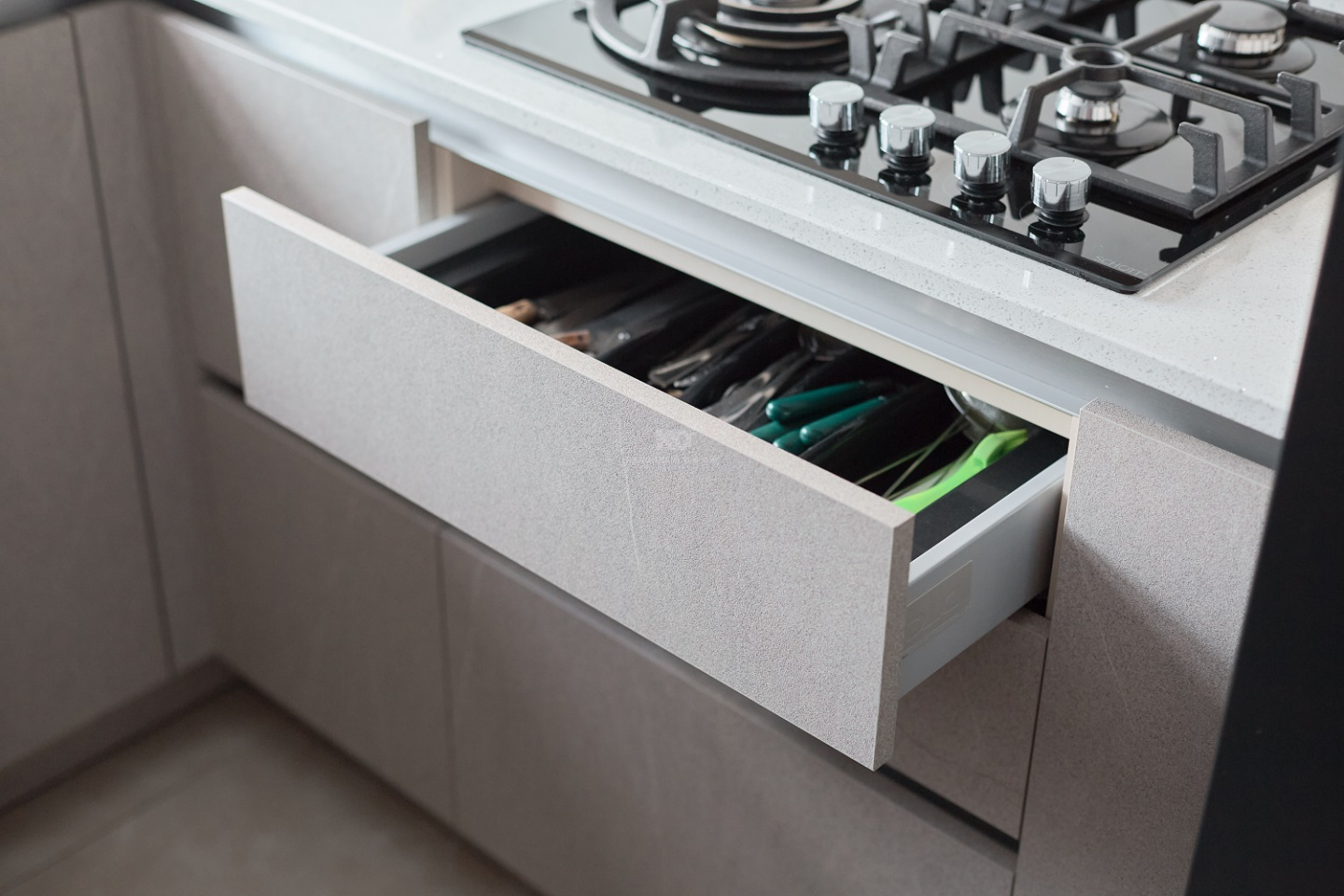 Чистота линий и визуальная легкость достигаются благодаря максимально удобной системе открывания без ручек Space Line — совсем без ручек. Только идеальные пропорции и чистые линии. Вся кухня оснащена фурнитурой DTC, обеспечивающей плавный ход и более 80 000 циклов открывания и закрывания.