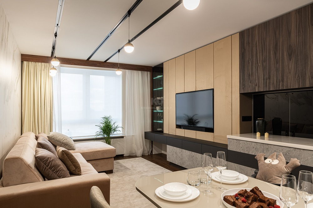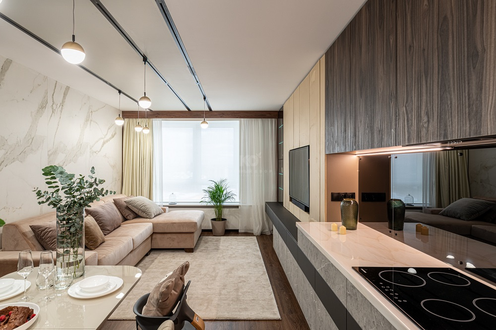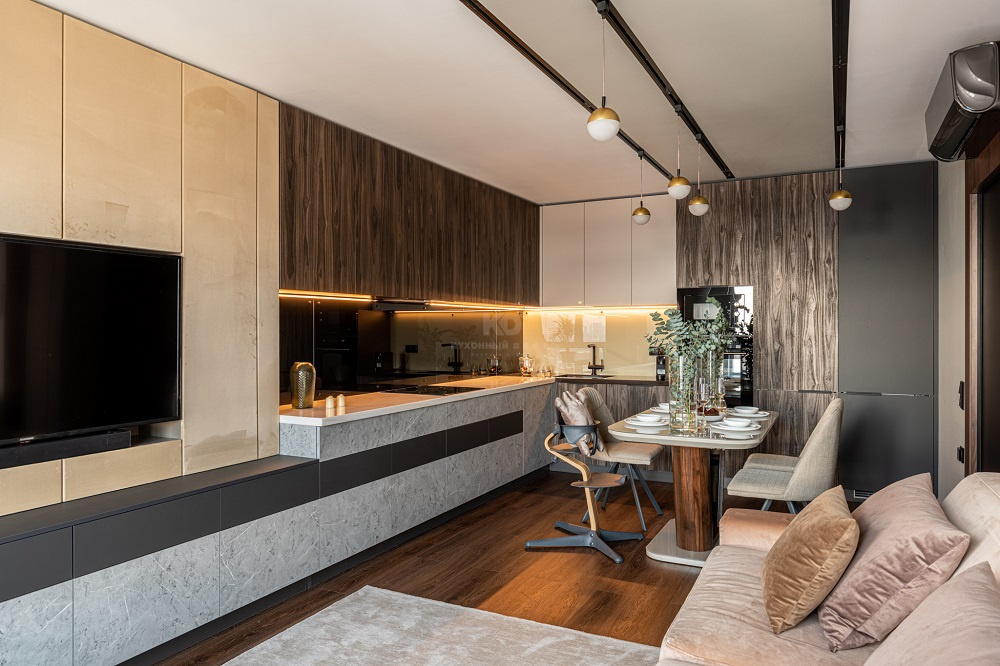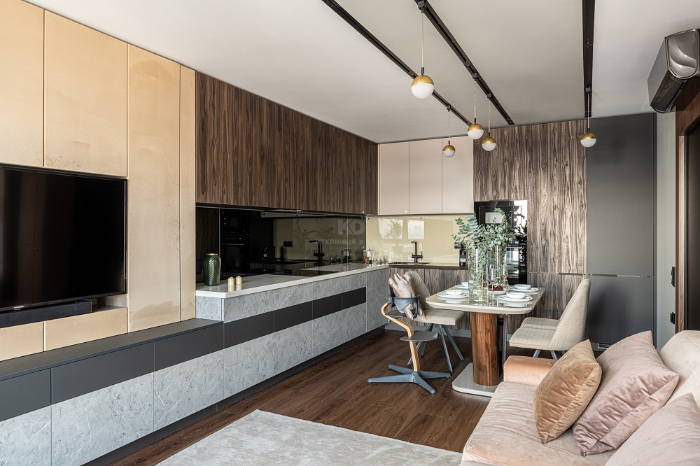 Ваша квартира находится в городской высотке, а за окном – урбанистический пейзаж? Тогда разнообразие фактур на кухне – то, что доктор прописал! Кстати, о докторах: именно для них в рамках передачи «Квартирный Вопрос» создан этот впечатляющий дизайн-проект. Екатерина – врач-кардиолог, Константин – сердечно-сосудистый хирург, а их сыновья Миша и Дима – большие мастера лечить любую печаль весёлыми играми! В этой семье каждый друг друга любит, и с делами сердечными всё обстоит замечательно! Что не хватает для полного счастья? Правильно, отличной кухни-гостиной! И «Кухонный Двор» создал именно такую!