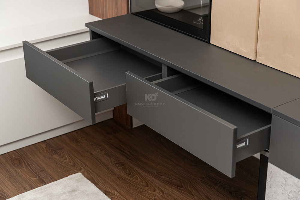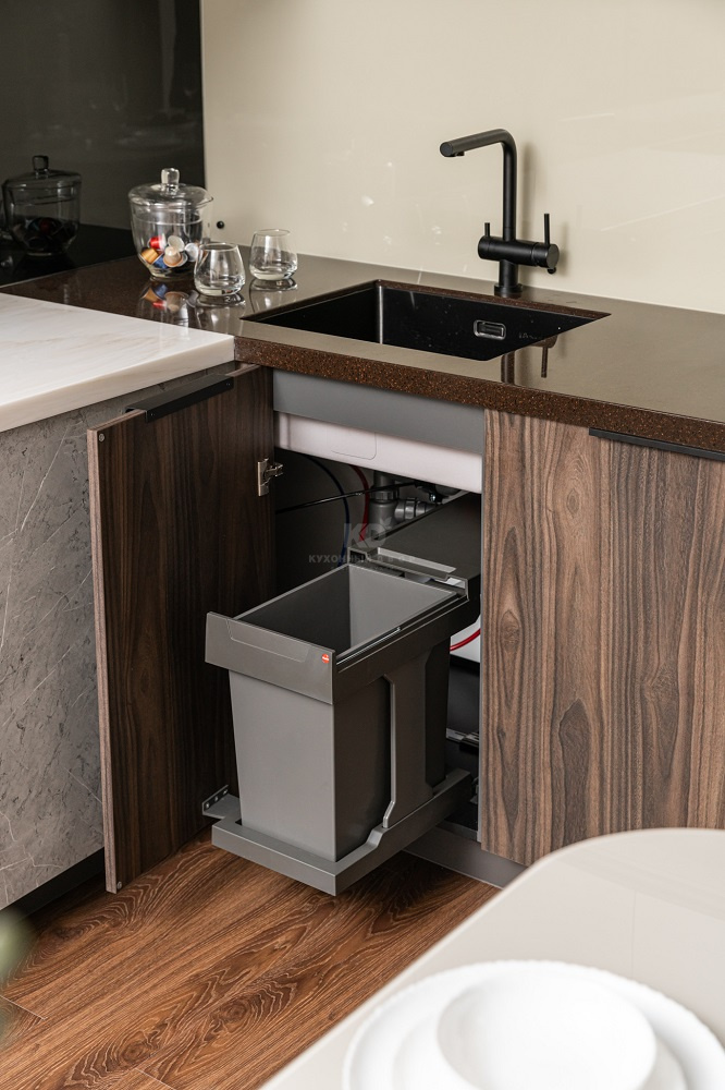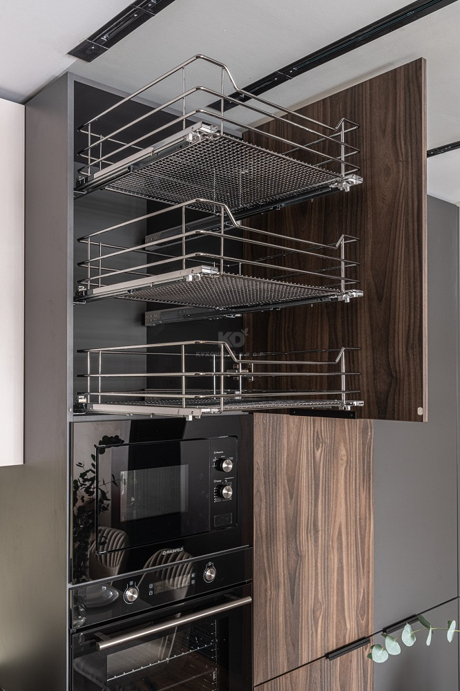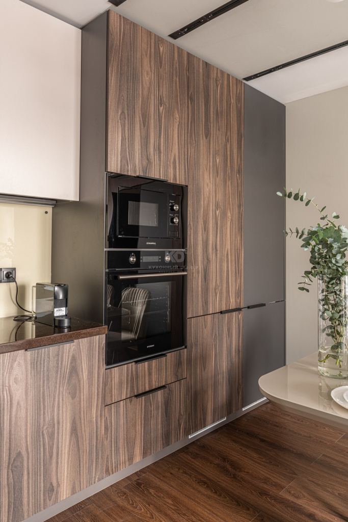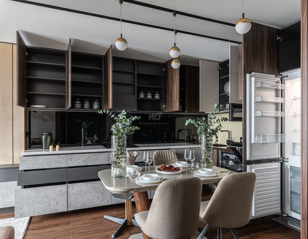 Столь внушительный гарнитур просто обязан иметь достойное оснащение. Обязан, и имеет! Здесь в наличии: мощная скрытая вытяжка, индукционная варочная панель, ПММ на 14 комплектов посуды, духовой шкаф объёмом 82 л., СВЧ на удобной высоте и целых два полноразмерных холодильника! Также в распоряжении хозяев мембранная система фильтрации воды, выкатные сетки, бесчисленное множество полезных аксессуаров и колоссальный объём внутреннего пространства. Готовят здесь явно с удовольствием, а наслаждаются едой – с улыбками и комфортом!