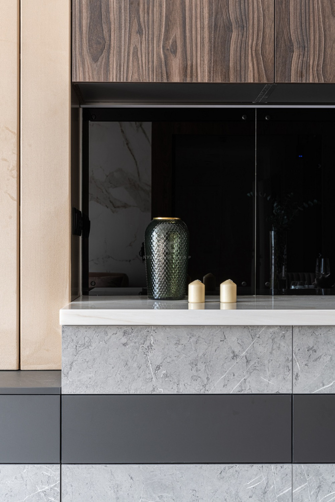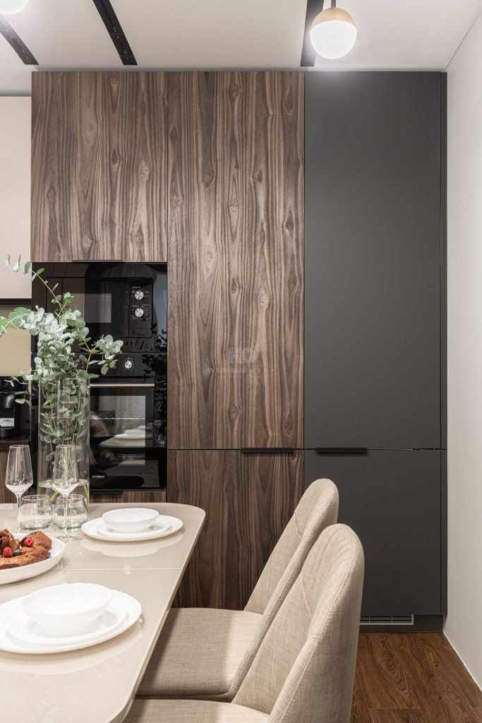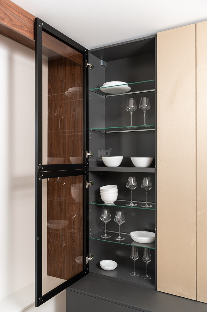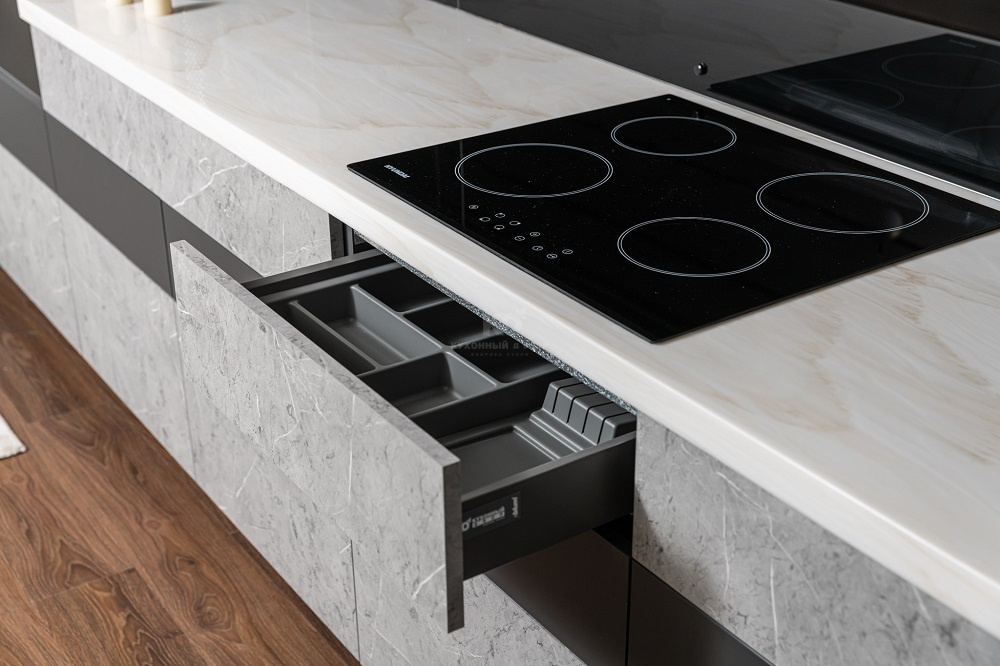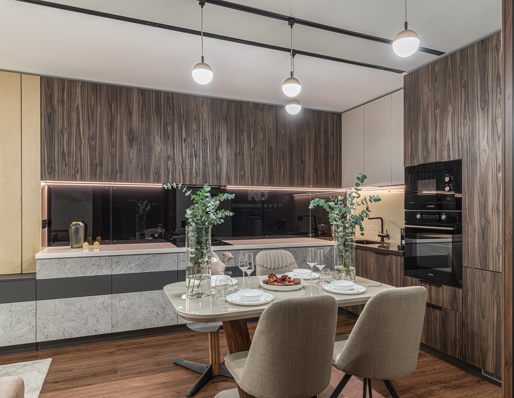Столь внушительный гарнитур просто обязан иметь достойное оснащение. Обязан, и имеет! Здесь в наличии: мощная скрытая вытяжка, индукционная варочная панель, ПММ на 14 комплектов посуды, духовой шкаф объёмом 82 л., СВЧ на удобной высоте и целых два полноразмерных холодильника! Также в распоряжении хозяев мембранная система фильтрации воды, выкатные сетки, бесчисленное множество полезных аксессуаров и колоссальный объём внутреннего пространства. Готовят здесь явно с удовольствием, а наслаждаются едой – с улыбками и комфортом!