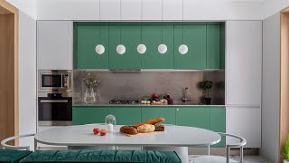 Сначала о кухне! Выверенная форма здесь задаёт тон, а цвета и материалы создают настроение. В кухне использована стильная комбинация серого и тёмно-зелёного цветов. Первый – отсылка к северному спокойствию, второй – к южной теплоте. Это редкое цветовое сочетание смотрится удивительно свежо! Гарнитур оснащён полным комплектом встраиваемой техники «Haier», а также огромным количеством аксессуаров и систем хранения. Здесь есть: большие ящики с разделителями внутреннего пространства «Orga-Line», система для хранения крупной посуды, комплекс выкатных сеток, ящик для хранения столовых приборов с системой «ручка+поводок», выдвижная корзина для хозяйственных принадлежностей, мусорное ведро с функцией автоматического открывания и многое-многое другое.