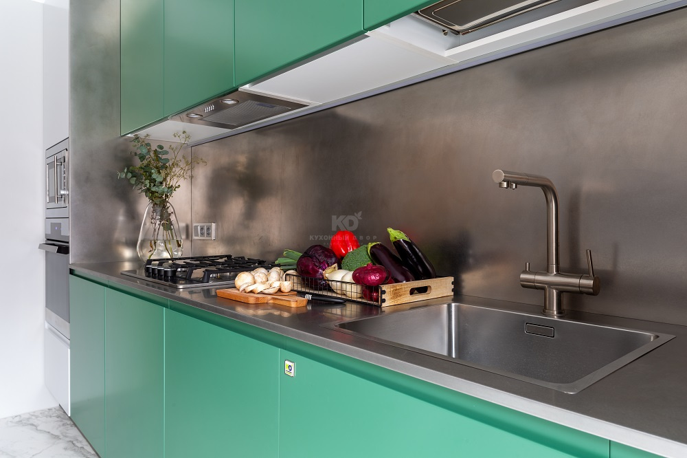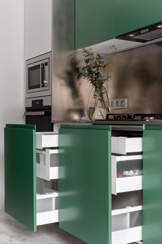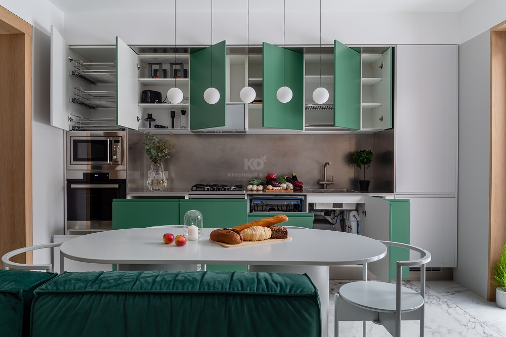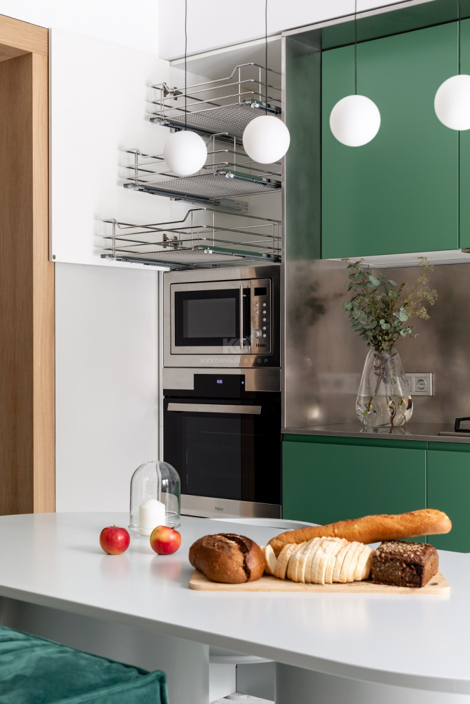 Сначала о кухне! Выверенная форма здесь задаёт тон, а цвета и материалы создают настроение. В кухне использована стильная комбинация серого и тёмно-зелёного цветов. Первый – отсылка к северному спокойствию, второй – к южной теплоте. Это редкое цветовое сочетание смотрится удивительно свежо! Гарнитур оснащён полным комплектом встраиваемой техники «Haier», а также огромным количеством аксессуаров и систем хранения. Здесь есть: большие ящики с разделителями внутреннего пространства «Orga-Line», система для хранения крупной посуды, комплекс выкатных сеток, ящик для хранения столовых приборов с системой «ручка+поводок», выдвижная корзина для хозяйственных принадлежностей, мусорное ведро с функцией автоматического открывания и многое-многое другое.